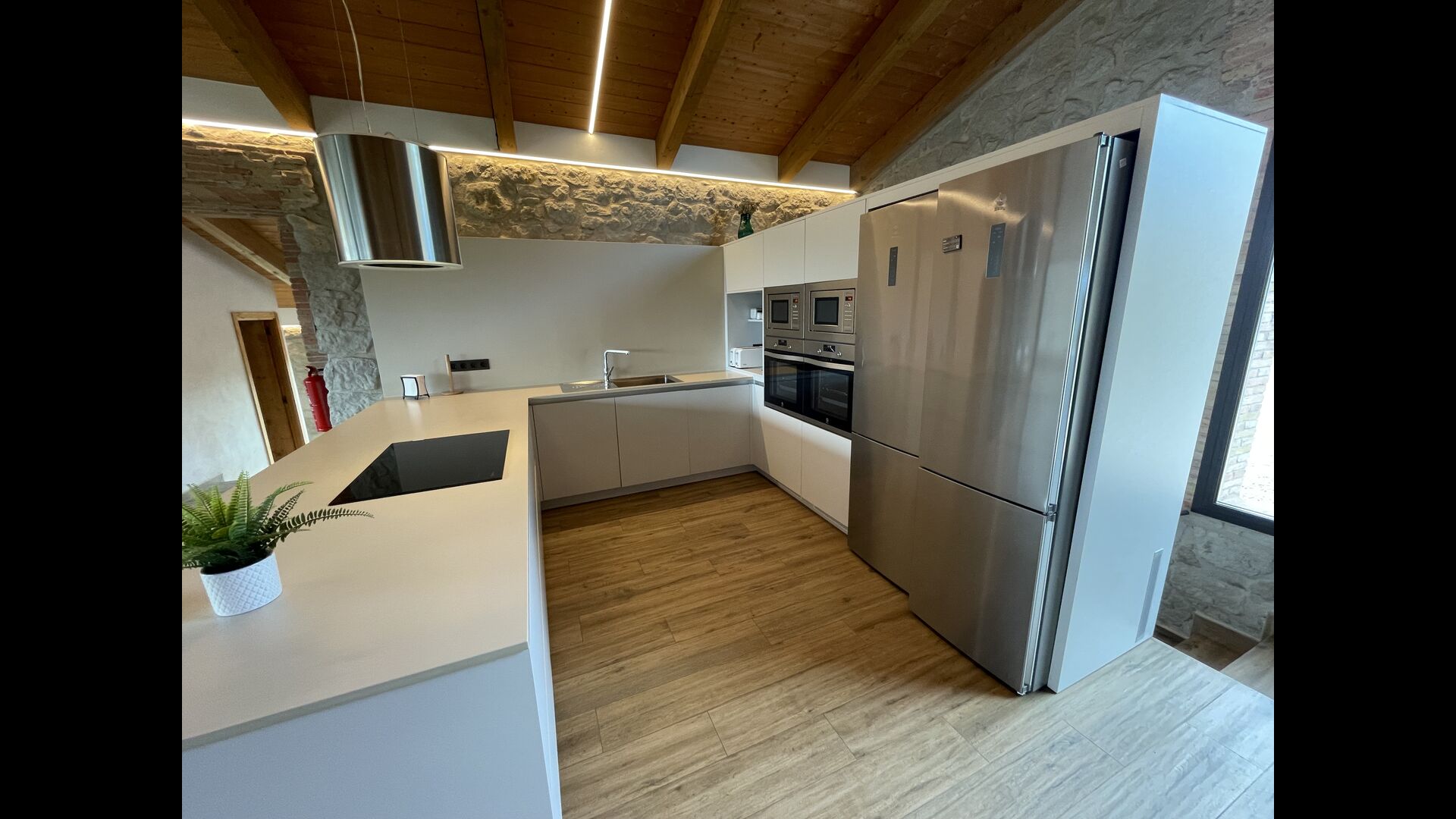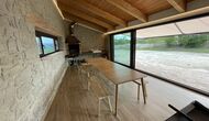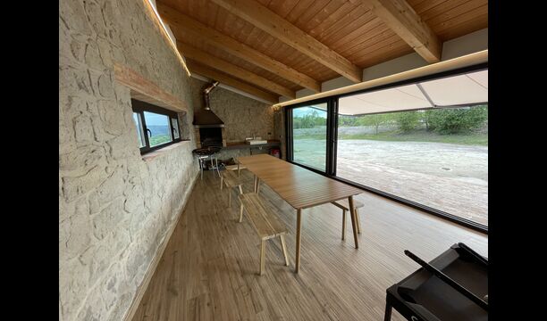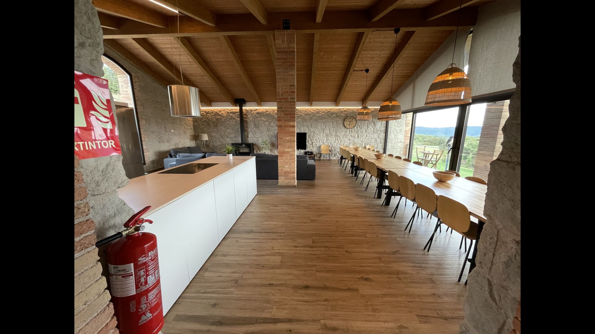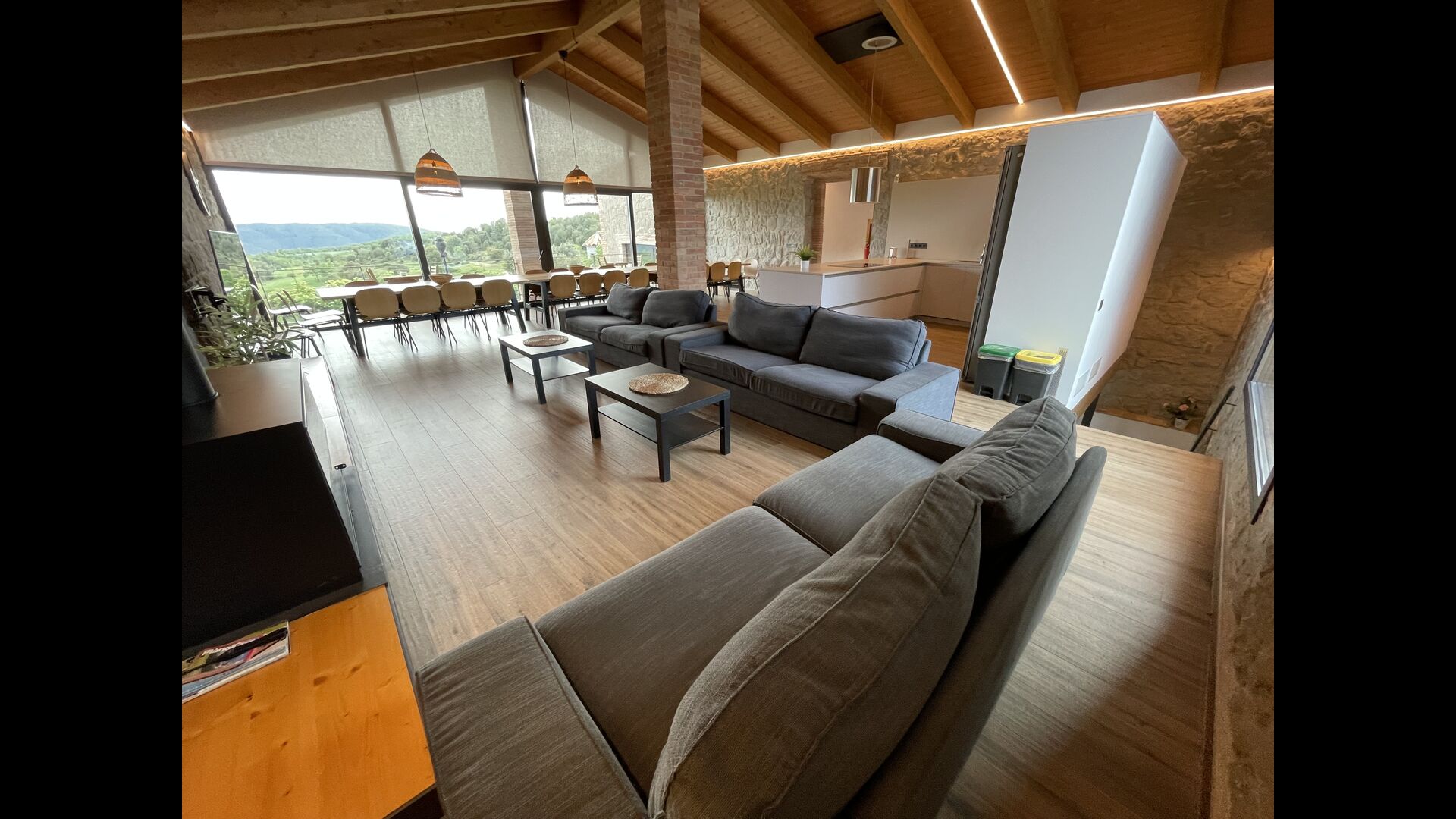 Els avetst pises una mica elevada sobre la planta baixa. En entrar, trobareu unahabitació gran, espaiosa i acollidora, que fusiona una cuina de qualitat de luxe a la vostra esquerra amb 2 neveres, forns, fogons strong> i tots els altres accessoris, estris i utilitats aptes per a una cuina moderna i exquisida. A la teva dreta hi ha una taula de sopar molt gran, amb capacitat per a moltes persones. Amb un conjunt de finestres de terra a sostre amb vistes al jardí a sota, tindreu una vista excel·lent mentre sopeu amb amics i familiars, jugueu a cartes/jocs de taula o gaudiu. converses nocturnes sobre una ampolla de vi català deliciós. A més, si voleu gaudir de les vistes a l'aire lliure, també hi ha una meravellosa terrassa de grans dimensions, amb petites taules i cadires. Per últim, però no menys important, l'habitació també té un racó de sofà gran i còmode amb un televisor i una llar de foc. Si vols descansar les cames o gaudir d'una bona pel·lícula amb els teus companys de viatge, aquest és el lloc perfecte per fer-ho.
