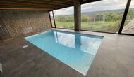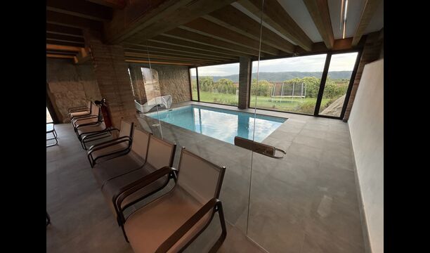Baixant les escales des de la planta baixa cap al soterrani es revelarà una zona d'estar amb diverses cadires i una paret. TV de pantalla plana muntat. Just darrere del saló hi ha la piscina coberta – les dues zones separades per una paret de vidre. La piscina està climatitzada i té 6 metres de llargada i 3 metres d'amplada. A part del vidre que separa la longue i la zona de la piscina, també hi haamplis finestrals de terra a sostre a l'habitació que donen al jardí de la propietat, que us permeten mirar cap a fora. sobre el camp de futbol i el meravellós entorn proper i més enllà des de la comoditat de les relaxants aigües de la piscina.