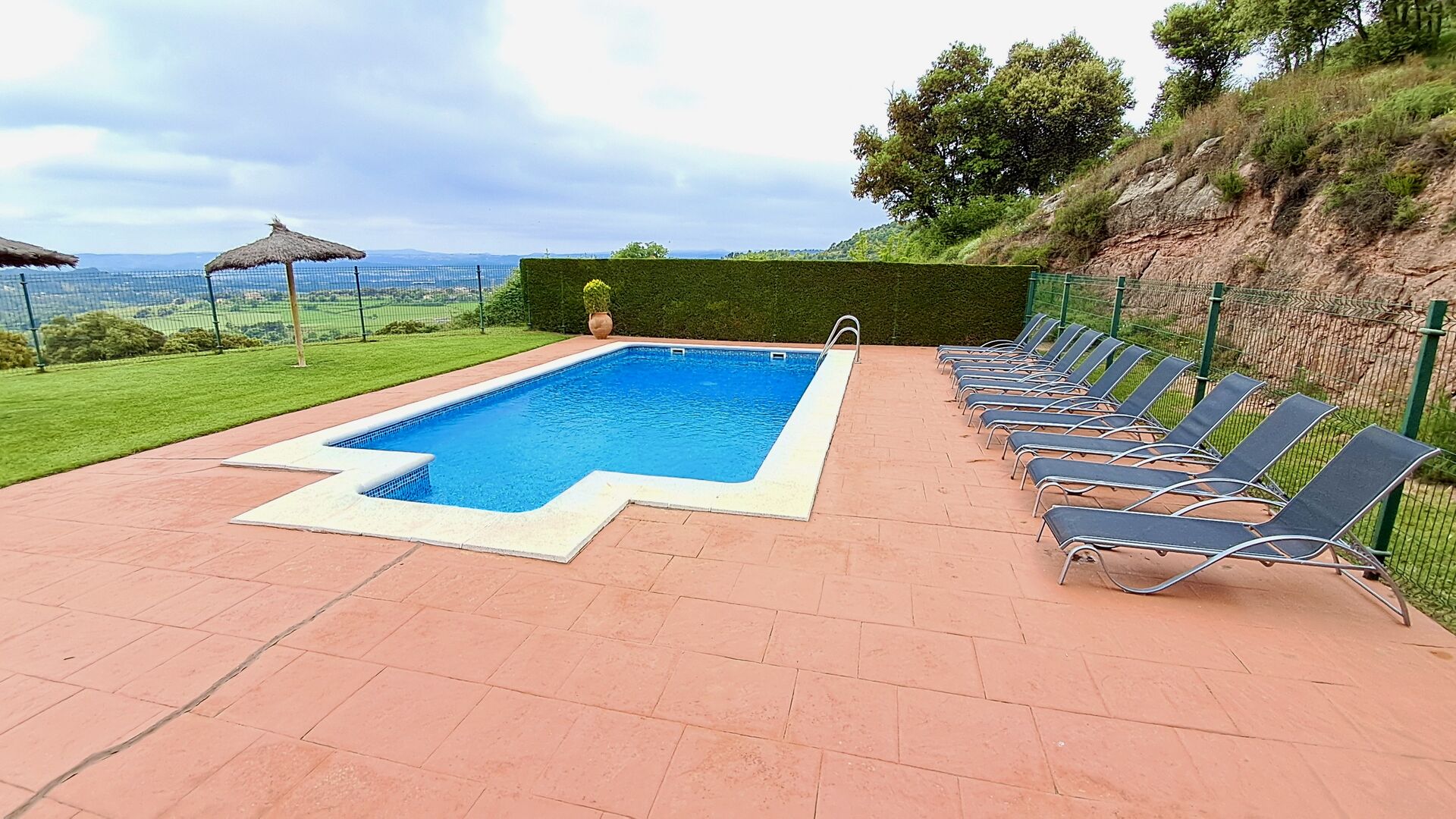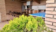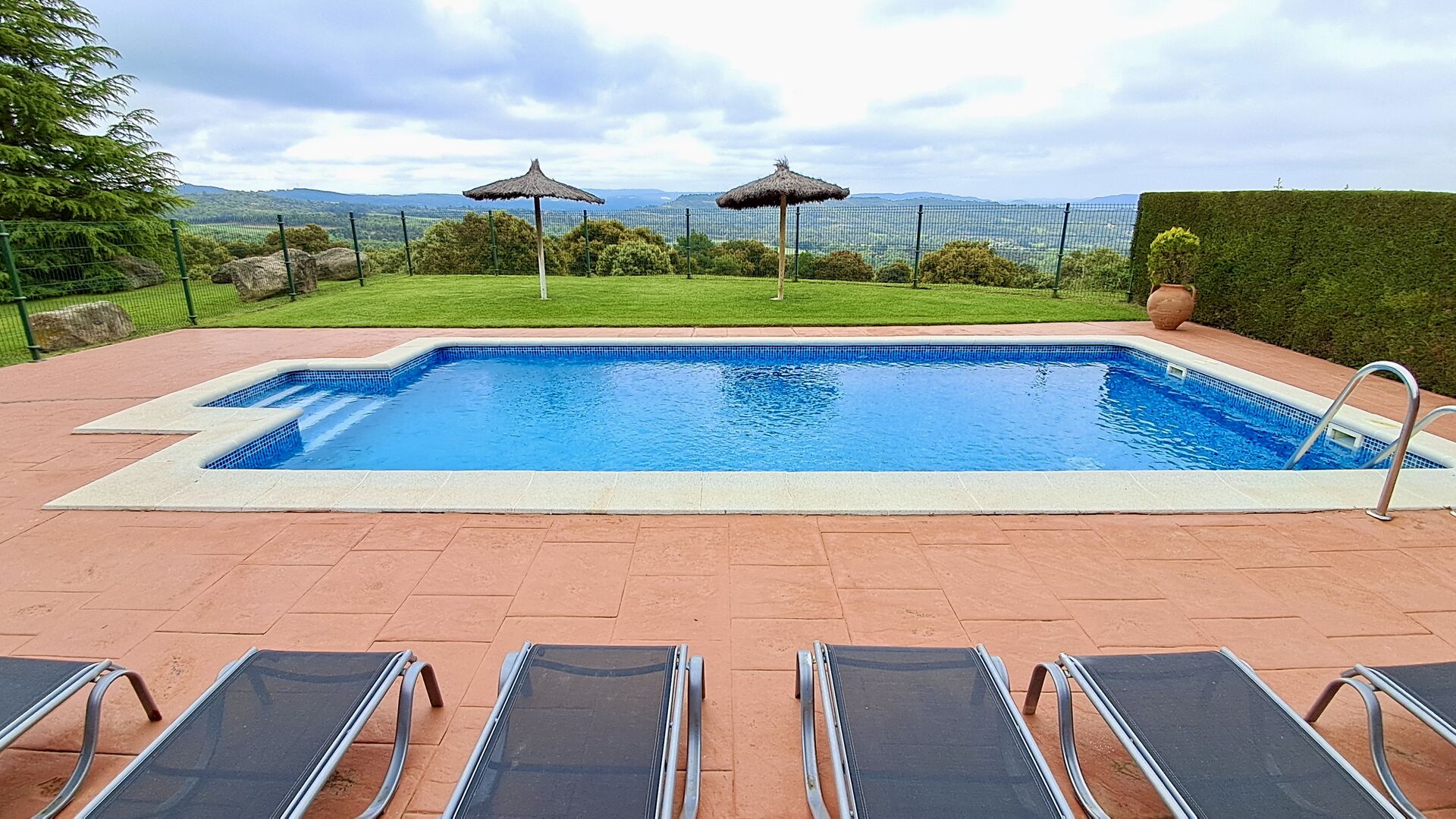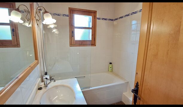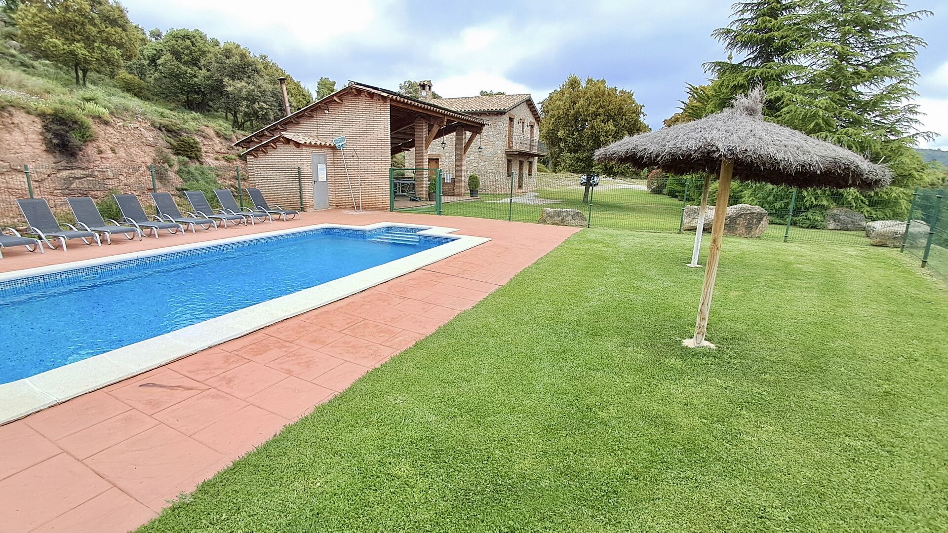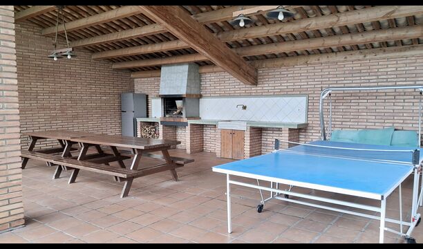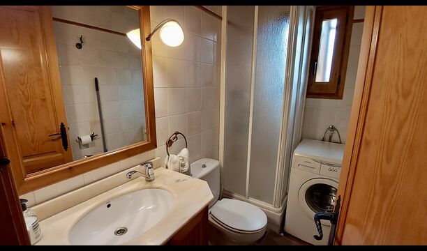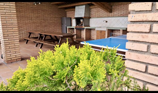A la planta baixa hi ha una àmplia sala d'estar, on hi ha una acollidora zona d'estar amb televisor i llar de foc. Connectat a aquest hi ha un menjador i una *cuina moderna*, que té rentaplats, microones, nevera i congelador. A més, a la planta inferior hi ha una *habitació doble* amb bany amb dutxa. Si pugeu les escales fins al primer pis, trobareu quatre habitacions, dues de les quals tenen accés a un balcó compartit. Des d'aquí podeu gaudir de la *posta de sol* al vespre o de la *sortida del sol* al matí. També hi ha un bany amb banyera en aquesta planta. *Destaquen especialment les instal·lacions exteriors*. La més gran i, sens dubte, la preferida entre els nens és, per descomptat, *la piscina*, que té una mida de *32 m2*. Està tancada, de manera que podeu decidir quan els nens més petits poden utilitzar la piscina. A més, podeu observar els nens a la piscina des del balcó. L'enorme *pati cobert* està just al costat de la piscina. Aquí hi ha una *taula de menjador exterior* i una barbacoa*. Aquí podeu cuinar i gaudir de menjars casolans. Aquest serà probablement el punt de trobada natural de les vacances. També hi ha ping-pong.