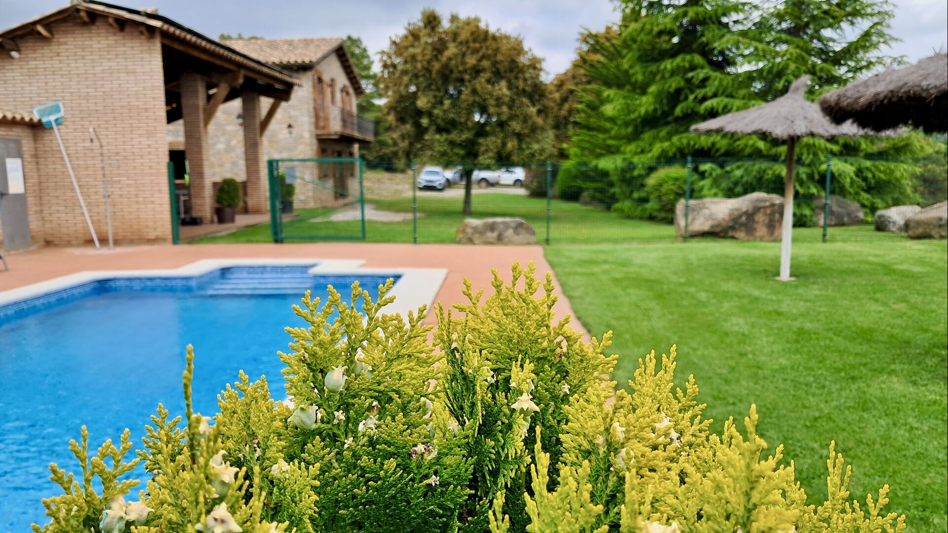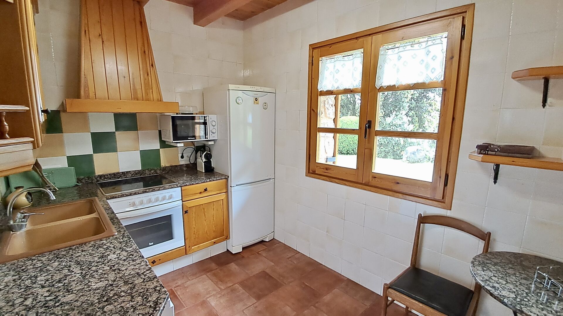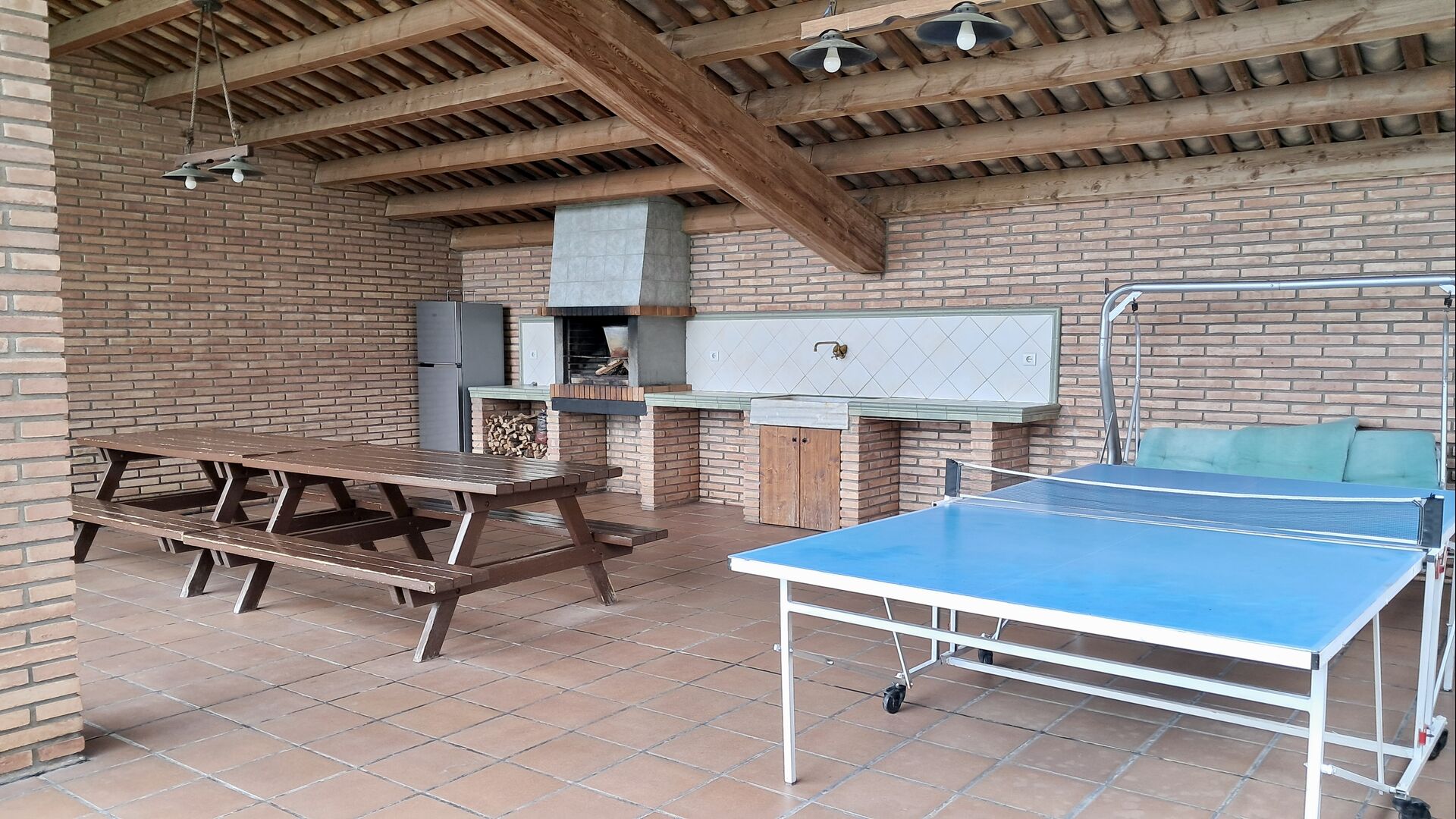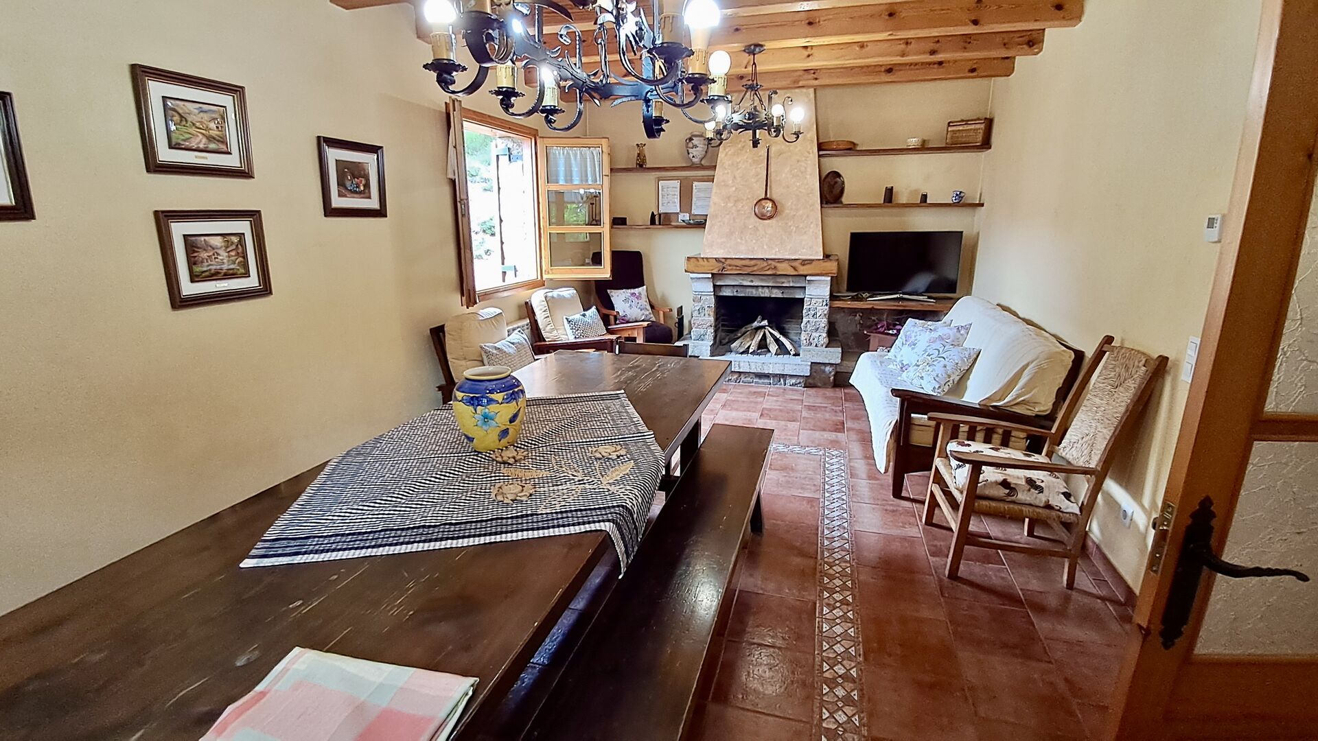 A la planta baixa hi ha una àmplia sala d'estar, on hi ha una acollidora zona d'estar amb televisor i llar de foc. Connectat a aquest hi ha un menjador i una *cuina moderna*, que té rentaplats, microones, nevera i congelador. A més, a la planta inferior hi ha una *habitació doble* amb bany amb dutxa. Si pugeu les escales fins al primer pis, trobareu quatre habitacions, dues de les quals tenen accés a un balcó compartit. Des d'aquí podeu gaudir de la *posta de sol* al vespre o de la *sortida del sol* al matí. També hi ha un bany amb banyera en aquesta planta. *Destaquen especialment les instal·lacions exteriors*. La més gran i, sens dubte, la preferida entre els nens és, per descomptat, *la piscina*, que té una mida de *32 m2*. Està tancada, de manera que podeu decidir quan els nens més petits poden utilitzar la piscina. A més, podeu observar els nens a la piscina des del balcó. L'enorme *pati cobert* està just al costat de la piscina. Aquí hi ha una *taula de menjador exterior* i una barbacoa*. Aquí podeu cuinar i gaudir de menjars casolans. Aquest serà probablement el punt de trobada natural de les vacances. També hi ha ping-pong.