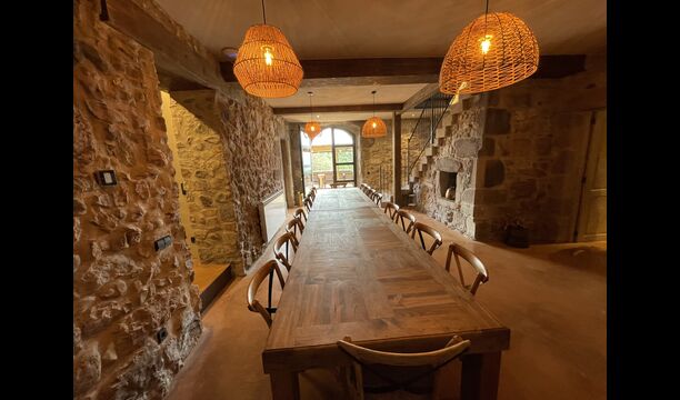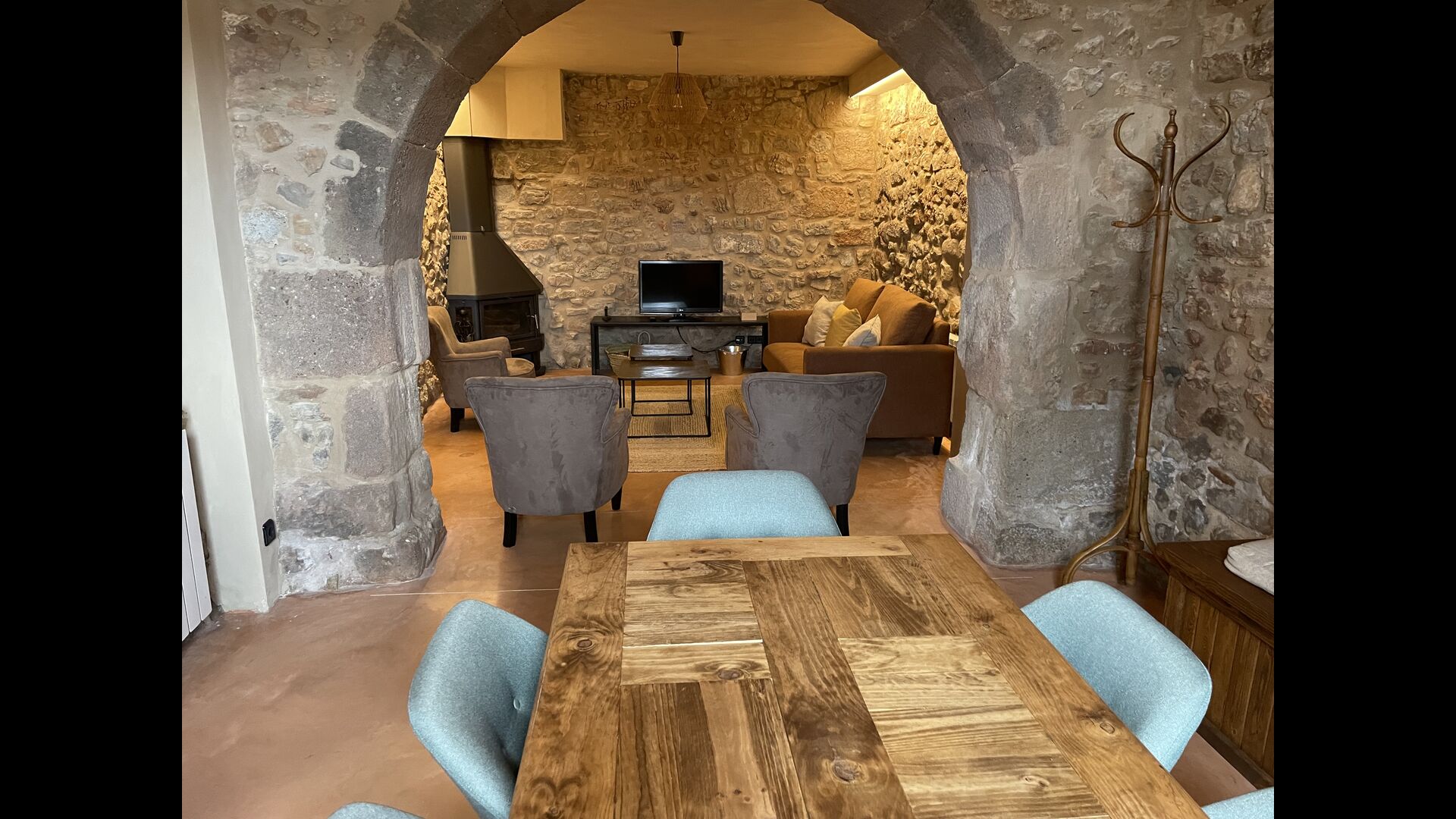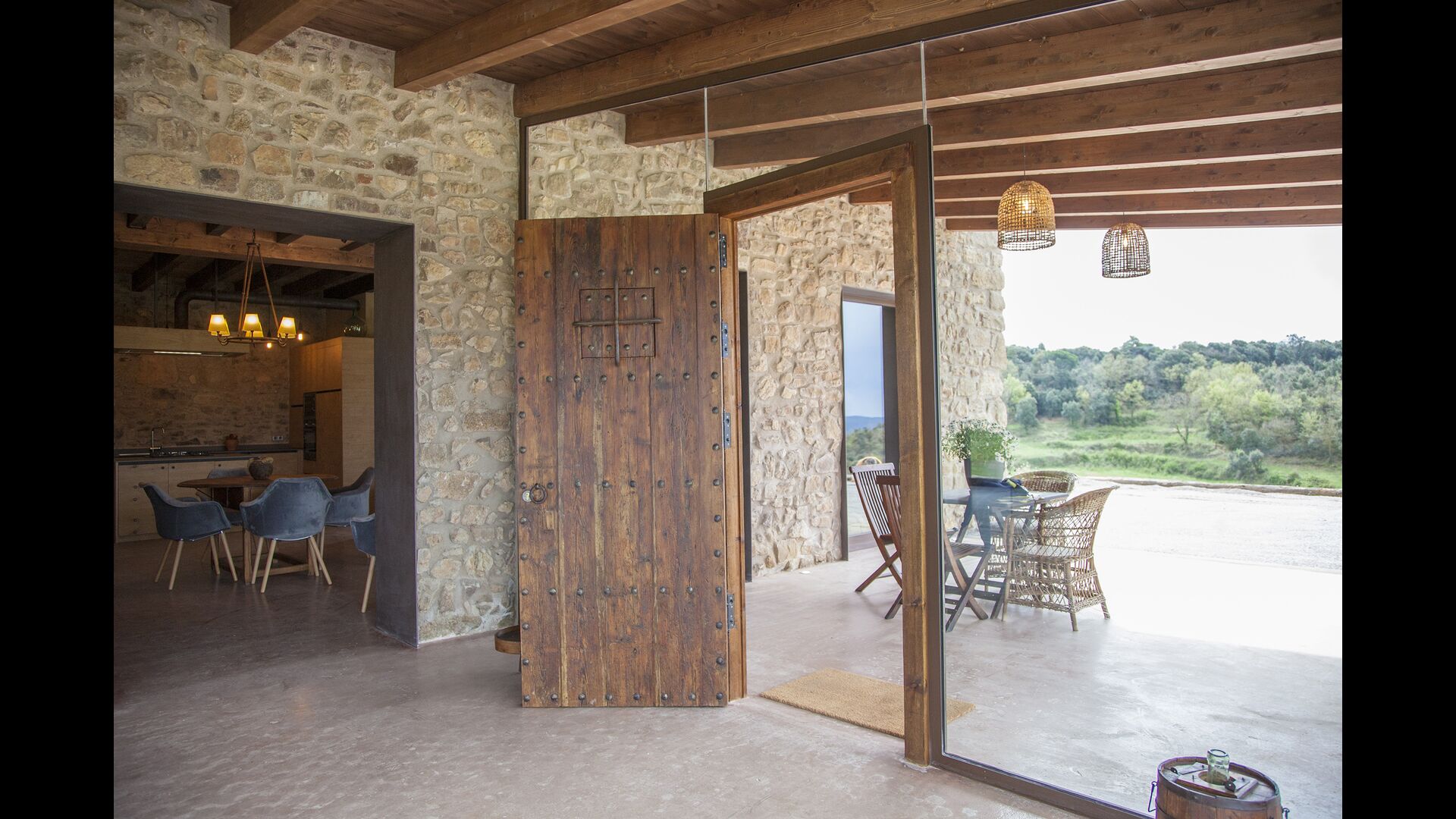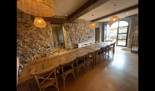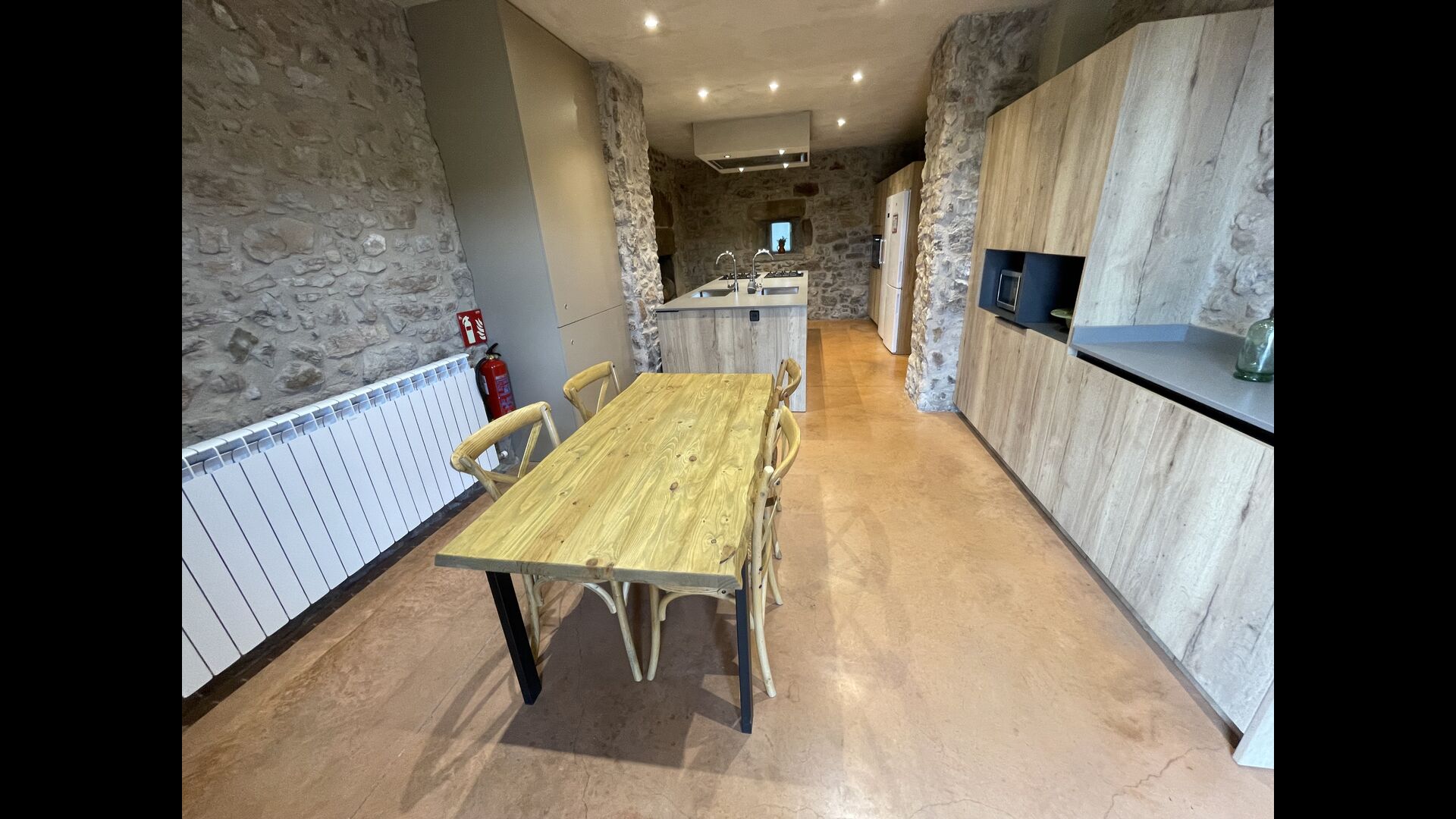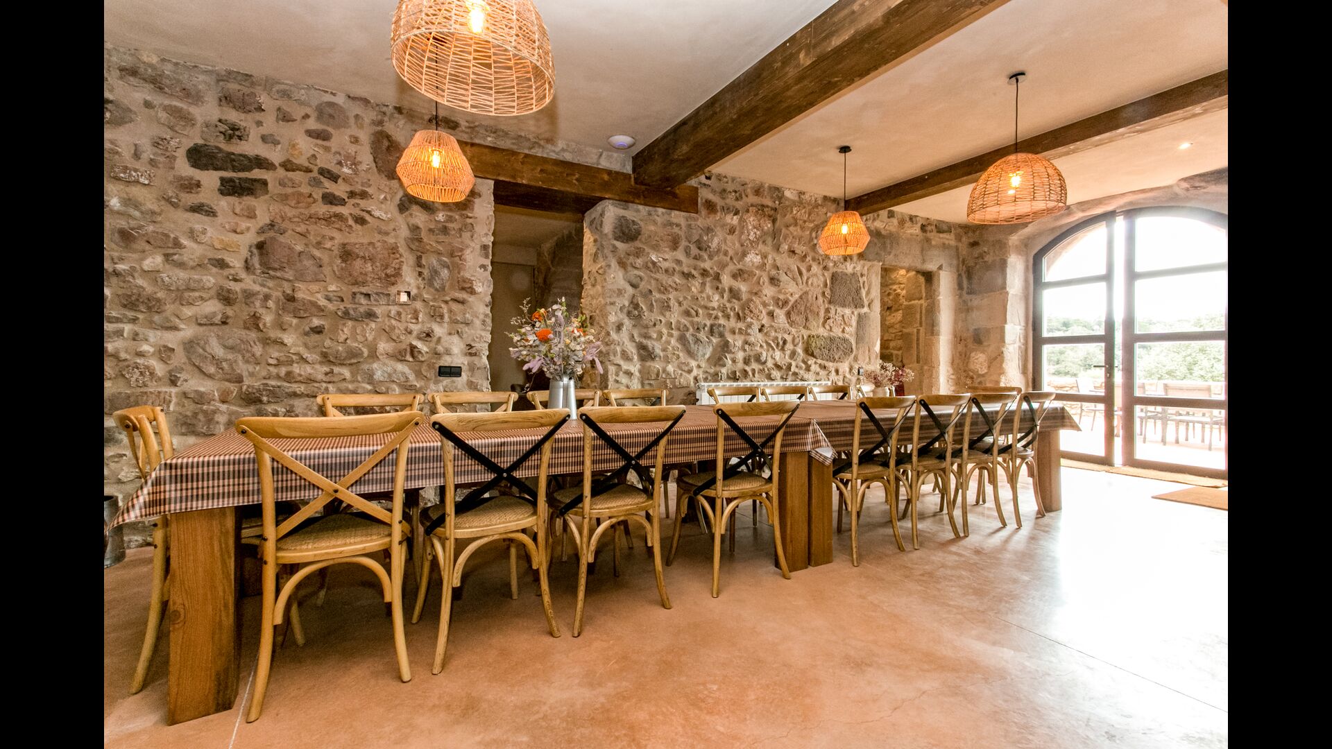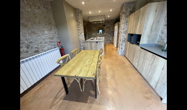 Des de la terrassa exterior, amb barbacoa, espai per menjar i gandules per relaxar-se, entrem directament a l'ampli menjador del Mas. Aquest actua com el cor de la casa, connectant les dues petites sales d'estar de la planta baixa amb la gran cuina. La cuina està totalment equipada amb 2 fogons de gas, 2 rentavaixelles, 2 neveres amb congelador, forn, microones i cafetera, així com una petita taula d'esmorzar.