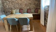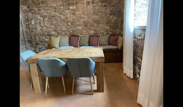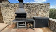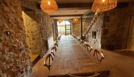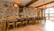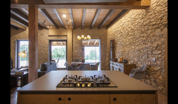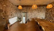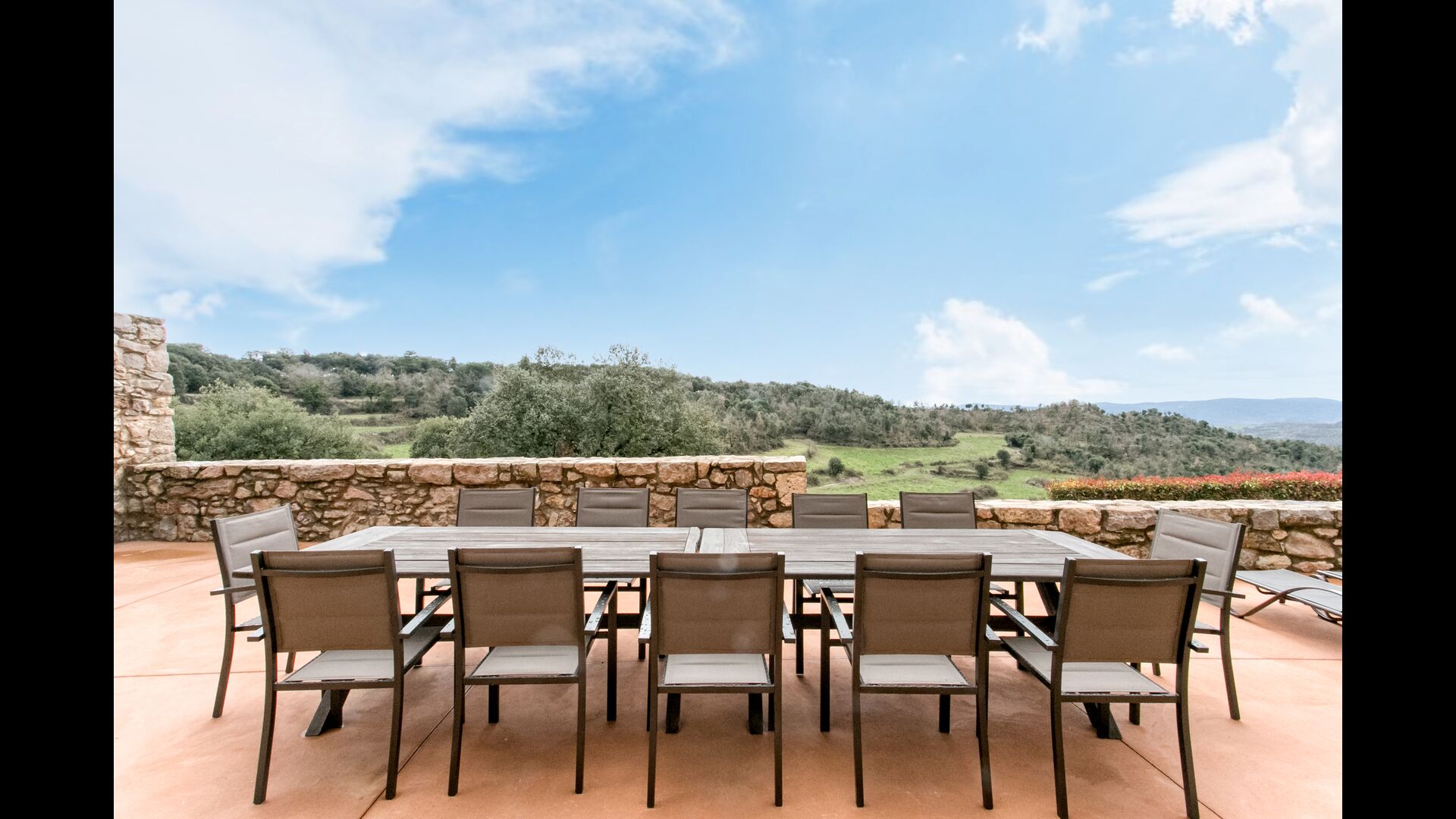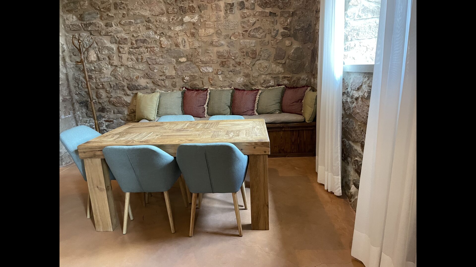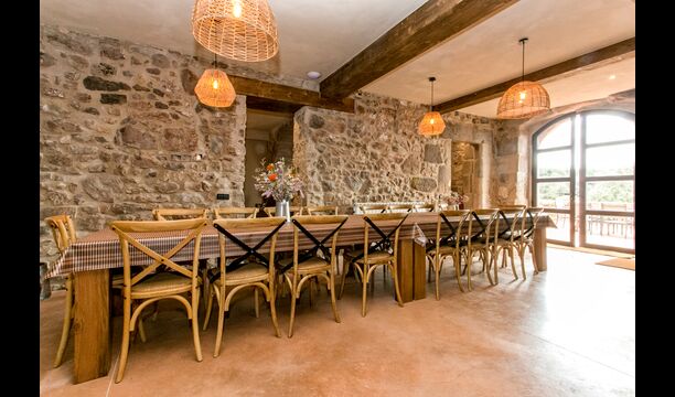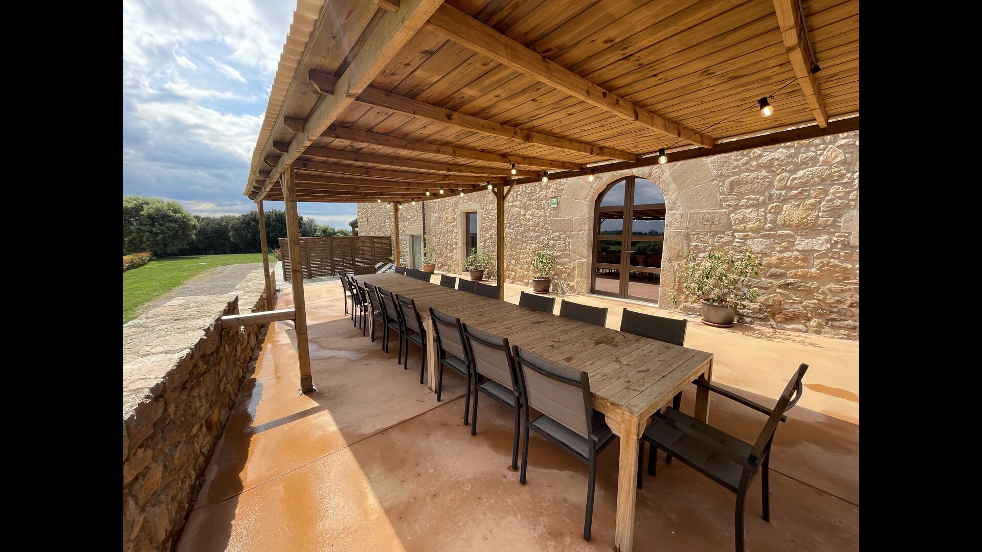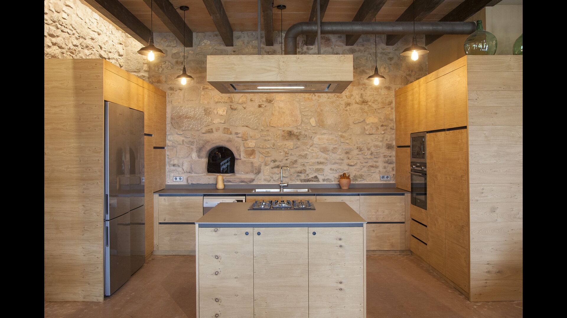 Des de la terrassa exterior, amb barbacoa, espai per menjar i gandules per relaxar-se, entrem directament a l'ampli menjador del Mas. Aquest actua com el cor de la casa, connectant les dues petites sales d'estar de la planta baixa amb la gran cuina. La cuina està totalment equipada amb 2 fogons de gas, 2 rentavaixelles, 2 neveres amb congelador, forn, microones i cafetera, així com una petita taula d'esmorzar.