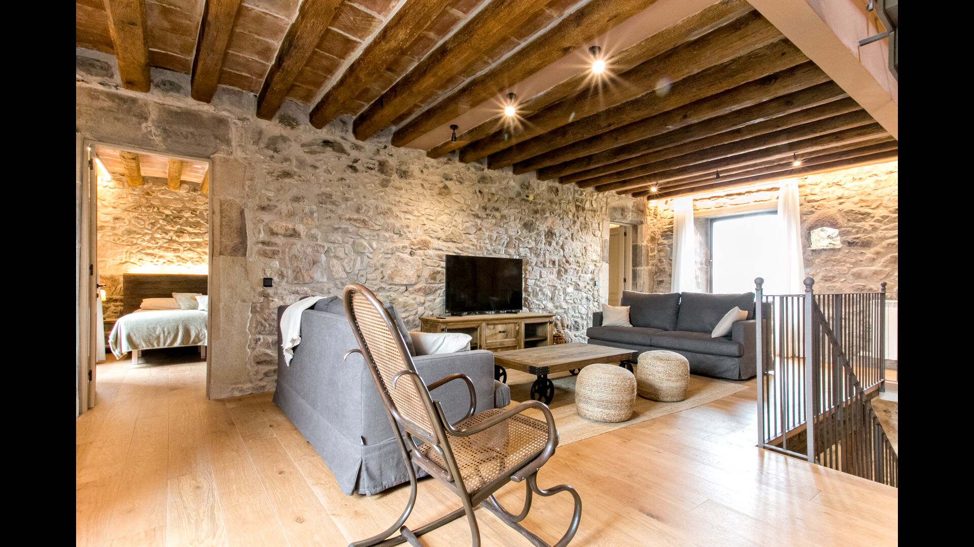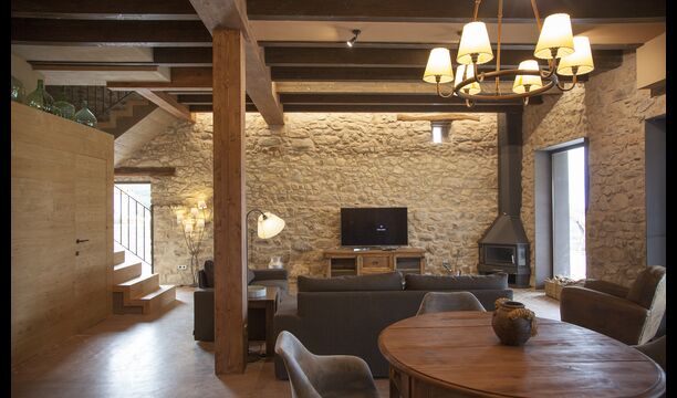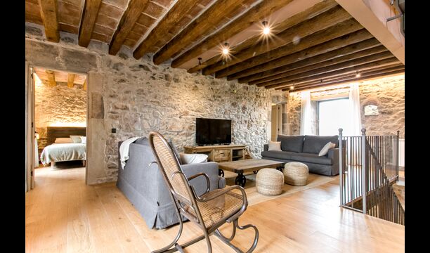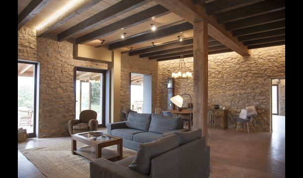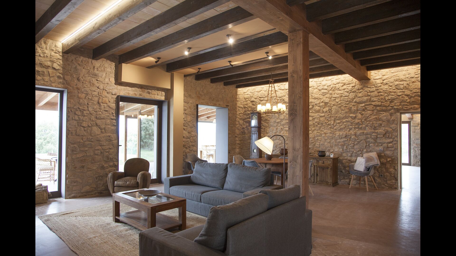 Una casa espectacular, plena de detalls de la construcció original, emmarcada en mobles de fusta i teixits càlids.