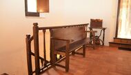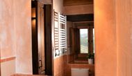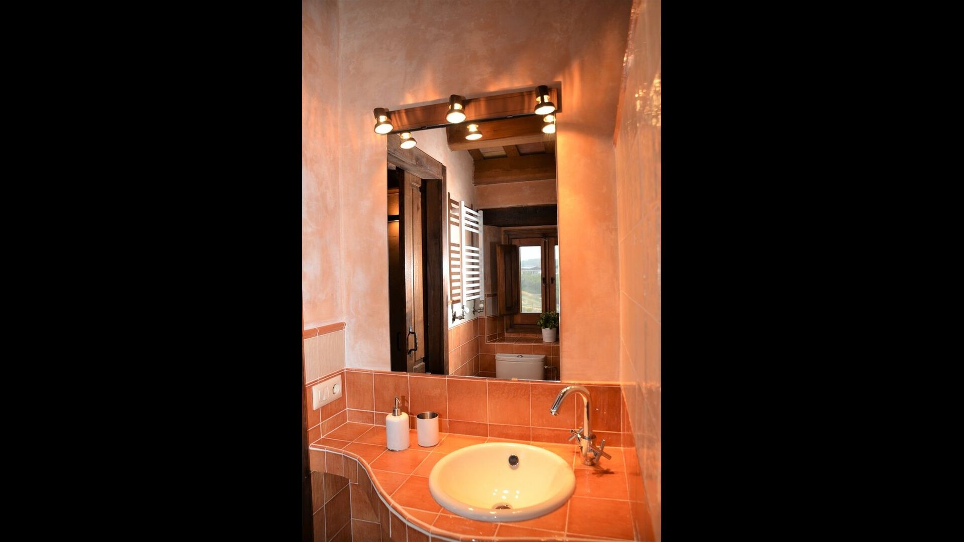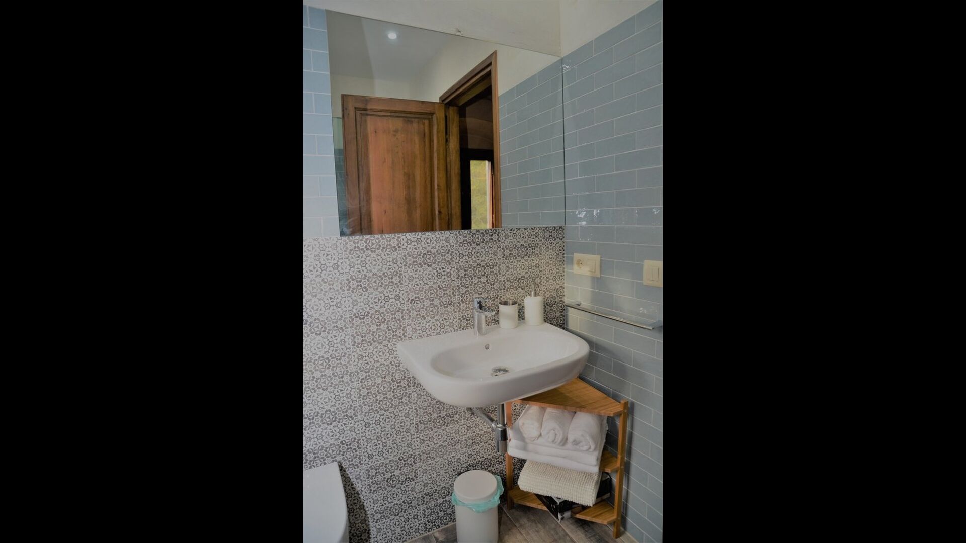 When you enter the ground floor from the pool area you will be lead into the large open kitchen and dining room. The interior and style of the kitchen is very authentic and tasteful, with a large wooden cupboard, wooden chairs and a cozy fireplace. It has a counter bar on one side, with two bar stools and is very well equipped with everything you might need, including; fridge, freezer, dishwasher, microwave and even a Nespresso machine. The dining room is also incredibly cozy with a, arched ceiling and with authentic limestone walls. It has a long wooden dining table with wooden benches. In the next room is the lounge room with comfortable couches and chairs. There is a TV and a DVD machine, and the house also has Wi-Fi, so you will be able to put your feet up and relax here, if desired. There is also a small bathroom with a toilet on this floor, so you do not have to go upstairs if needed. At the end of this part of the house, you will find an exit that takes you outside to a covered terrace with a large table. The perfect spot to dine or enjoy a cool drink at night time, in the lovely Catalan temperatures.