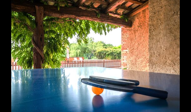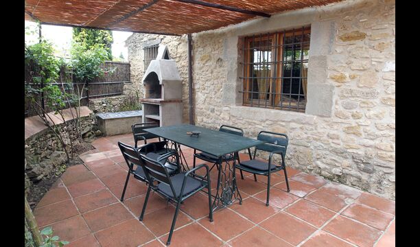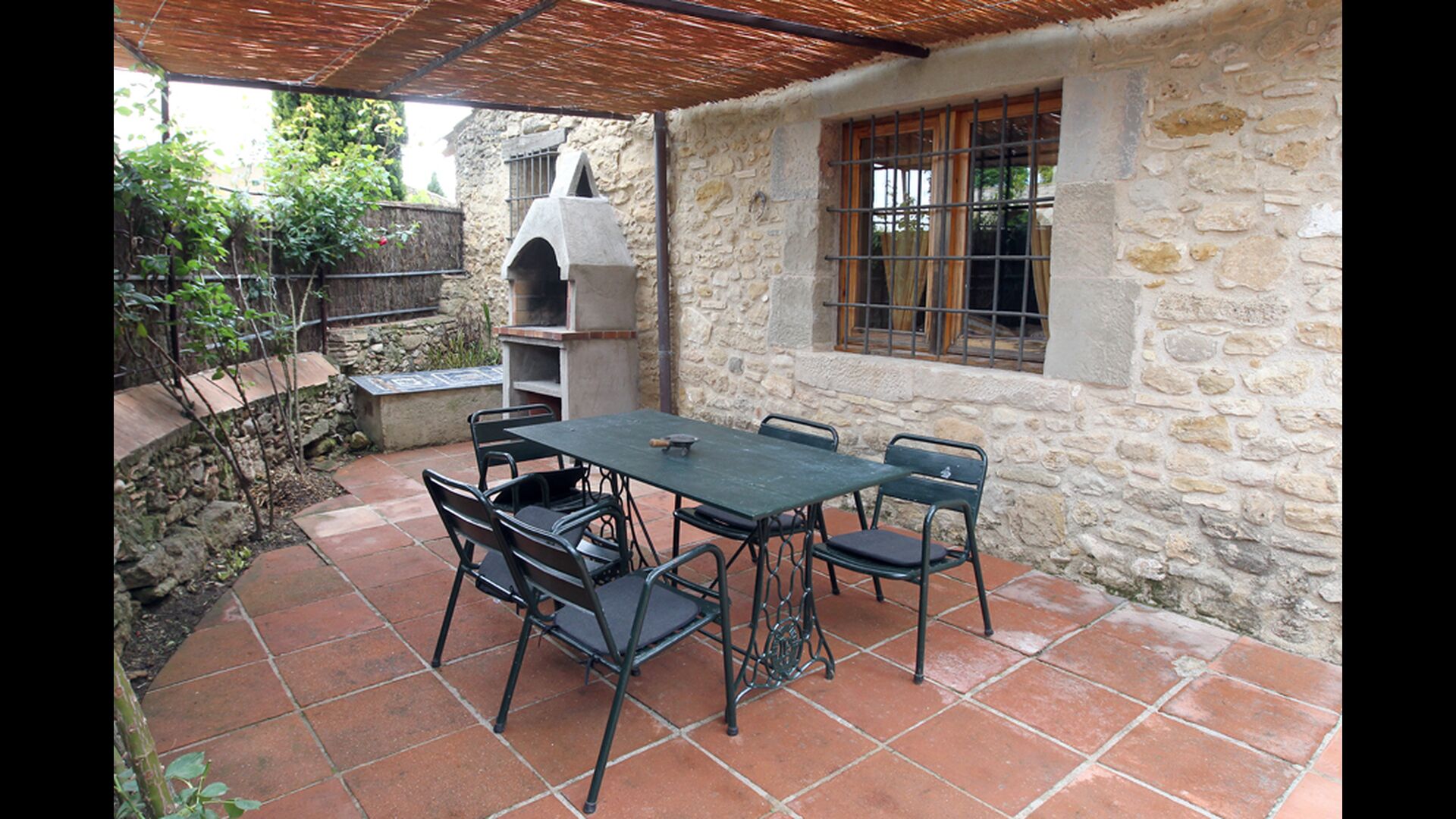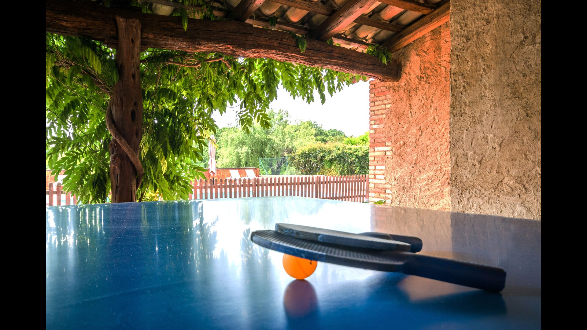 També hi ha la terrassa coberta, amb cadires, una taula petita i – més enrere – un sofà de pedra adossat a la paret. Al jardí també trobareu un equip de ping-pong i un petit camp de futbol.
