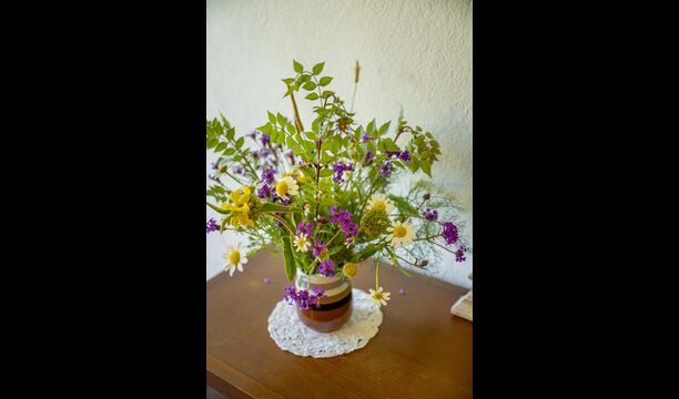 The staircase to the first floor is in the living room, and it leads up to two double rooms and a triple room. There is also a modern bathroom. Especially from the rooms here on this floor, you can experience a wonderful view over the valley.
