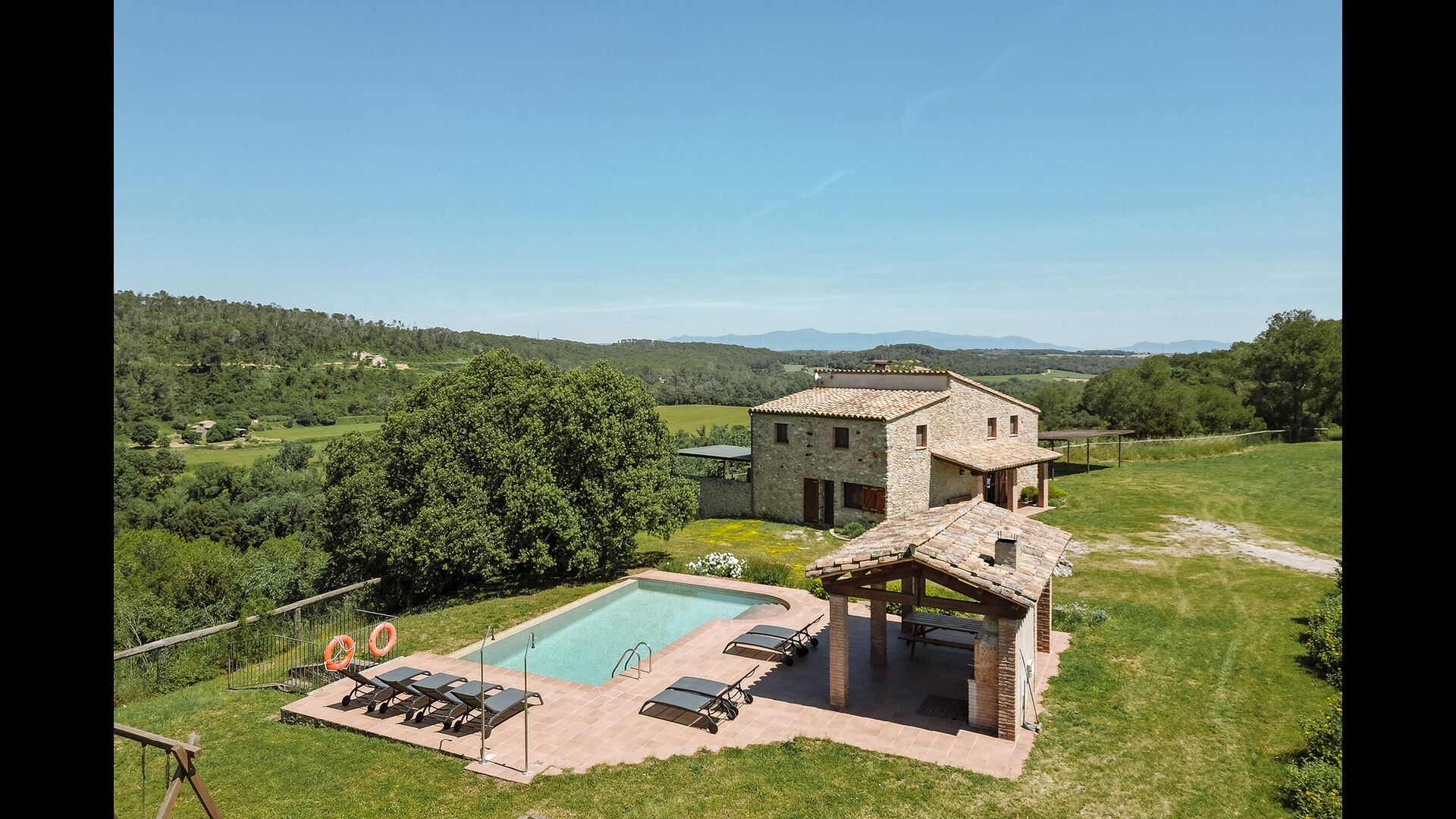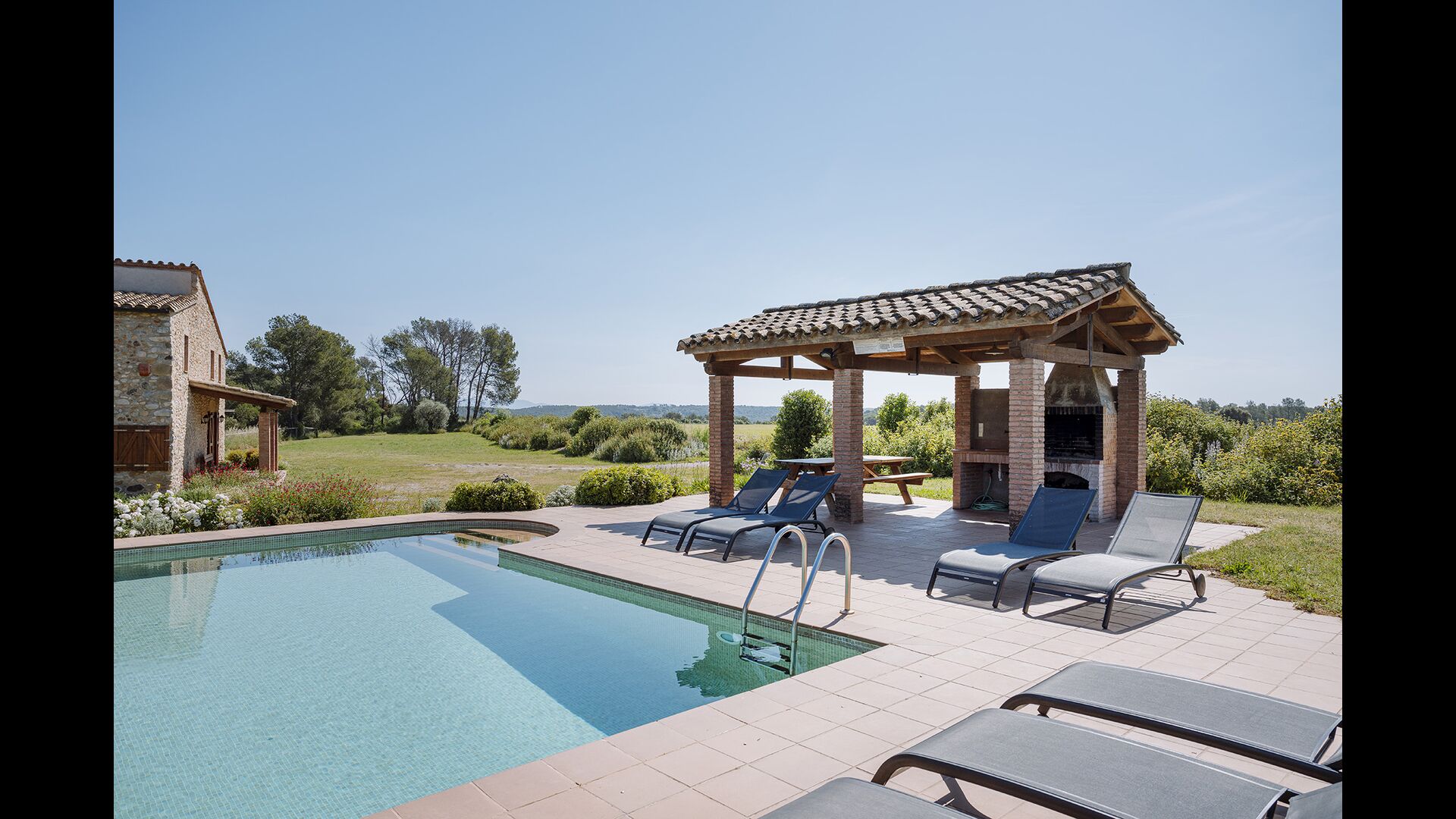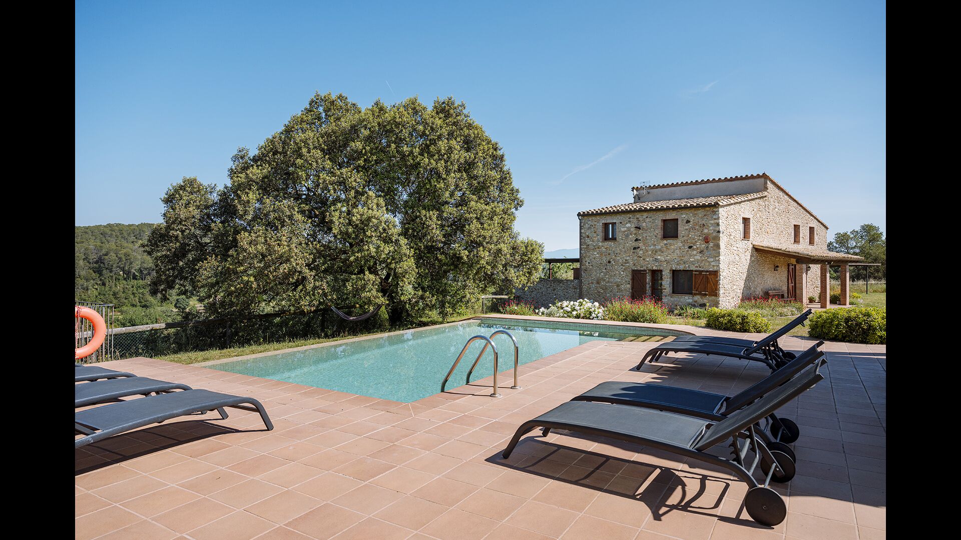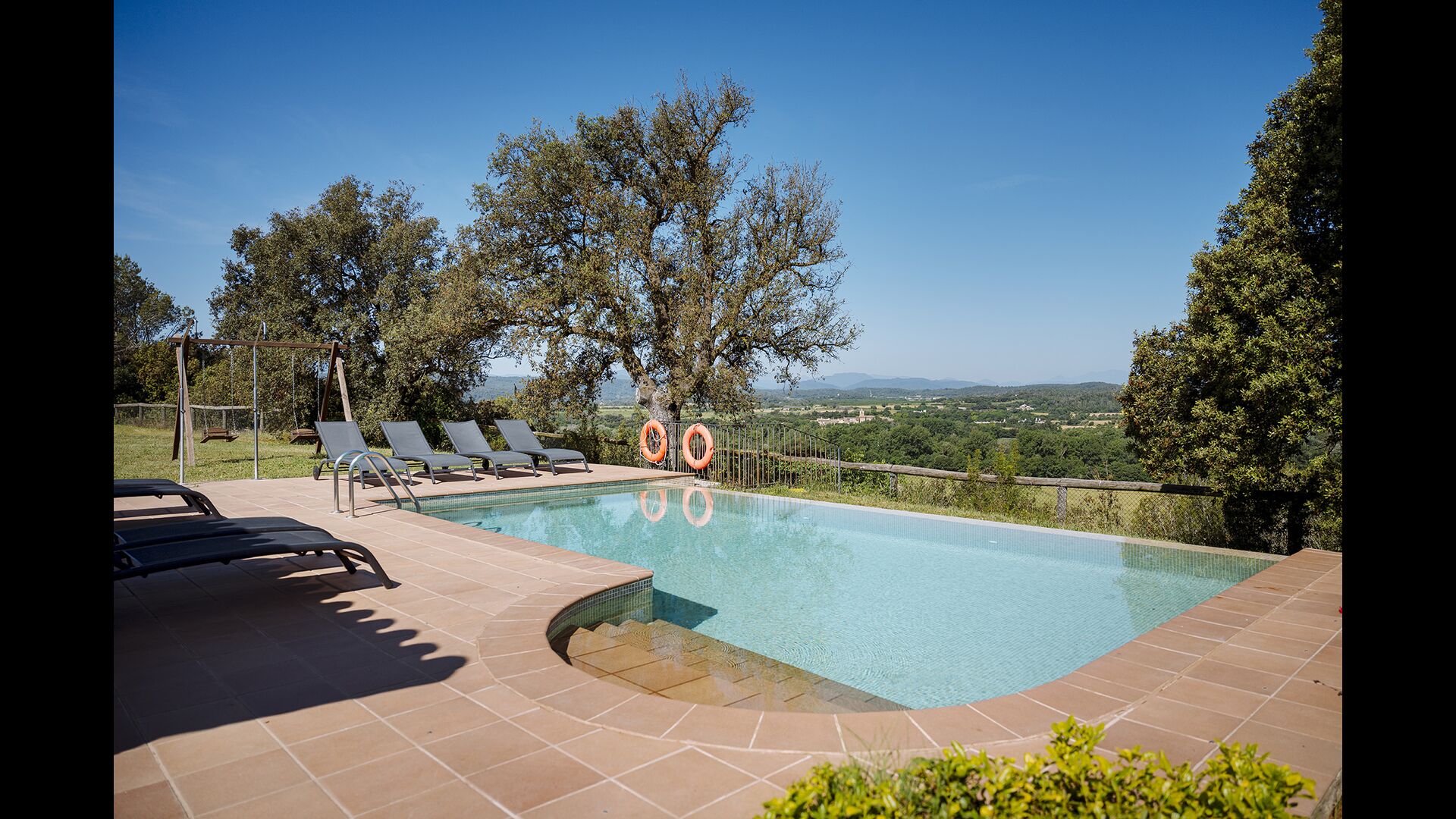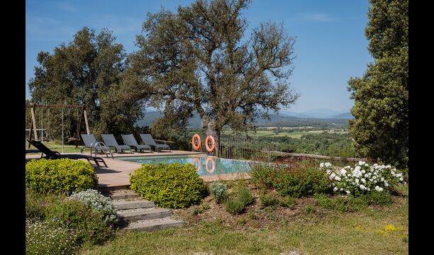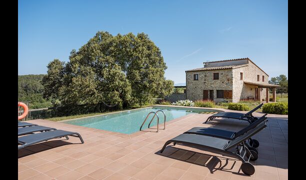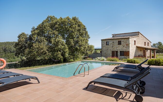 The swimming pool, located toward the hillside, will surely be the children's favorite. It has a size of the entire 32 m2, and it's very unique: It has an overflow system that integrates it into the landscape. It is the ultimate relaxation place and also works as a good cooling element for the body. The pool is equipped with sun beds, where the Catalan heat can be enjoyed at full blast.