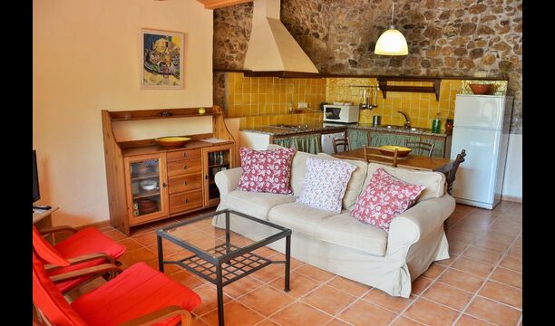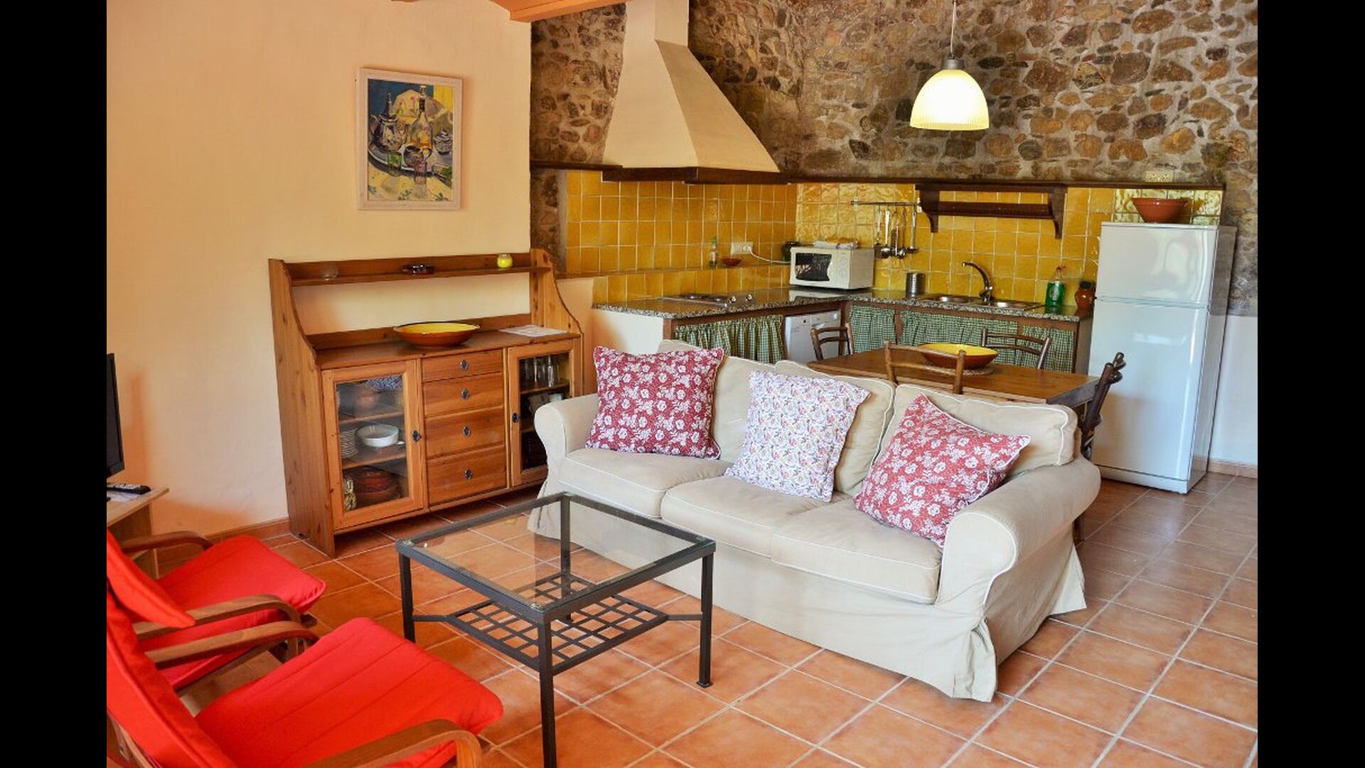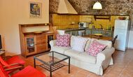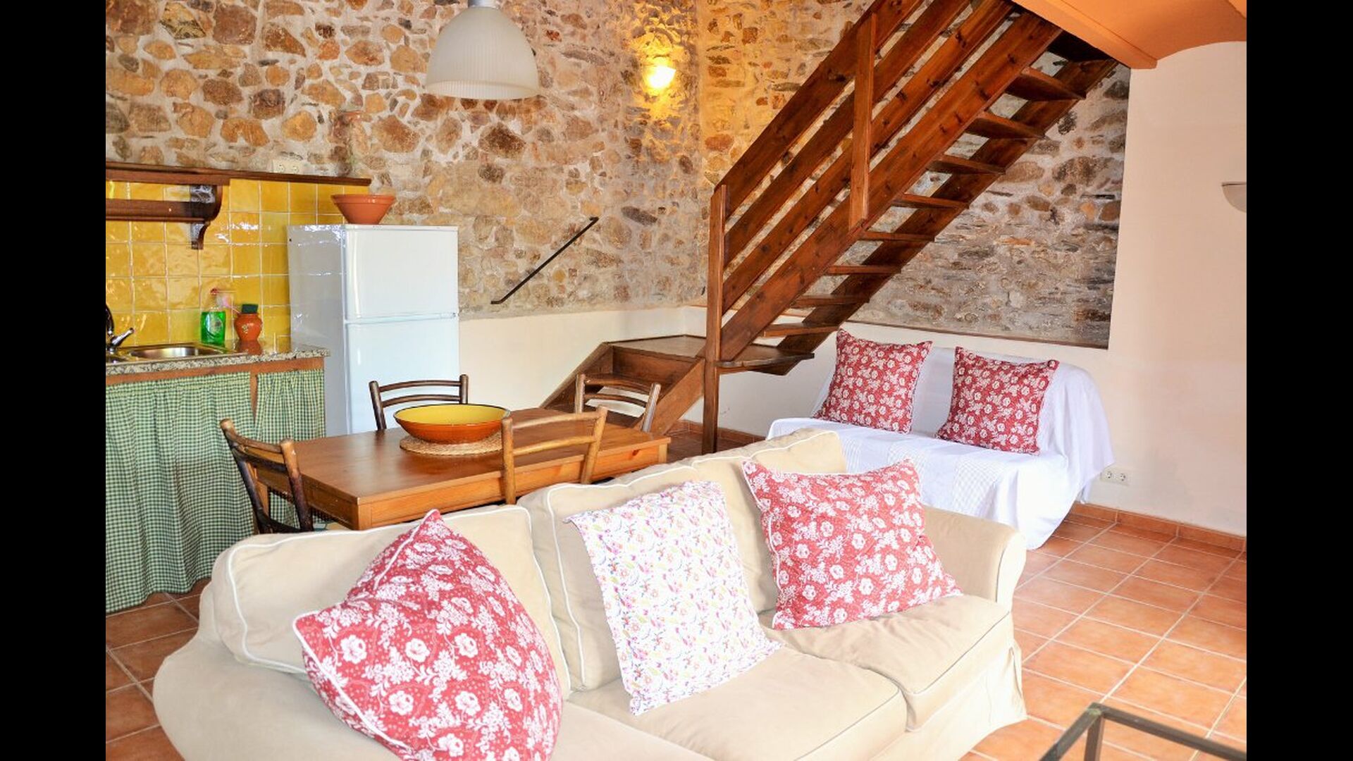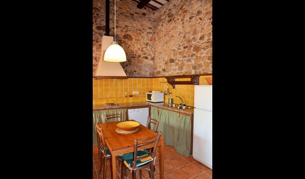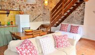La planta baixa consta d'una sala comuna amb un sofà amb TV, una taula de menjador i una cuina ben equipada. Gran part de les parets estan fetes de bigues de pedra i sostre, cosa que dóna una bona sensació a l'estil típic català.