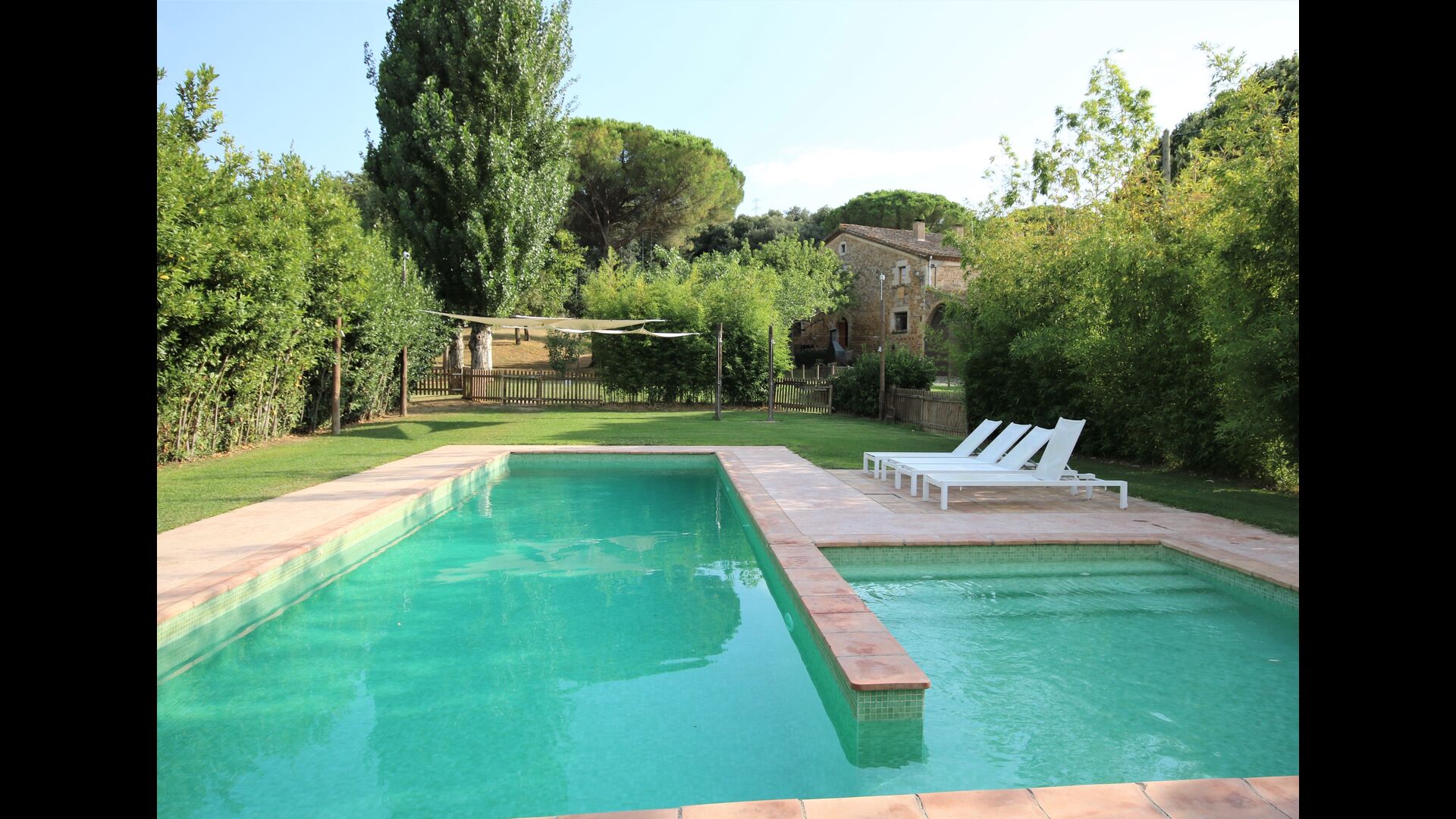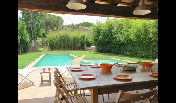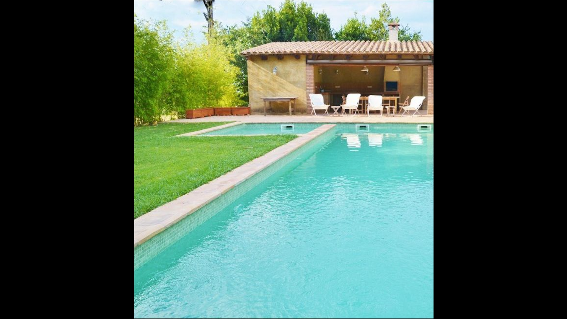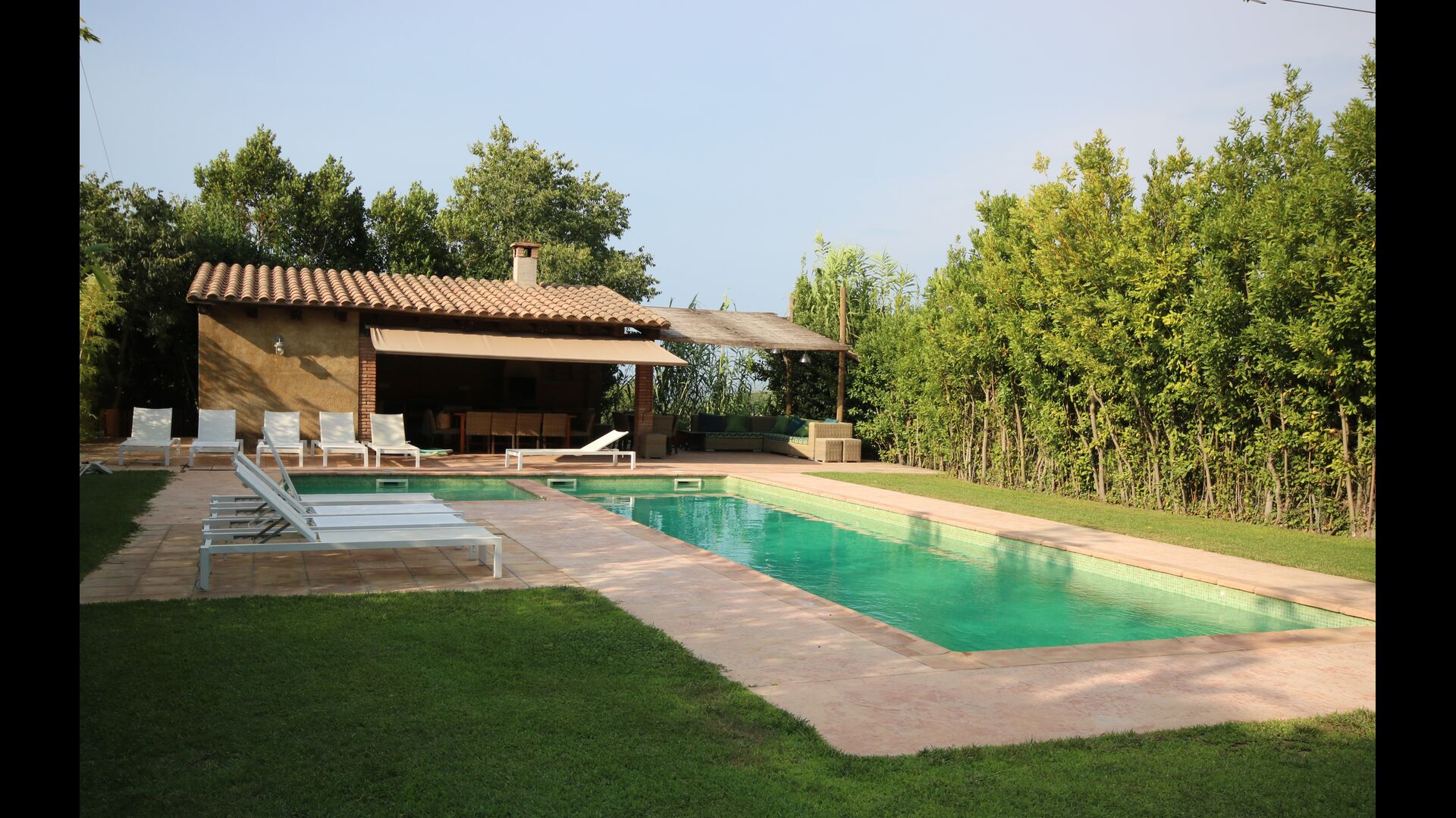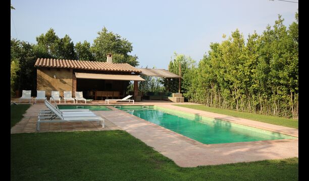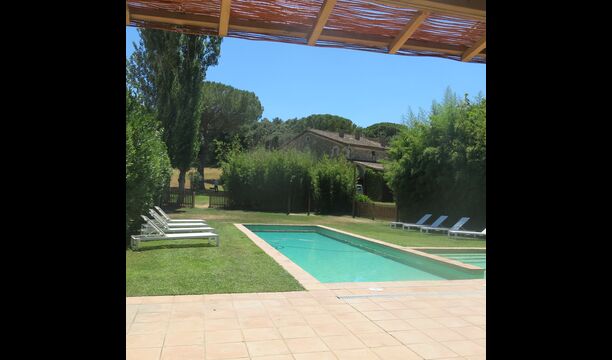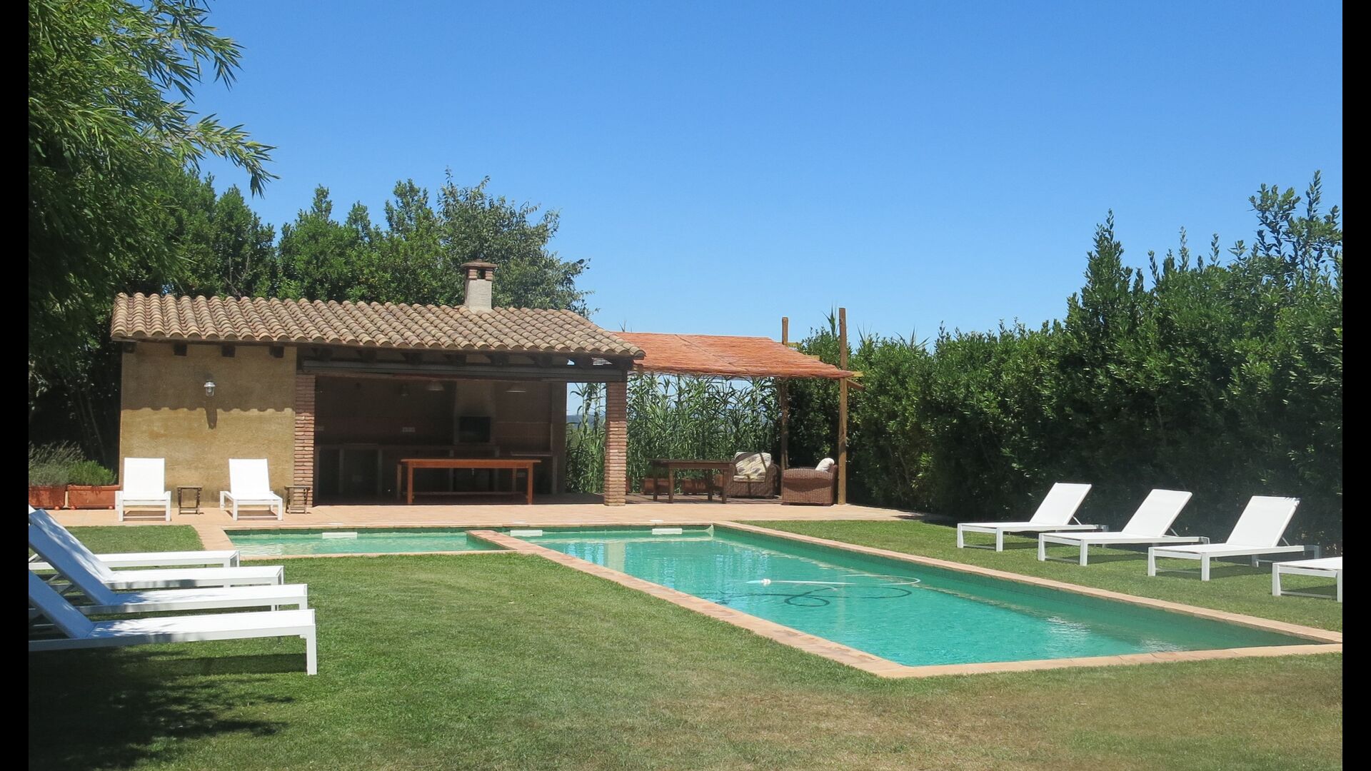 Al final del jardí, amb una excel·lent vista sobre els camps de conreu, es troba la gran zona de la piscina (tancada per protegir els nens petits). La piscina és de 10 x 4 metres i, a més, hi ha una petita piscina per a nens petits. Al final de la piscina, hi ha una gran terrassa coberta amb cuina a l'aire lliure amb aigua corrent, nevera i barbacoa i els estris necessaris perpoder cuinar i menjar i prendre begudes fresques. També hi ha un vàter, per no tenir d'anar a la casa.