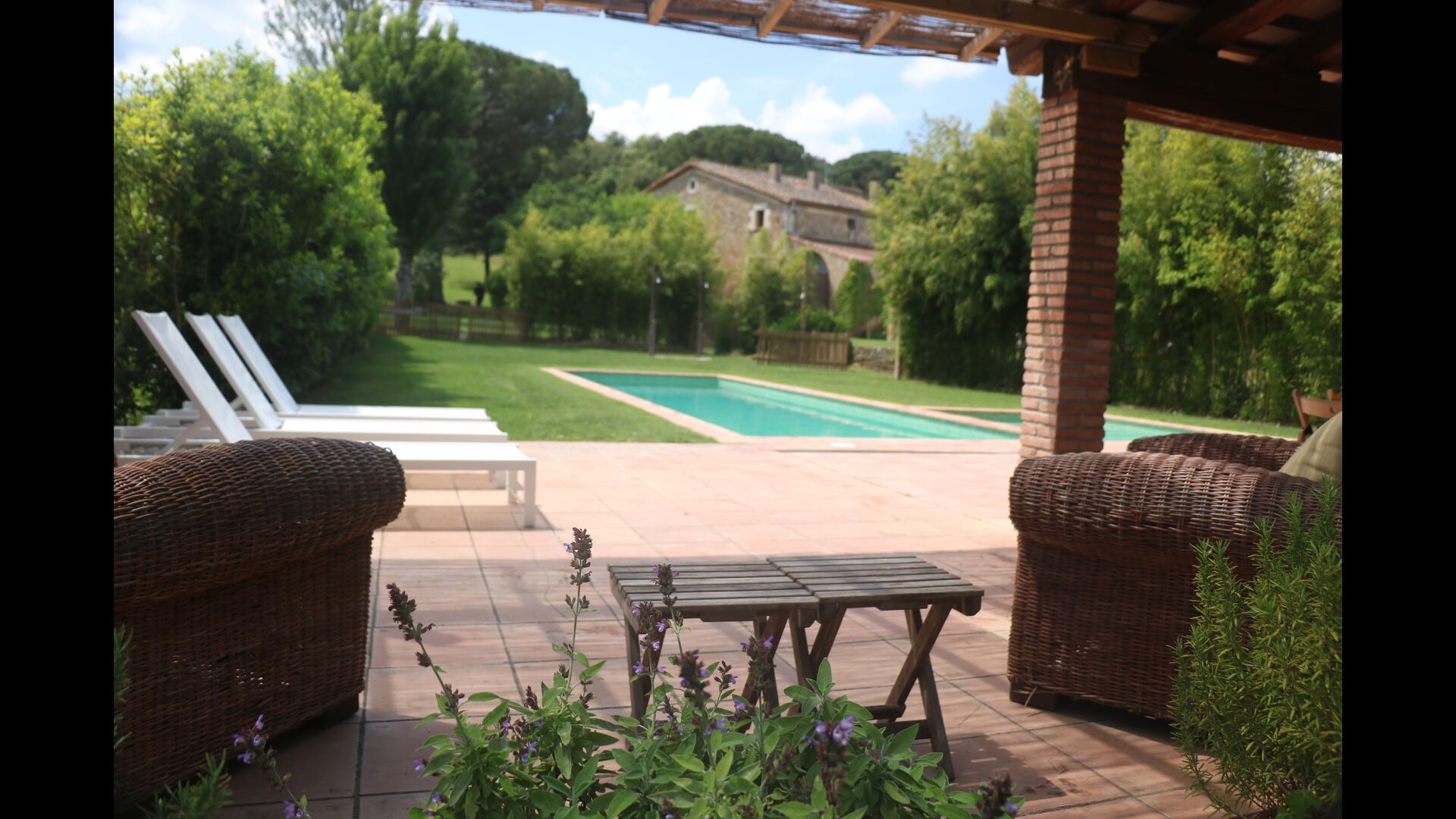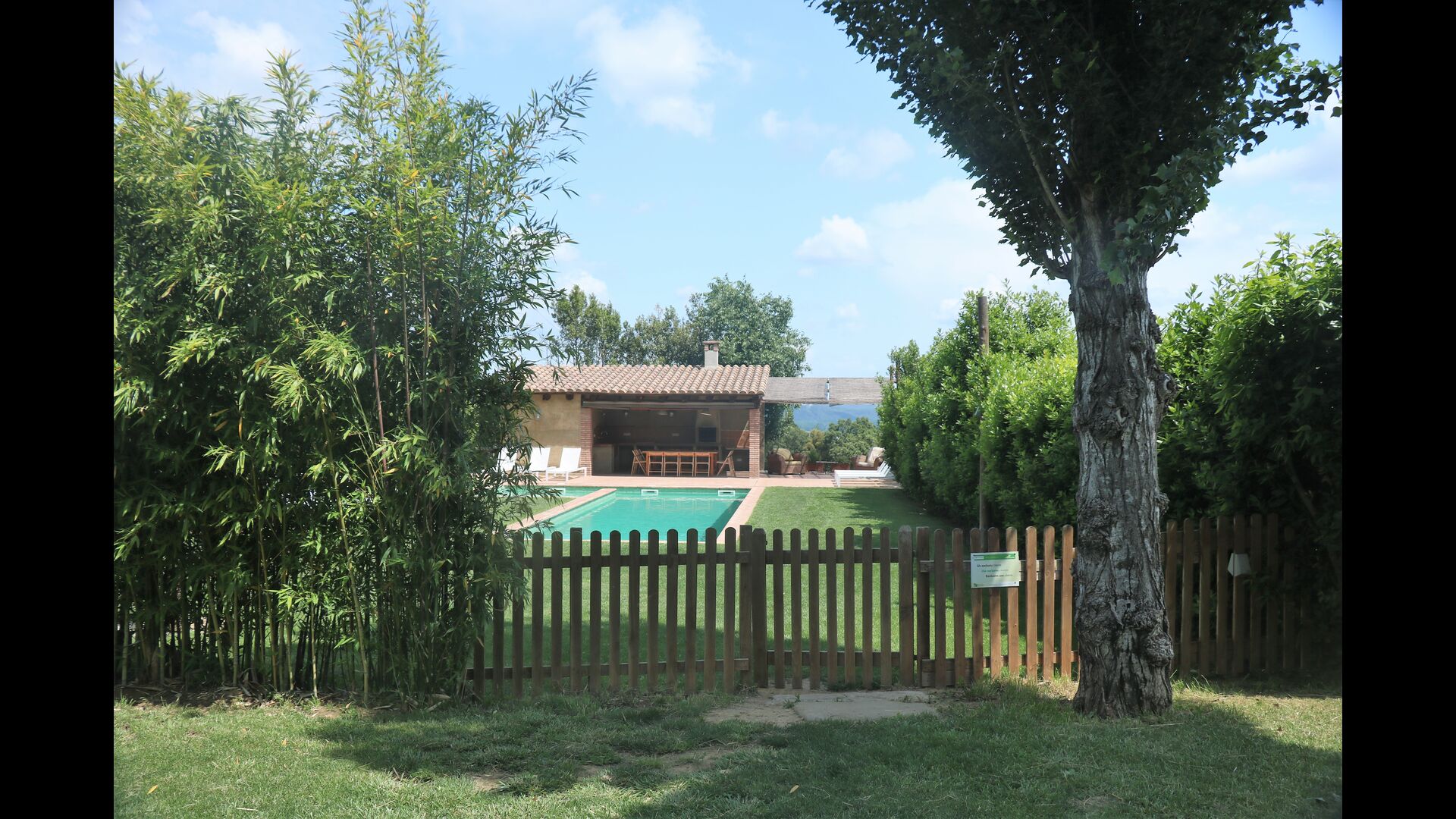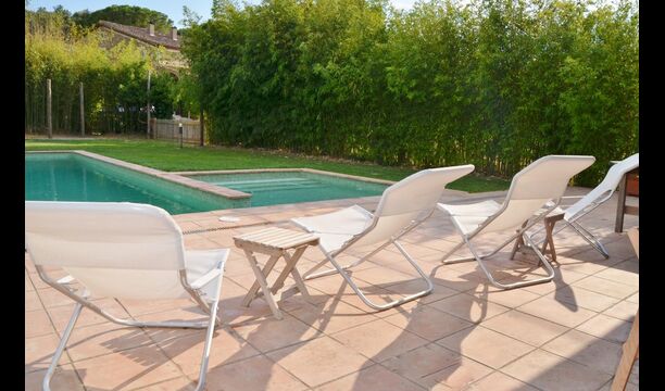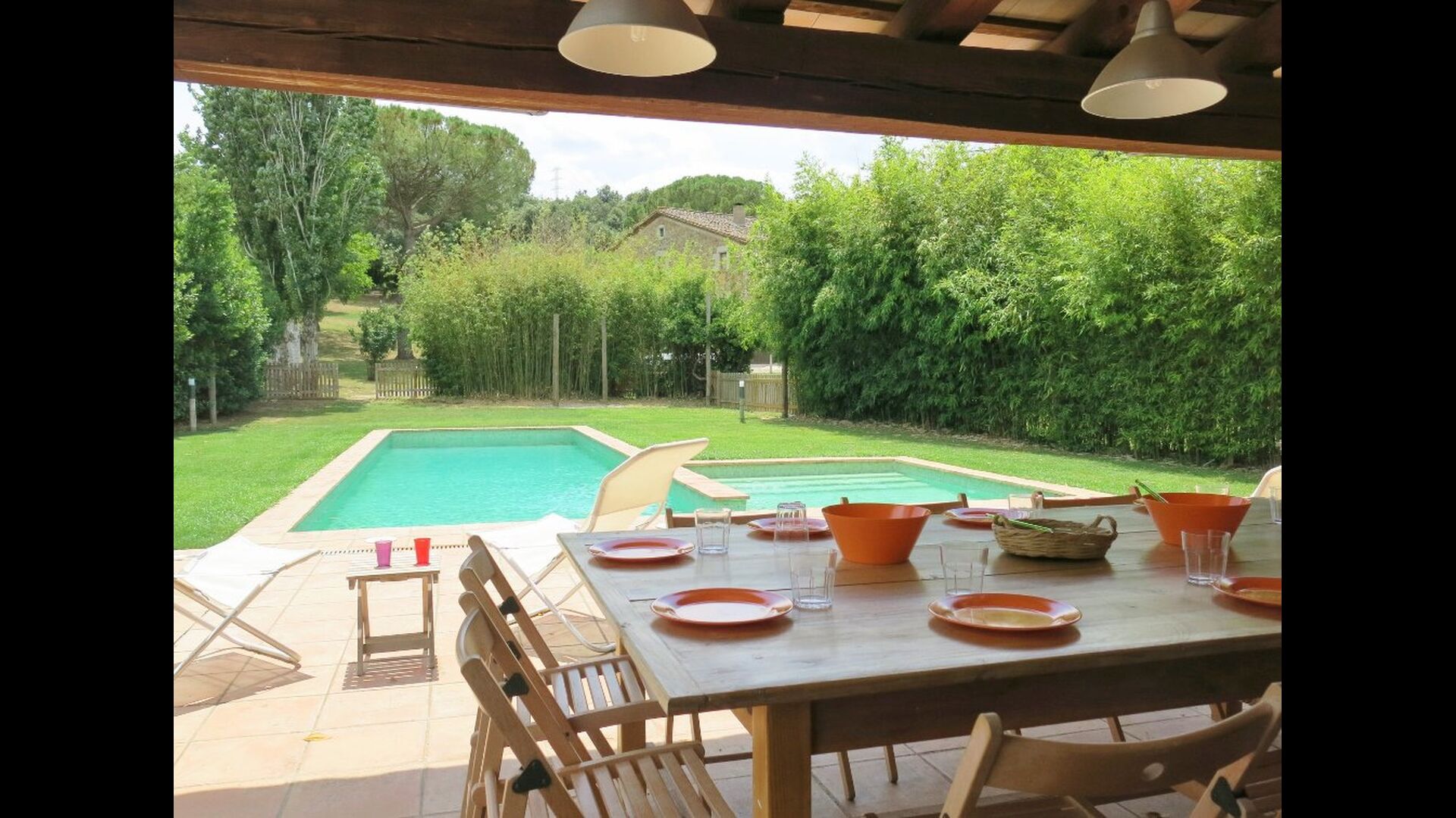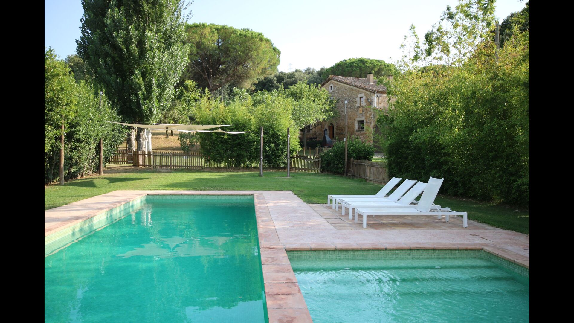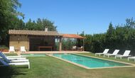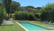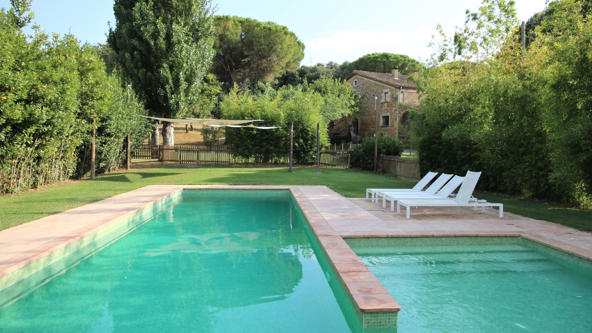 Al final del jardí, amb una excel·lent vista sobre els camps de conreu, es troba la gran zona de la piscina (tancada per protegir els nens petits). La piscina és de 10 x 4 metres i, a més, hi ha una petita piscina per a nens petits. Al final de la piscina, hi ha una gran terrassa coberta amb cuina a l'aire lliure amb aigua corrent, nevera i barbacoa i els estris necessaris perpoder cuinar i menjar i prendre begudes fresques. També hi ha un vàter, per no tenir d'anar a la casa.