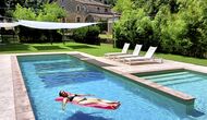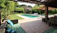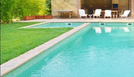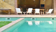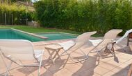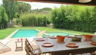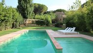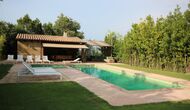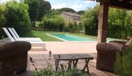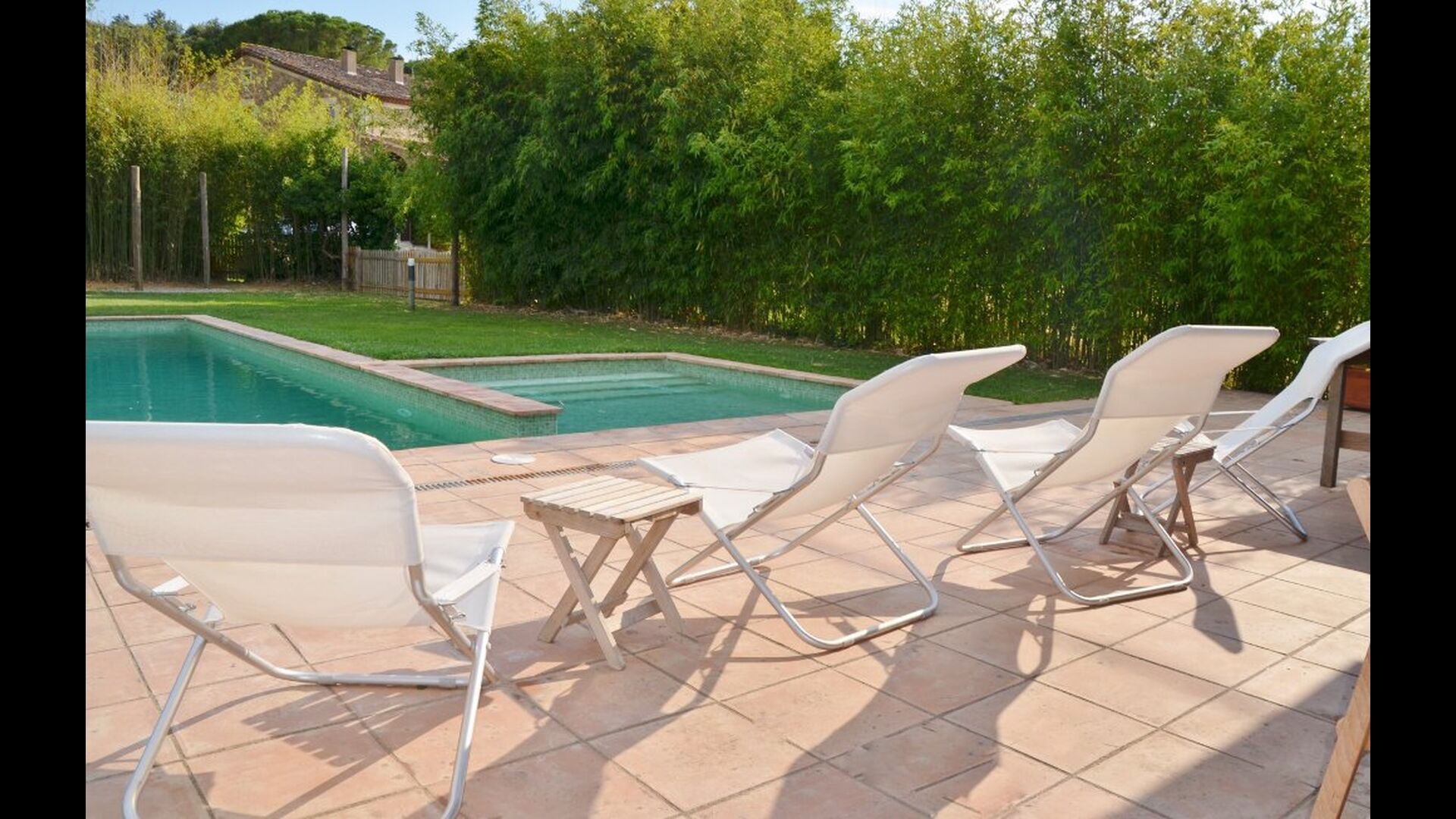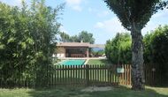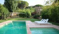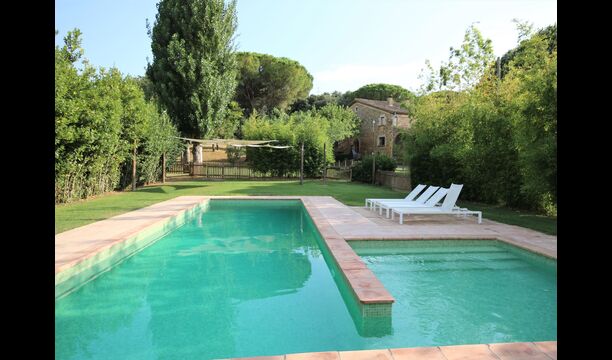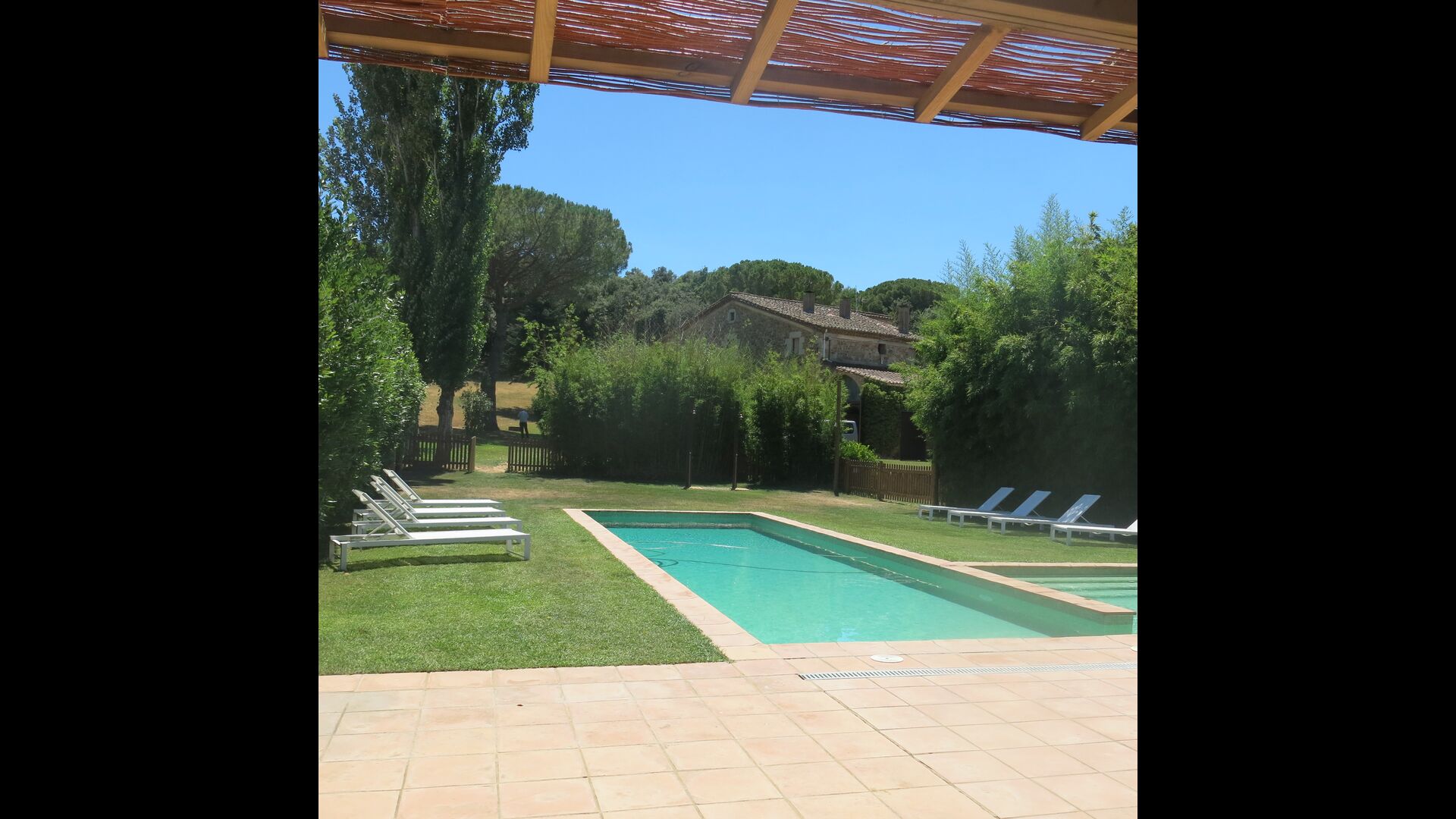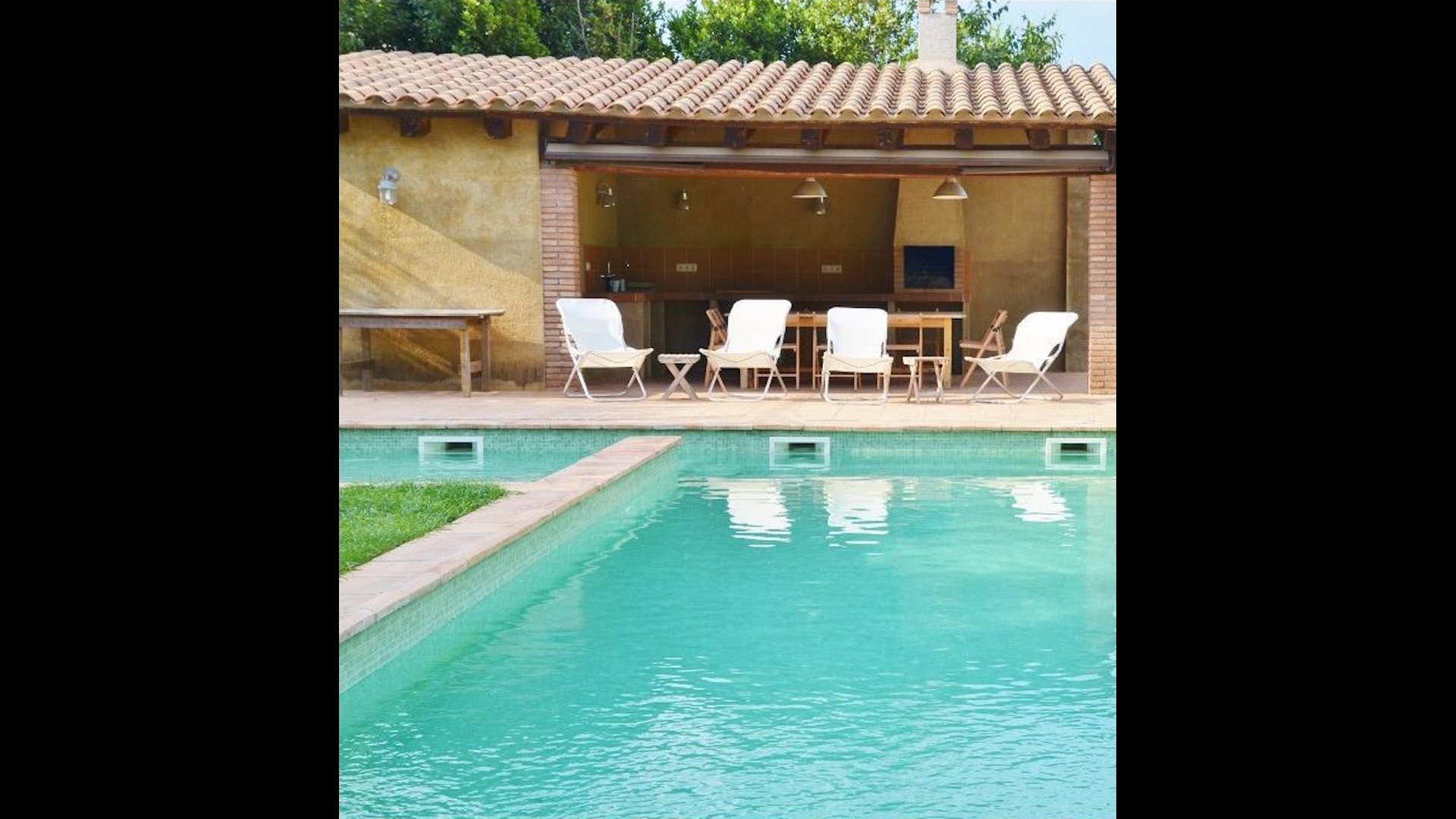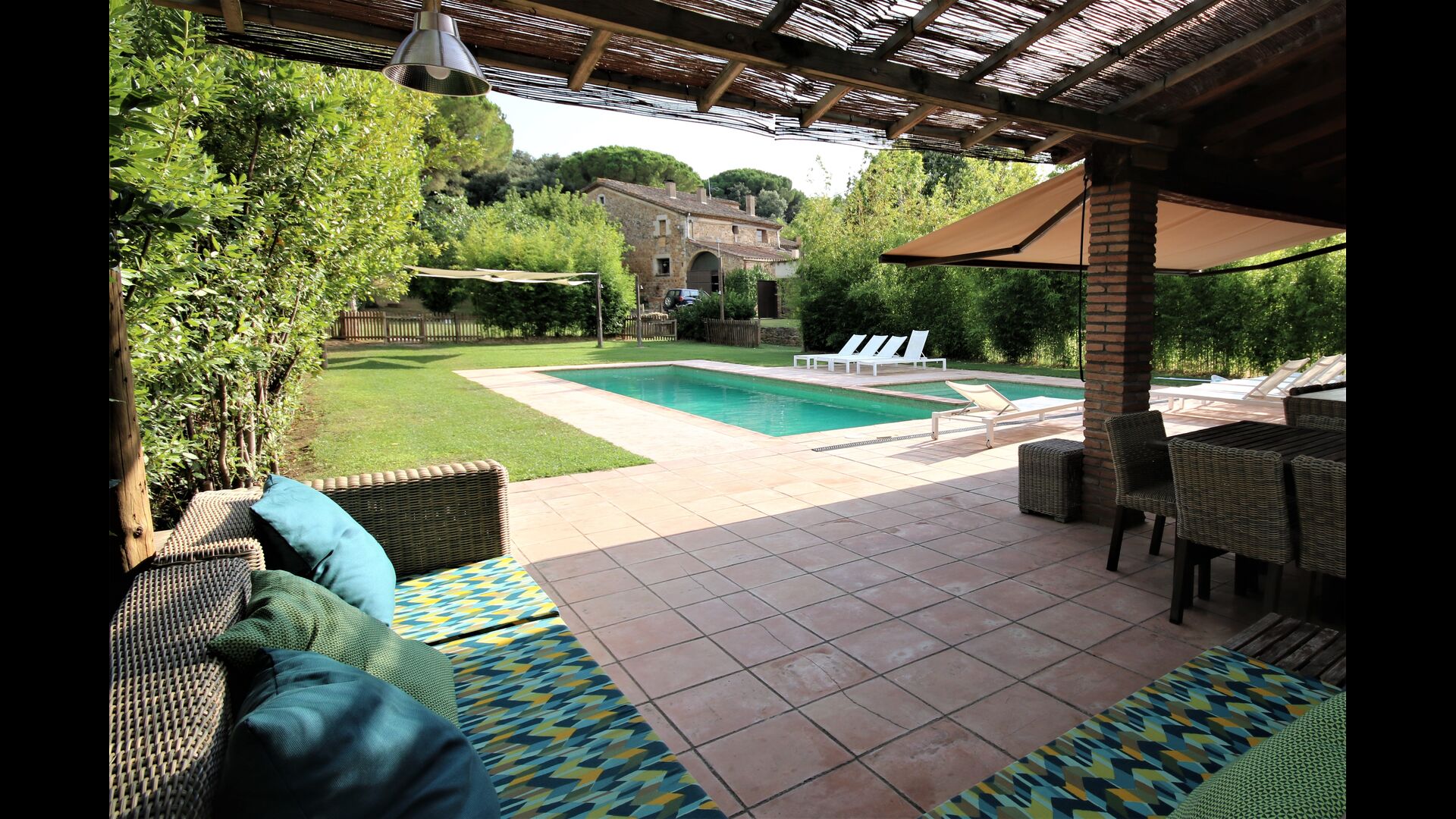 Al final del jardí, amb una excel·lent vista sobre els camps de conreu, es troba la gran zona de la piscina (tancada per protegir els nens petits). La piscina és de 10 x 4 metres i, a més, hi ha una petita piscina per a nens petits. Al final de la piscina, hi ha una gran terrassa coberta amb cuina a l'aire lliure amb aigua corrent, nevera i barbacoa i els estris necessaris perpoder cuinar i menjar i prendre begudes fresques. També hi ha un vàter, per no tenir d'anar a la casa.