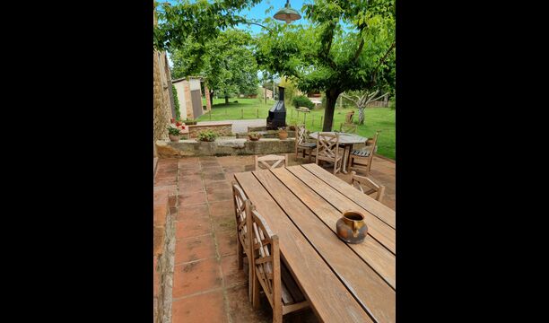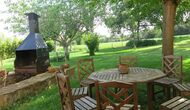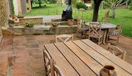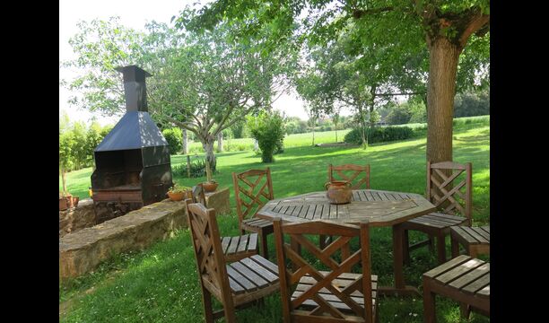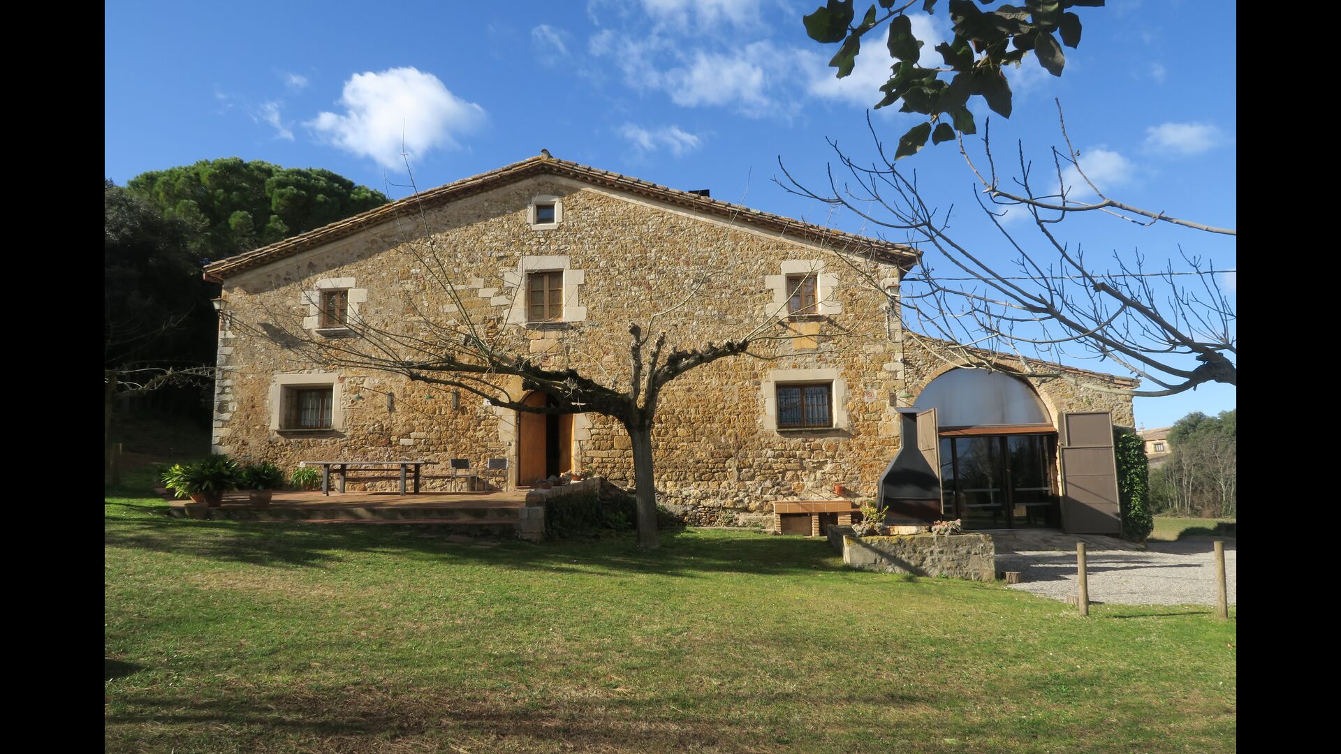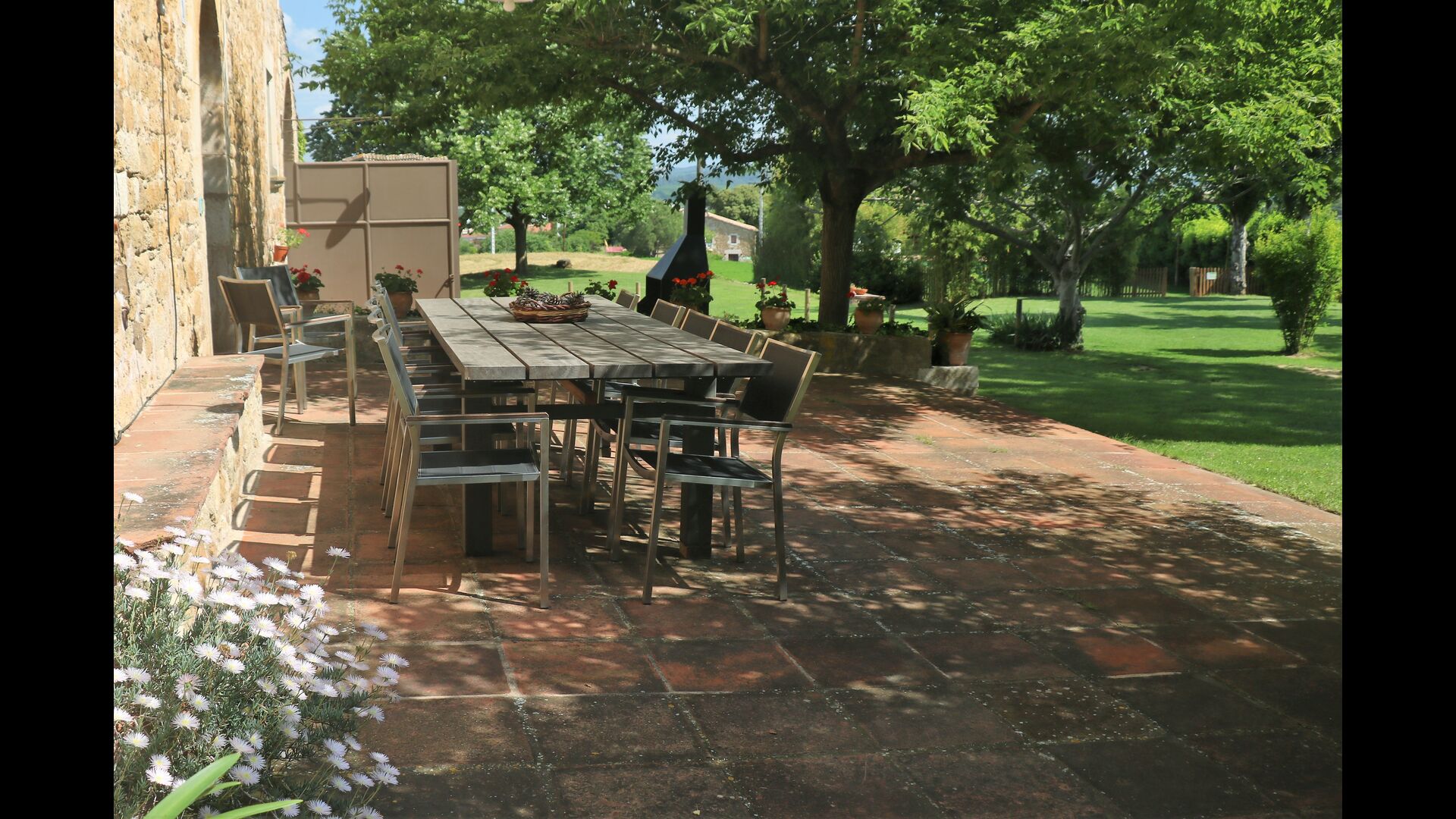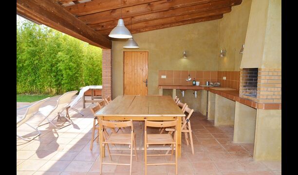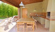 Terrassa amb gran taula al costat de la casa i amb gran barbacoa