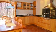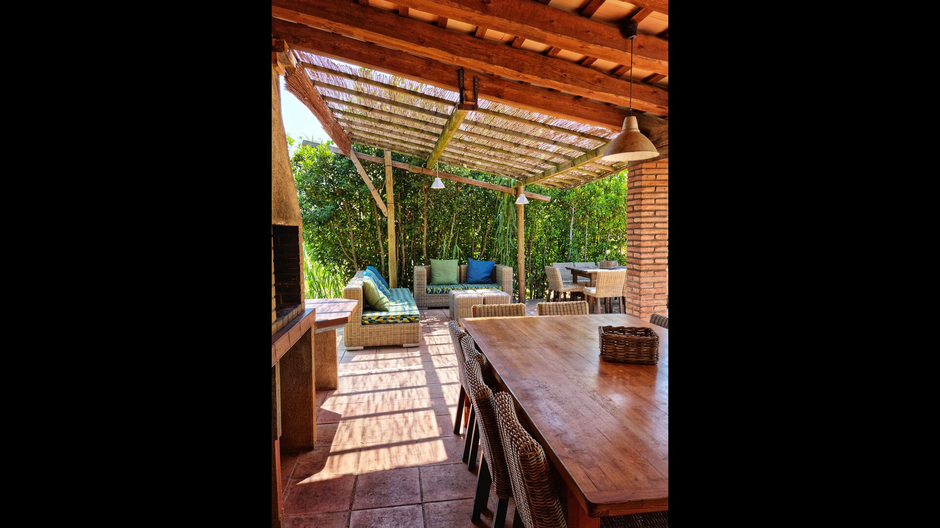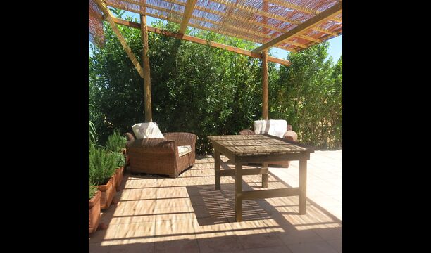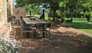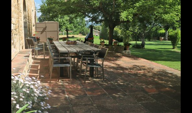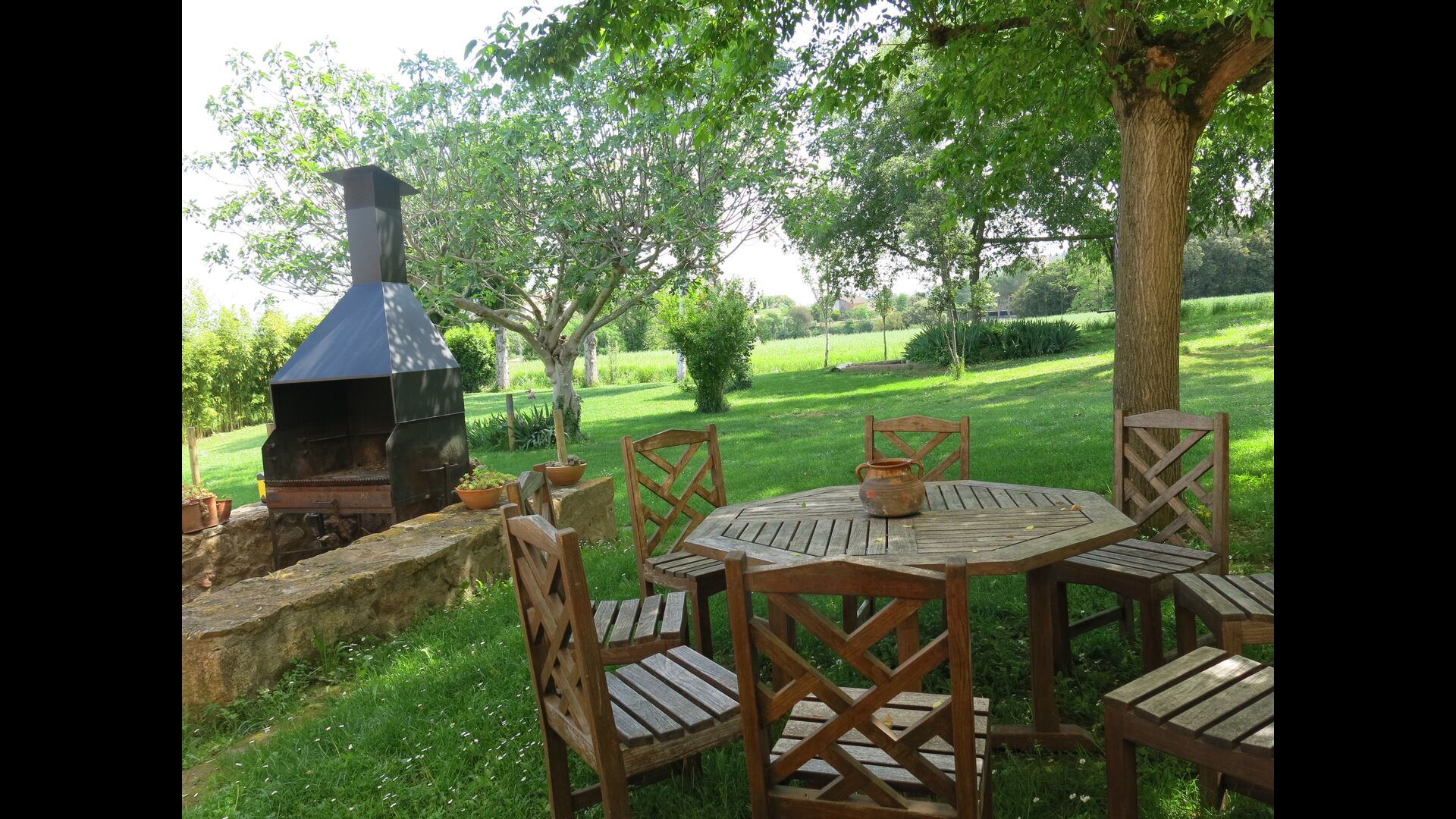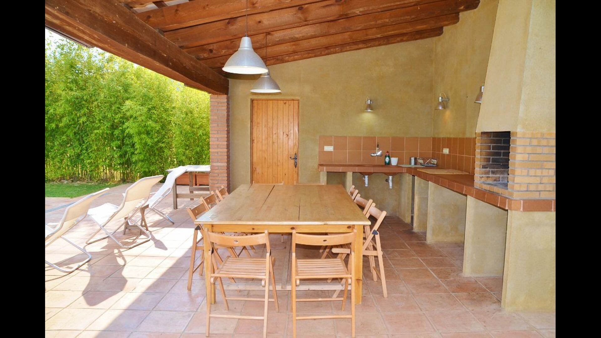 Terrassa amb gran taula al costat de la casa i amb gran barbacoa