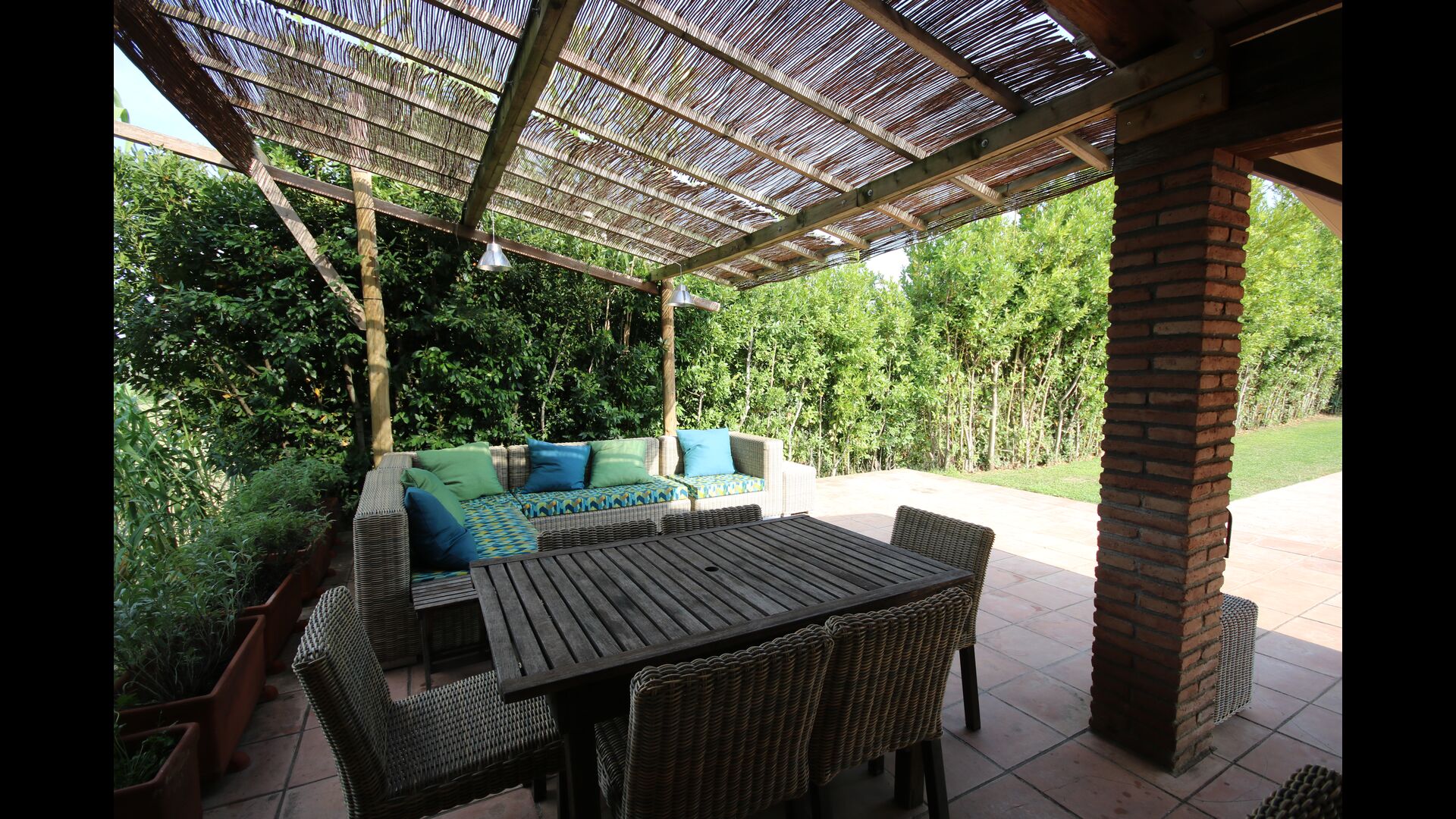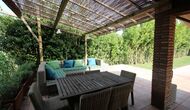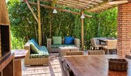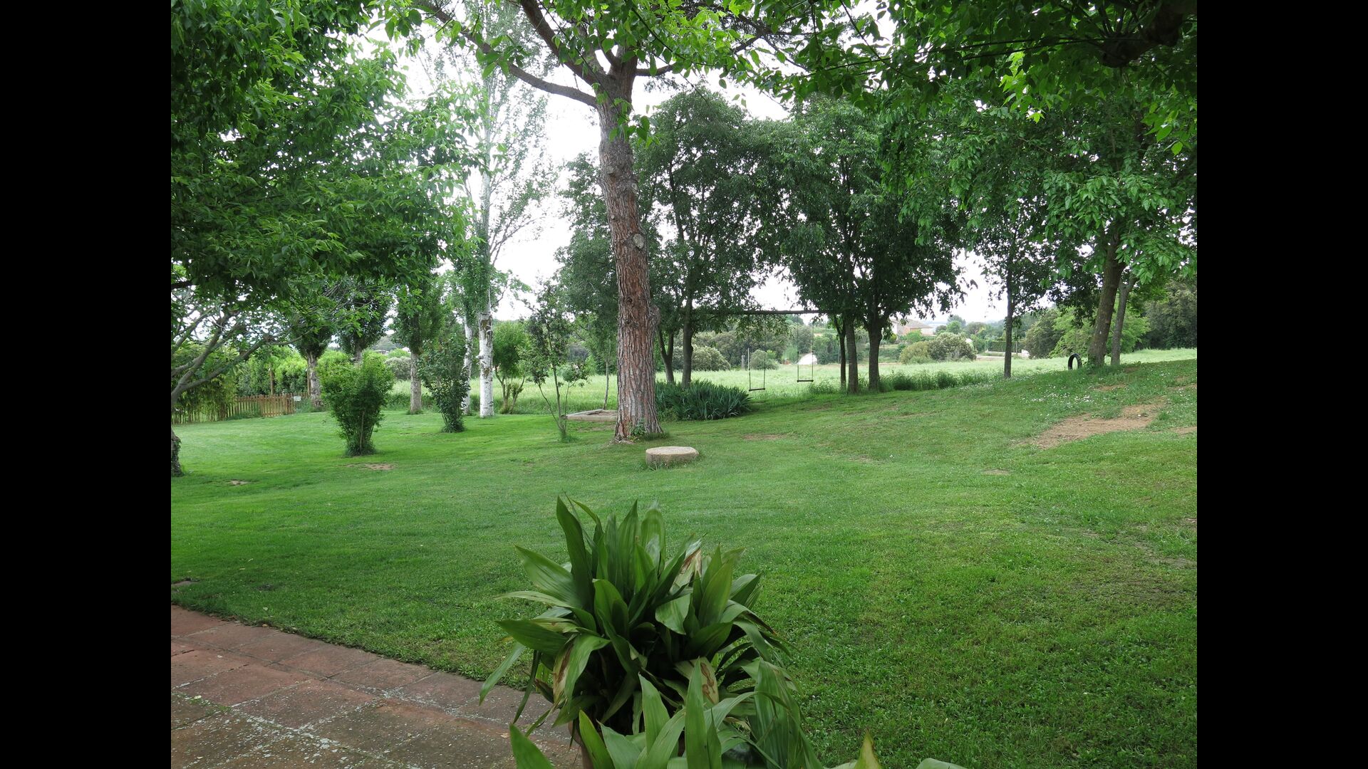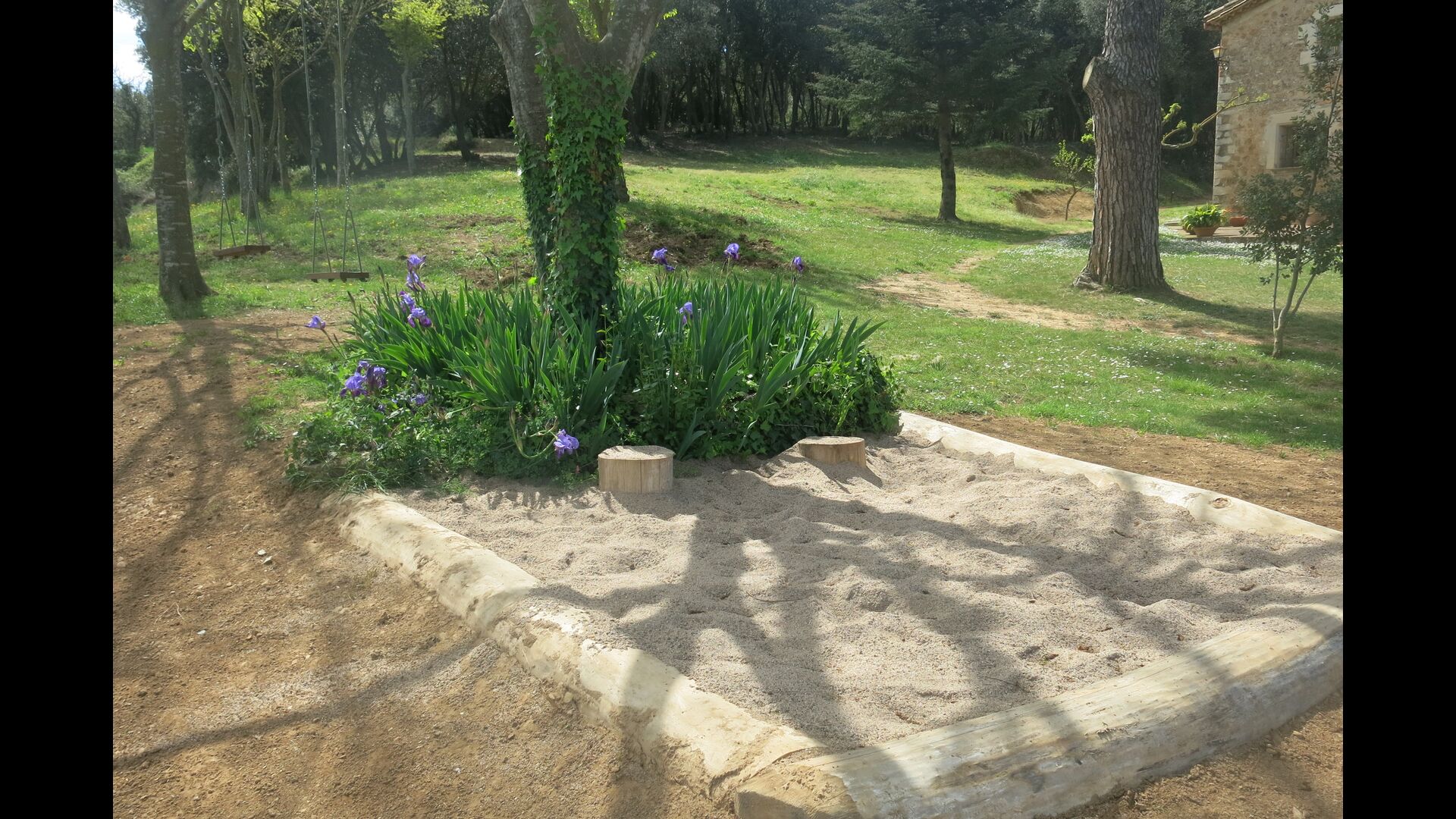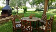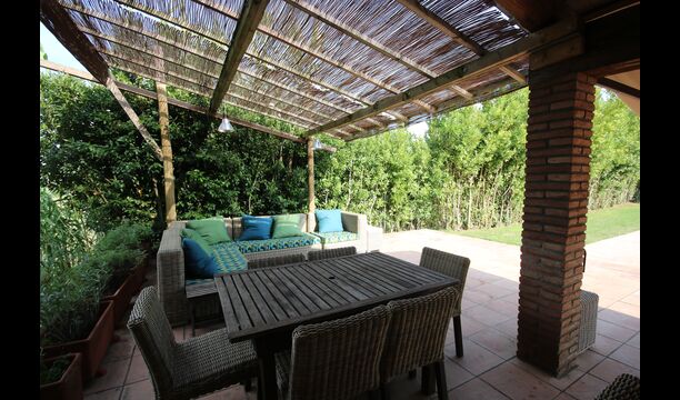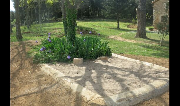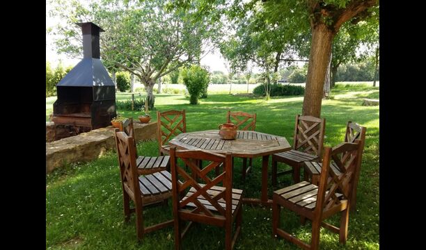 A l'exterior, davant de la casa, es troba una gran zona amb gespa amb molts racons ombrívoles creat pels arbres, on es pot prendre el cafè al matí o per relaxar-se amb un bon libre i una copa de vi. També hi ha una zona de jocs i gronxadors per als nens. Junt a la casa hi ha una terrassa amb una gran taula i una gran barbacoa.