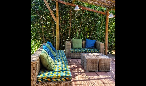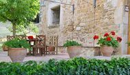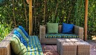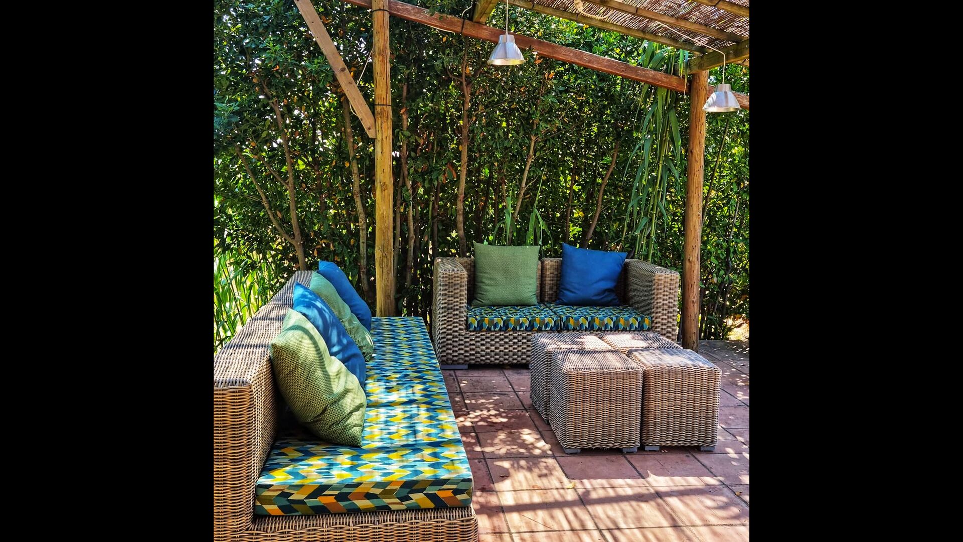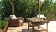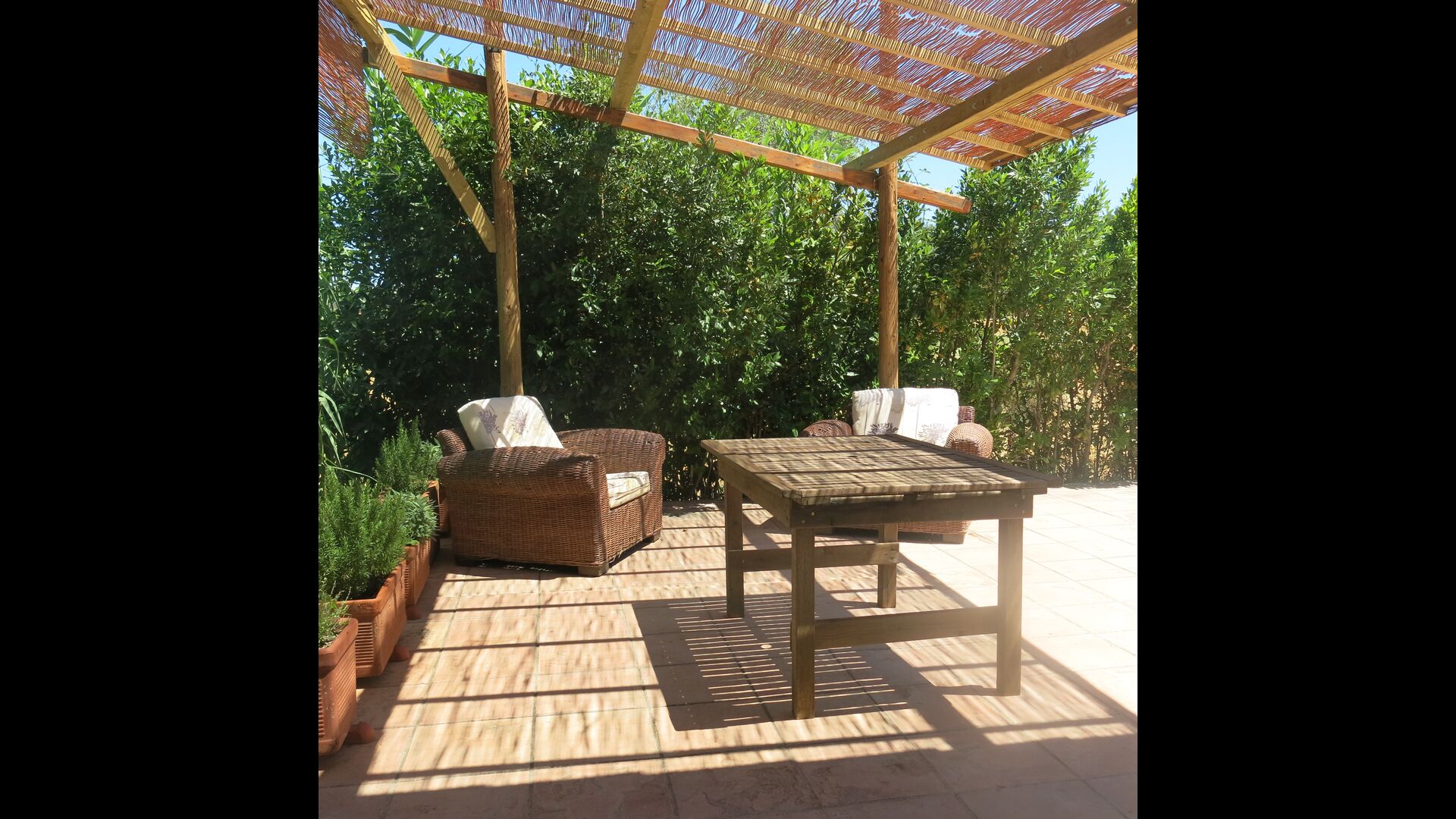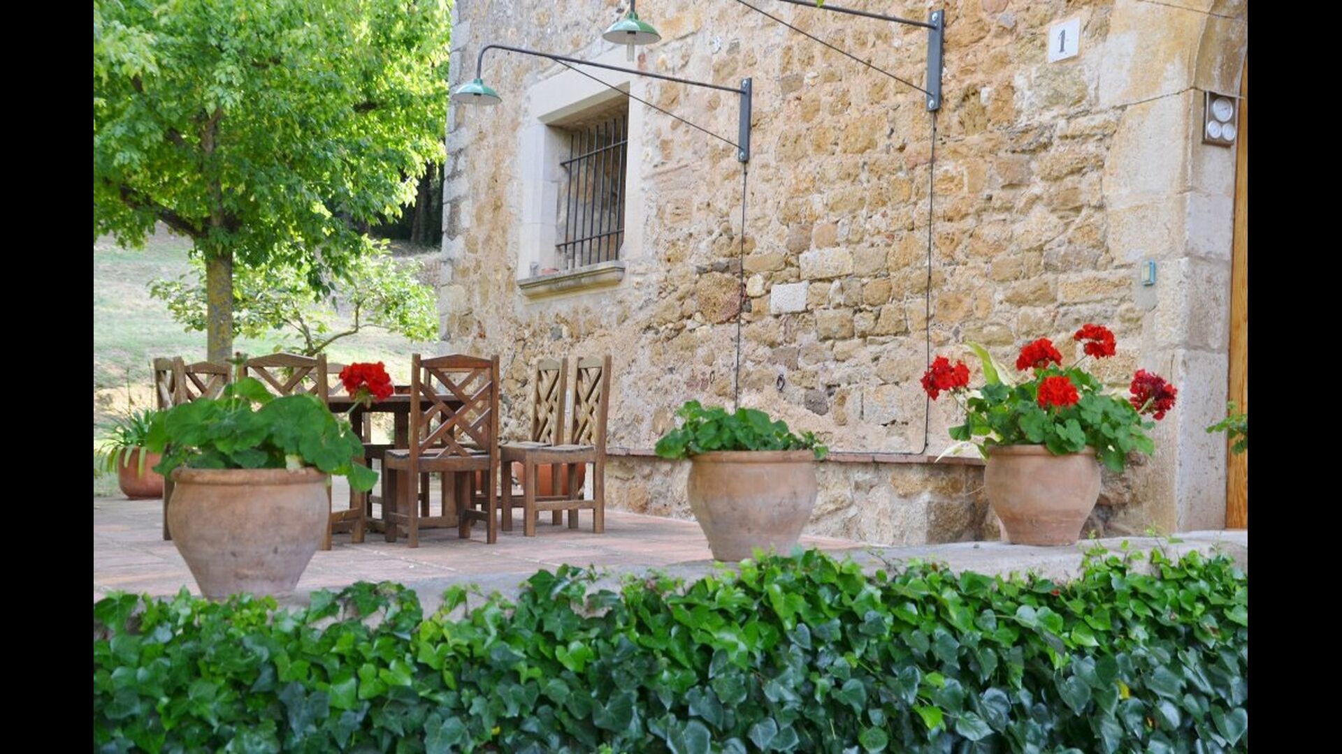 A l'exterior, davant de la casa, es troba una gran zona amb gespa amb molts racons ombrívoles creat pels arbres, on es pot prendre el cafè al matí o per relaxar-se amb un bon libre i una copa de vi. També hi ha una zona de jocs i gronxadors per als nens. Junt a la casa hi ha una terrassa amb una gran taula i una gran barbacoa.