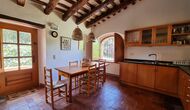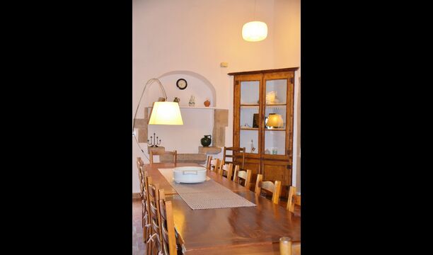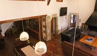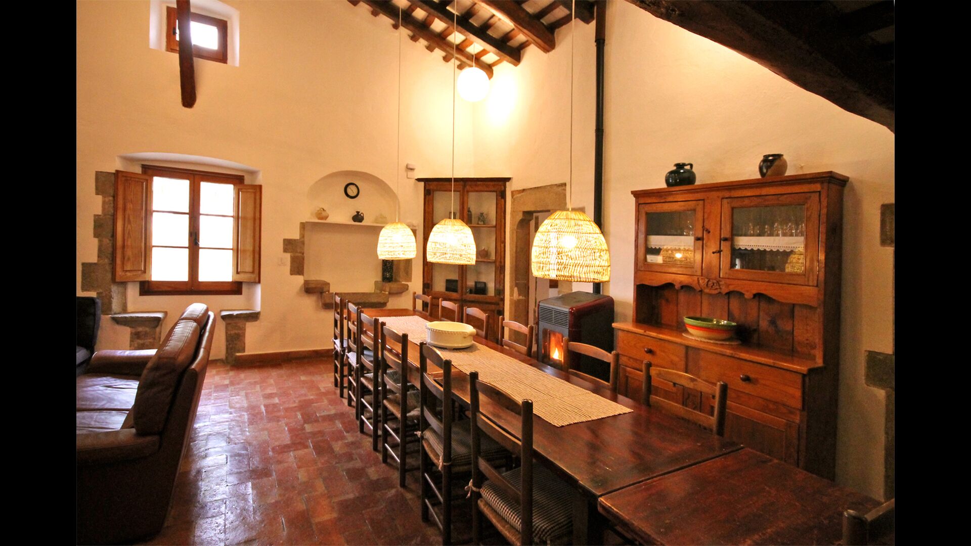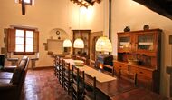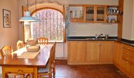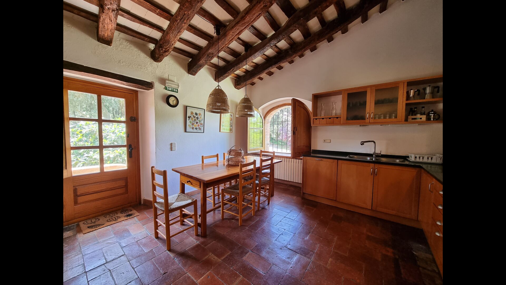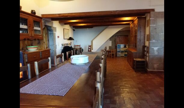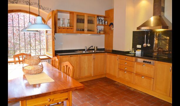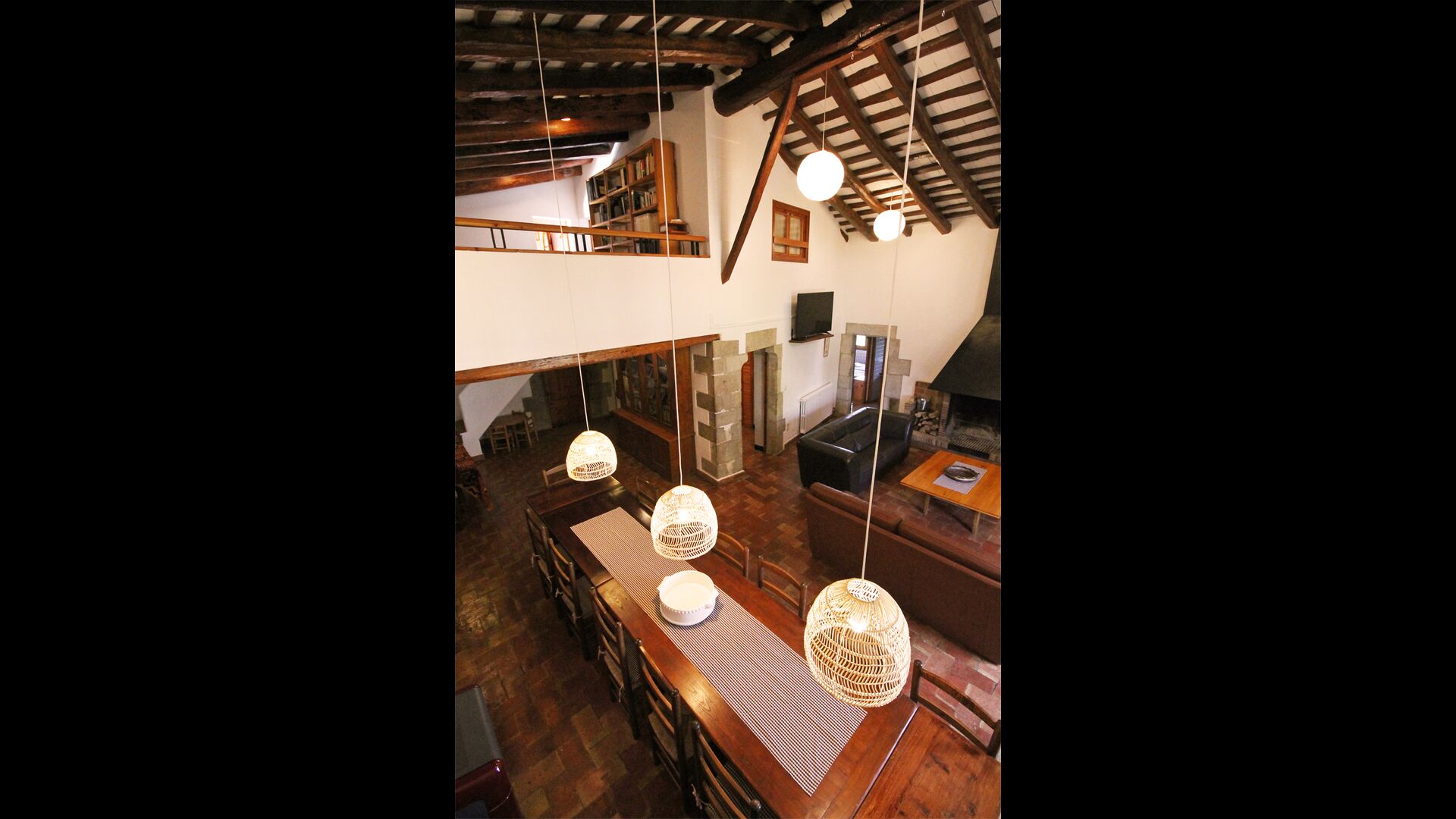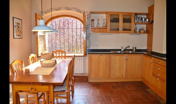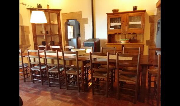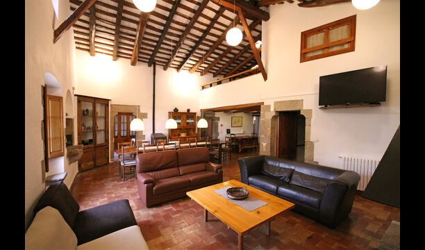 Al primer pis, hi ha una gran àrea comuna en un estil català molt típic, on es pot percebre la llarga història de la casa. En aquesta gran àrea, hi ha un sofà-cantonada amb TV i una gran taula de menjador. Junt a aquesta sala, hi ha una cuina totalment equipada (rentavaixelles, cuina, plaques elèctriques, nevera americana, forn, etc.) amb un petit menjador. A la casa, hi ha connexió a internet i WIFI.