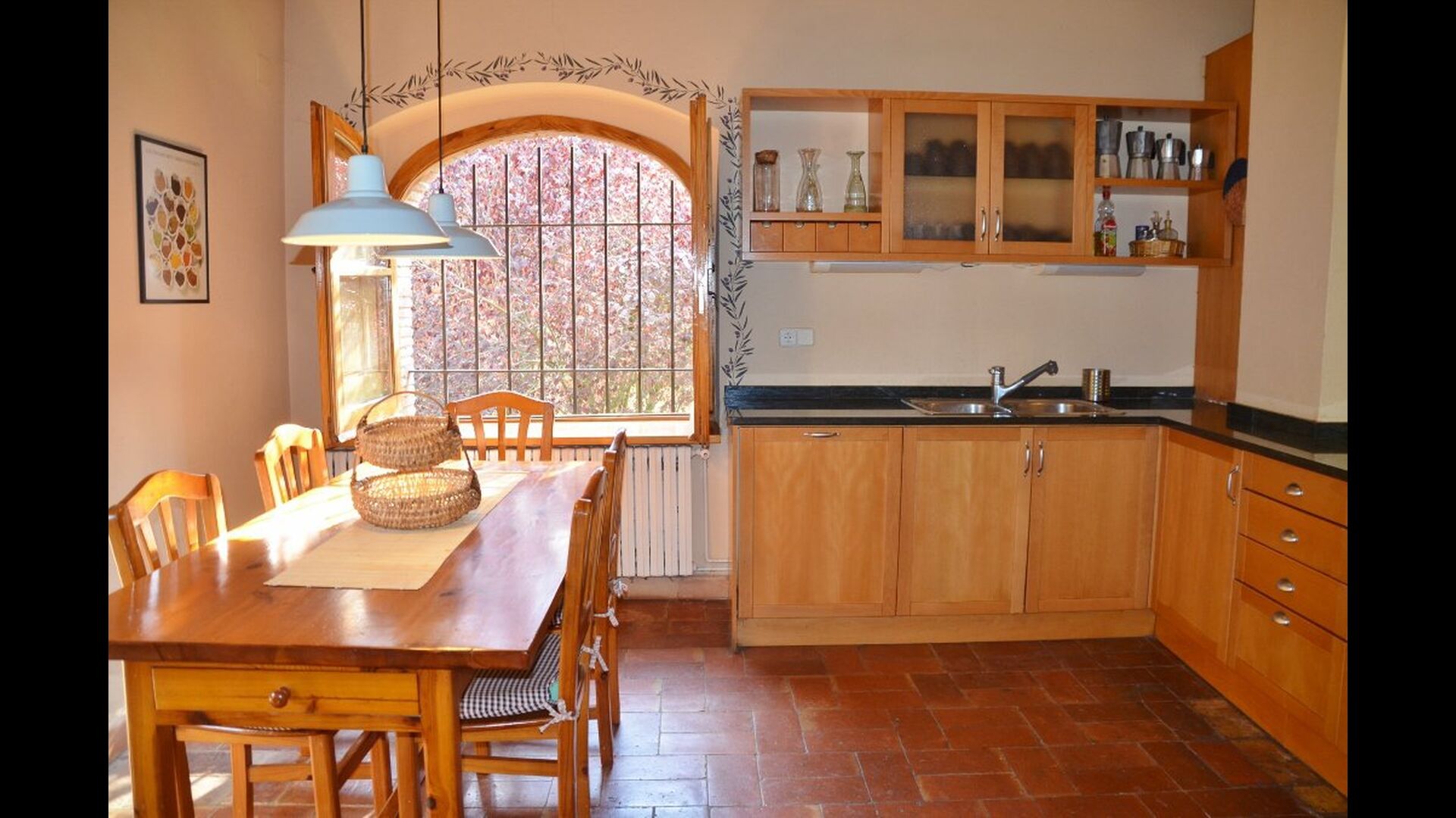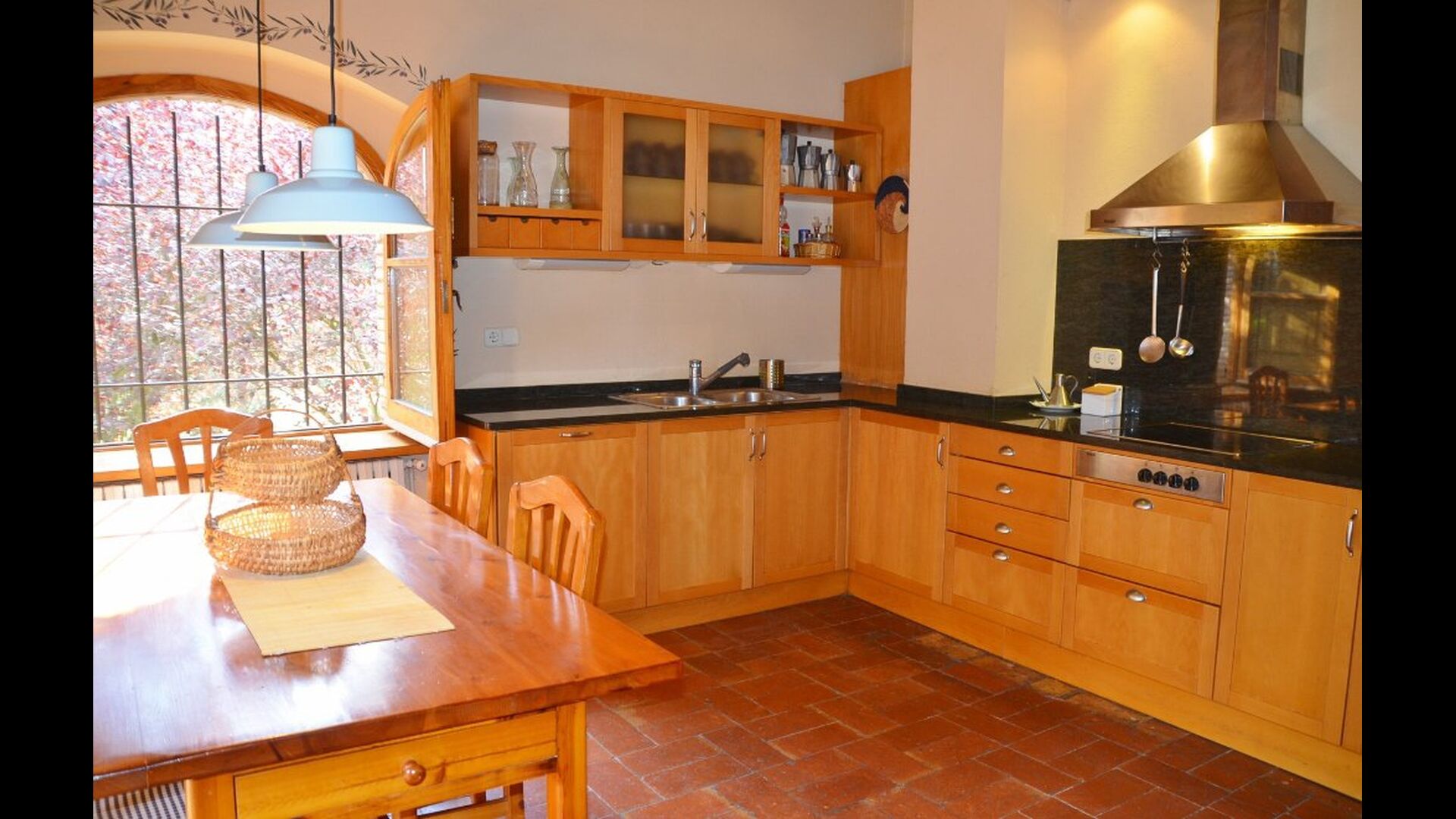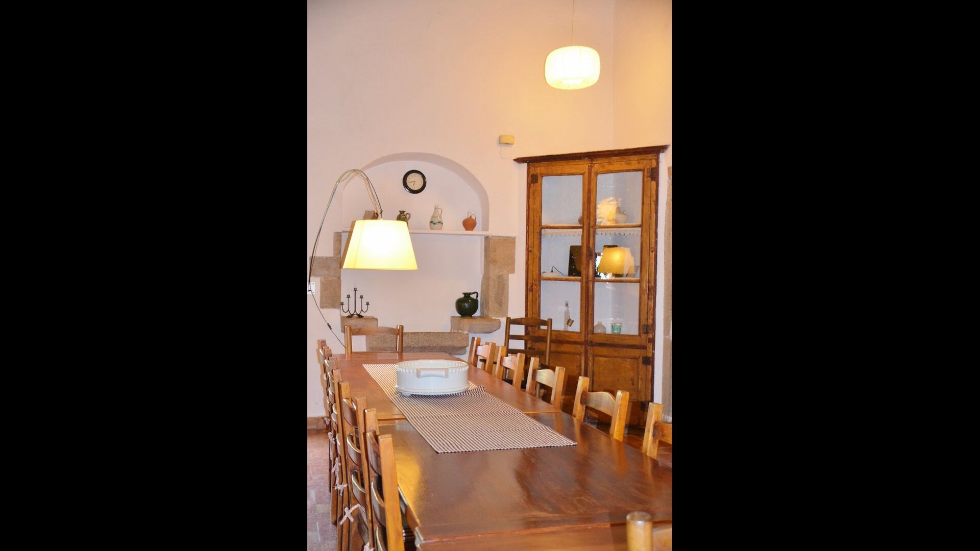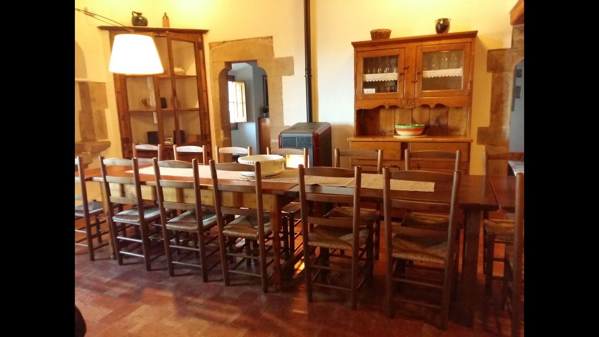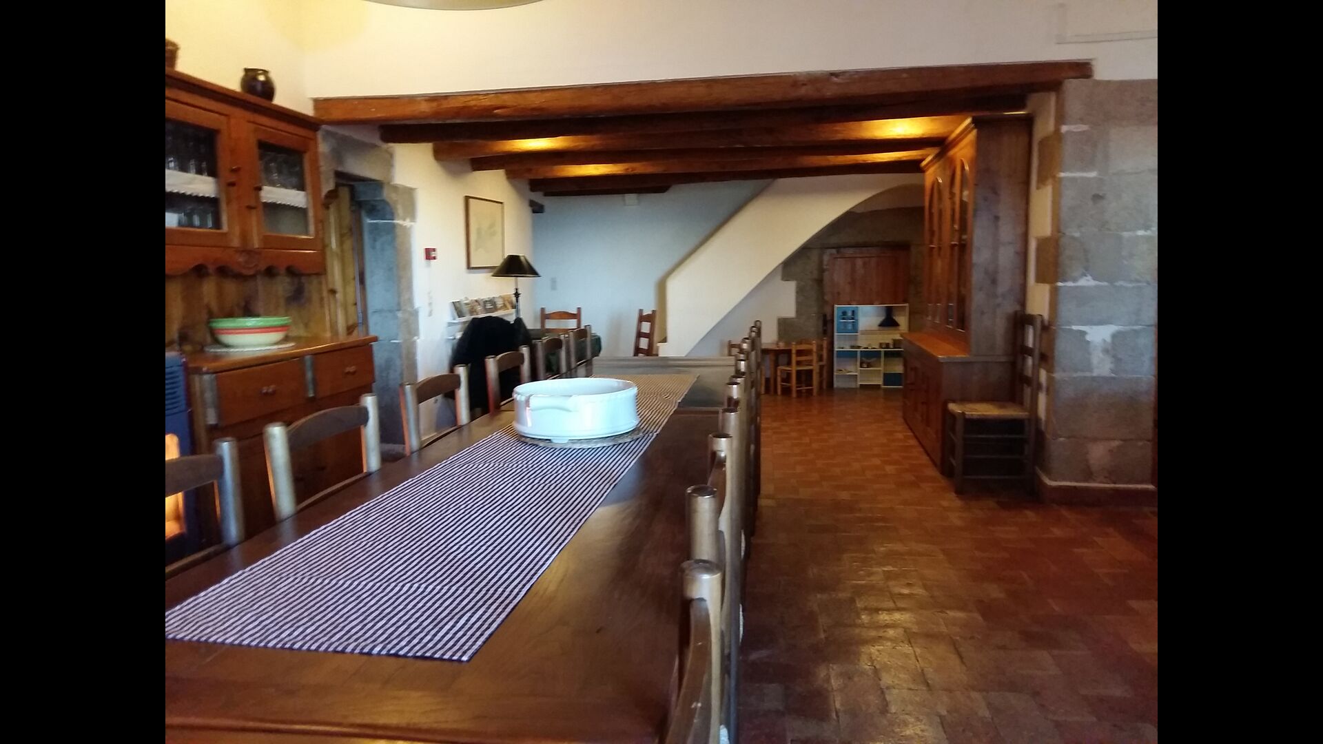 Al primer pis, hi ha una gran àrea comuna en un estil català molt típic, on es pot percebre la llarga història de la casa. En aquesta gran àrea, hi ha un sofà-cantonada amb TV i una gran taula de menjador. Junt a aquesta sala, hi ha una cuina totalment equipada (rentavaixelles, cuina, plaques elèctriques, nevera americana, forn, etc.) amb un petit menjador. A la casa, hi ha connexió a internet i WIFI.