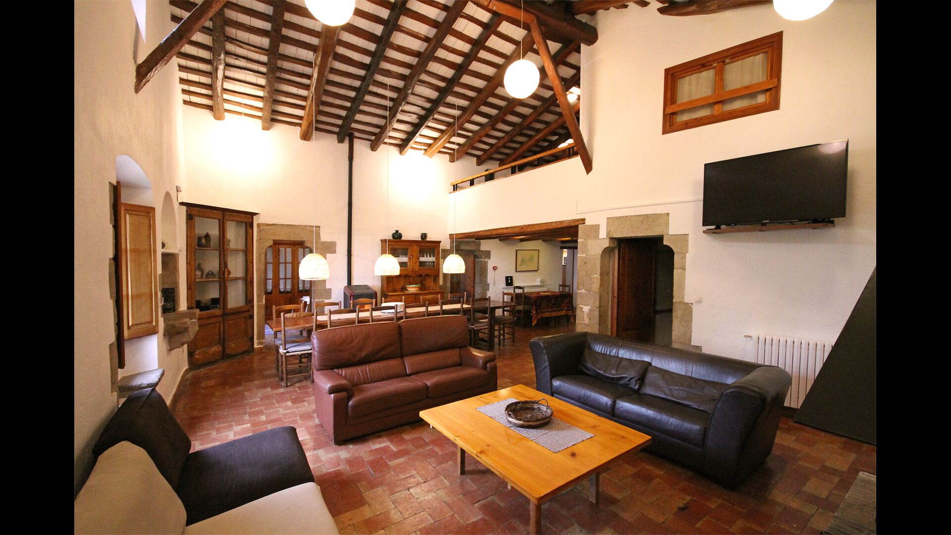 Gran sala comuna amb menjador, sofàs, TV