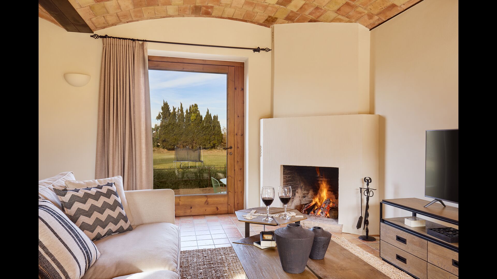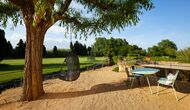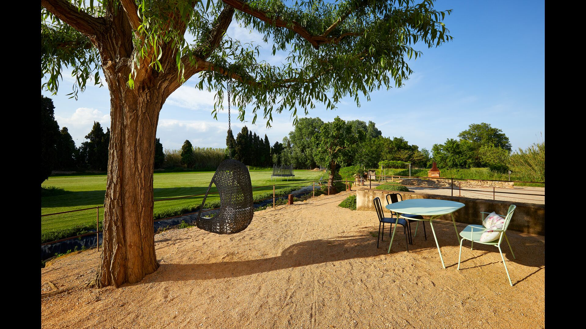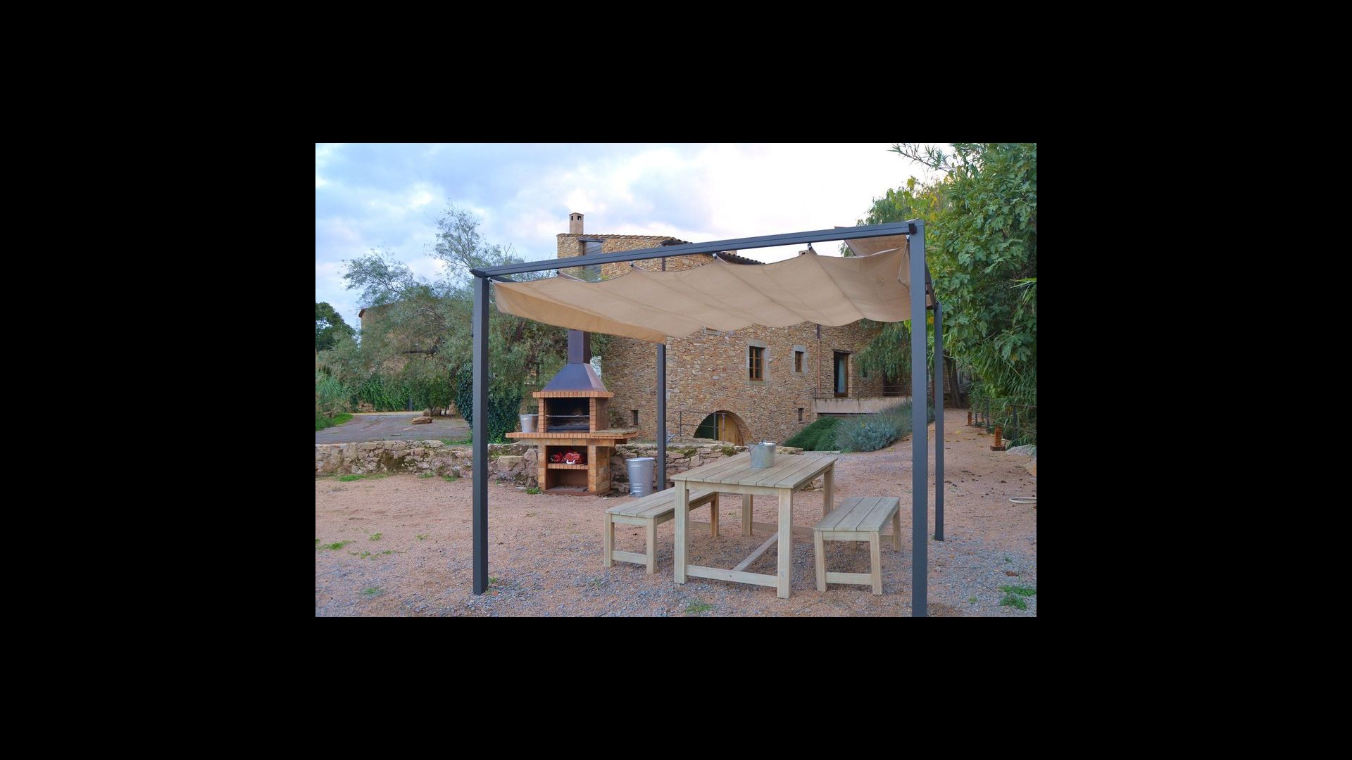 Outside there is a relatively large garden area. There is a shared pool with a size of 50m2. This is a sure hit among the kids that surely will spend lots of time in it. Especially during the summer months, when it is very hot in Cataloni. It is an essential facility because you can be cooled down in a very short time. In addition, there is a large BBQ grill in the garden with a belonging covered dining table, where you can enjoy the freshly prepared food during the warm Catalan evenings. In addition, there are several seating areas around the garden. For the smaller group is a small playground with playhouse and swings.