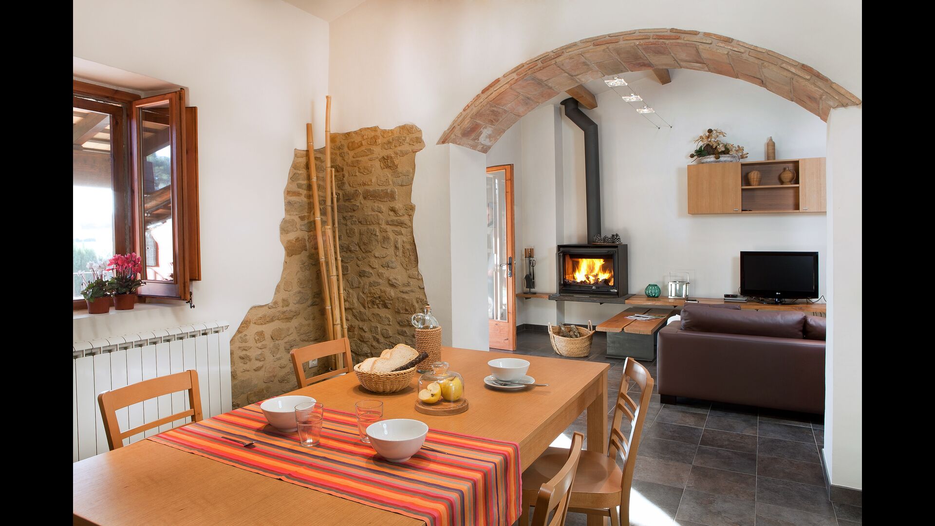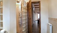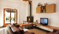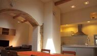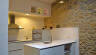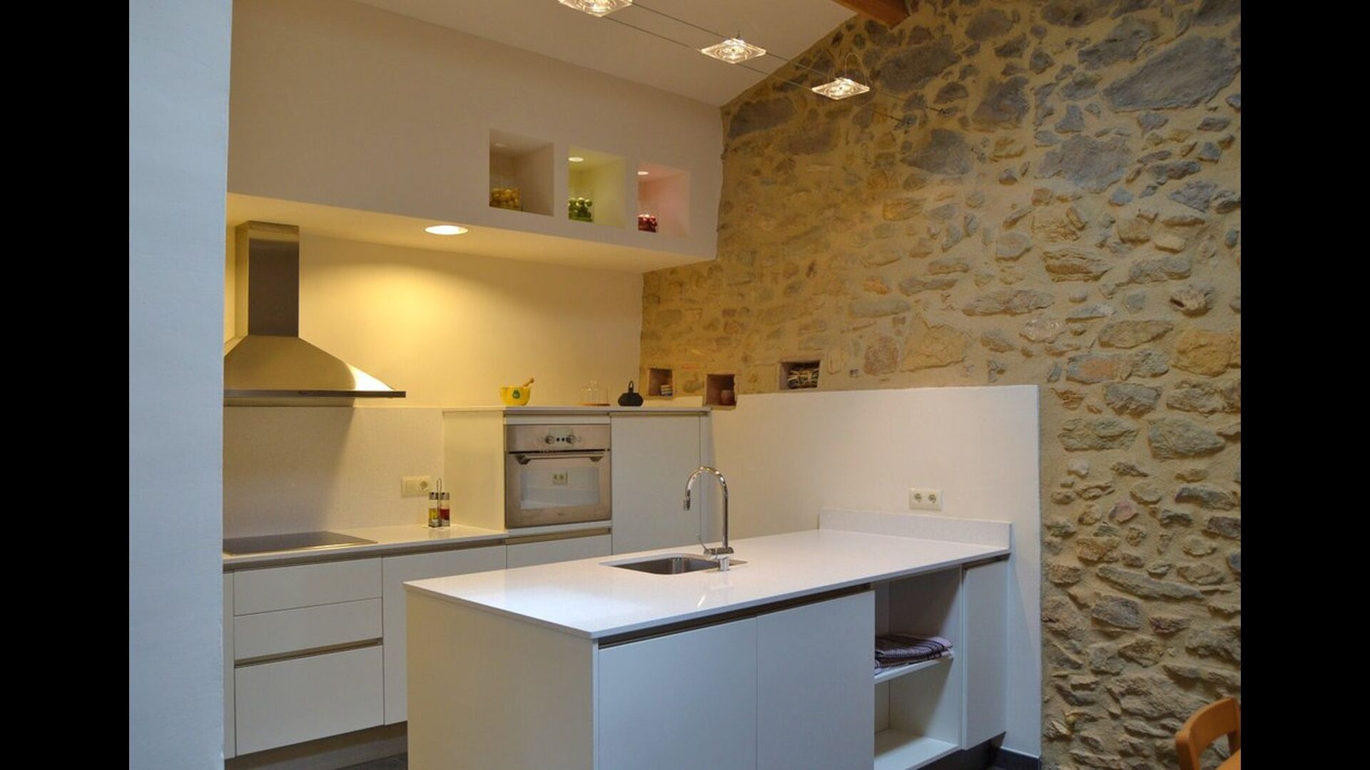 The very beautiful and modern living room has a sofa corner with a TV, as well as an open and well-equipped kitchen and a nice dining table. The stone walls in this room combined with the white walls provide an authentic, but new atmosphere. The apartment has a private terrace overlooking the garden and the beautiful surroundings, and here is also a dining table where the homemade food can be enjoyed in the warm Catalan evenings.