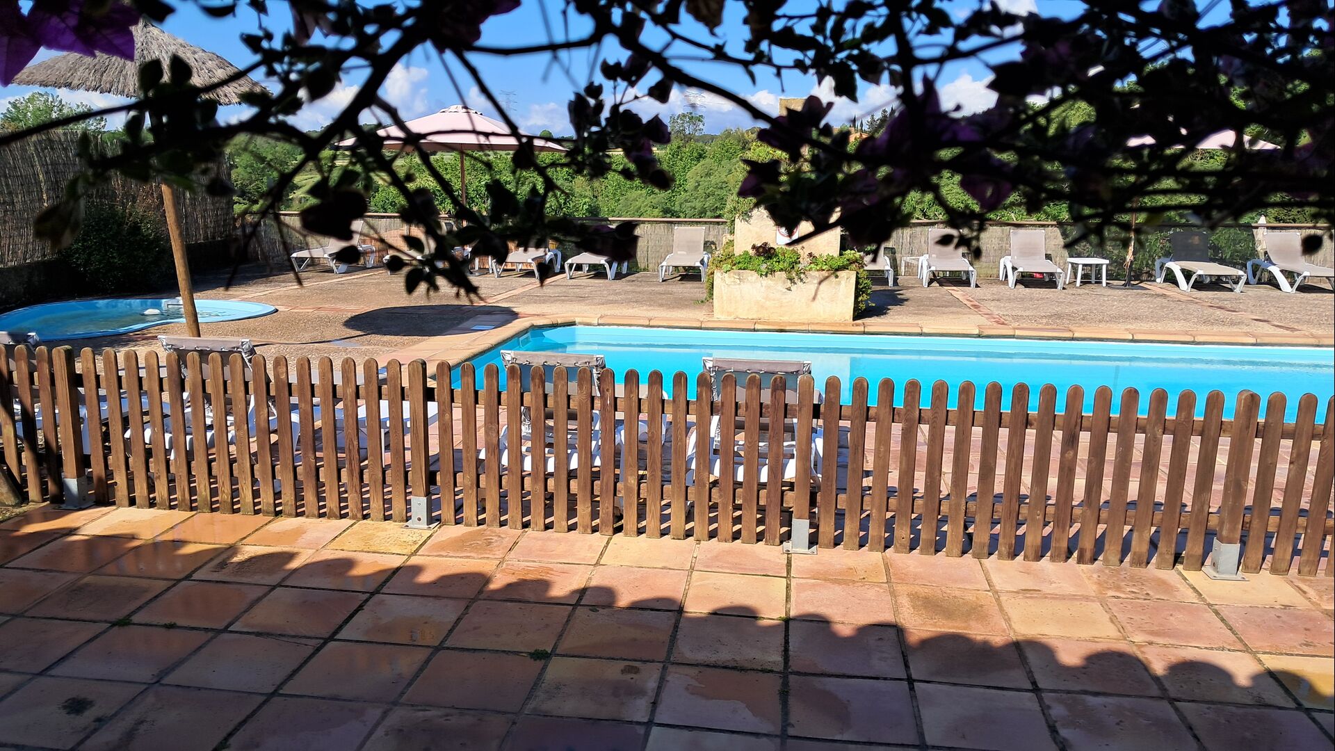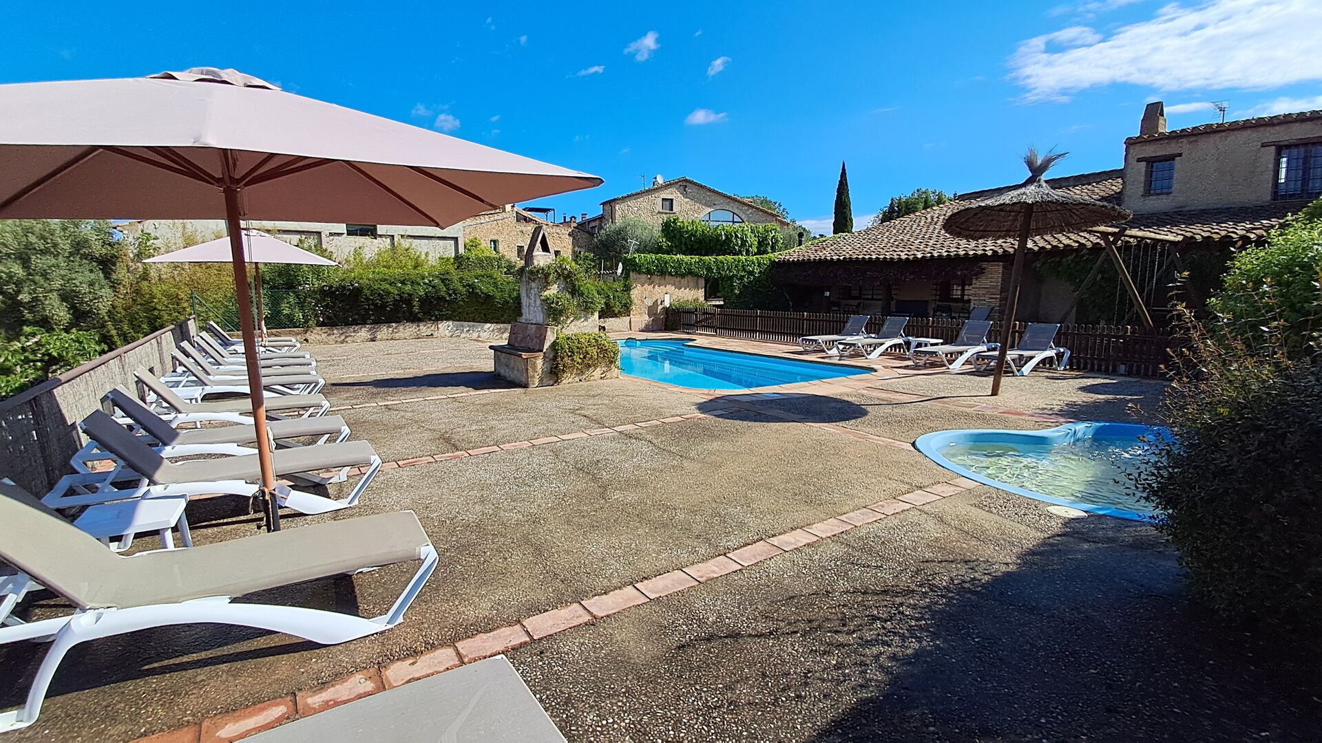Una és la piscina comuna compartida, amb una piscina rodona separada per als nens. Les dues piscines es troben a la mateixa zona, que està tancada. També hi ha diverses gandules per descansar i relaxar-se. A l'altre costat de la tanca, hi ha un gronxador per als nens. També hi ha la zona de barbacoa, una terrassa coberta, amb cadires, una taula petita i un sofà de pedra adossat a la paret. Al jardí també trobareu una instal·lació de ping-pong, una cistella de bàsquet i un camp de futbol petit.
