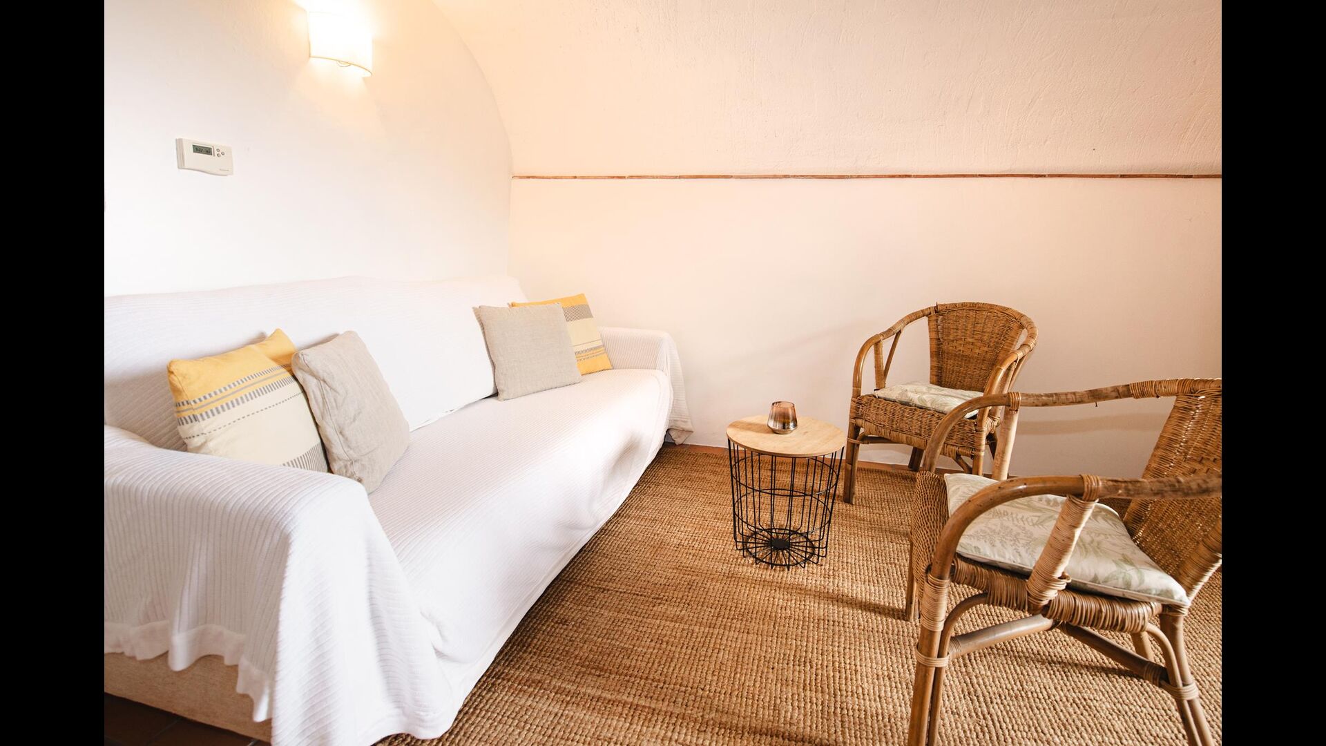 At the entrance to La Cort is a private terrace with a seating arrangement consisting of wooden chairs and table. Just inside the door is the cosy living room with sofa and satellite TV.
