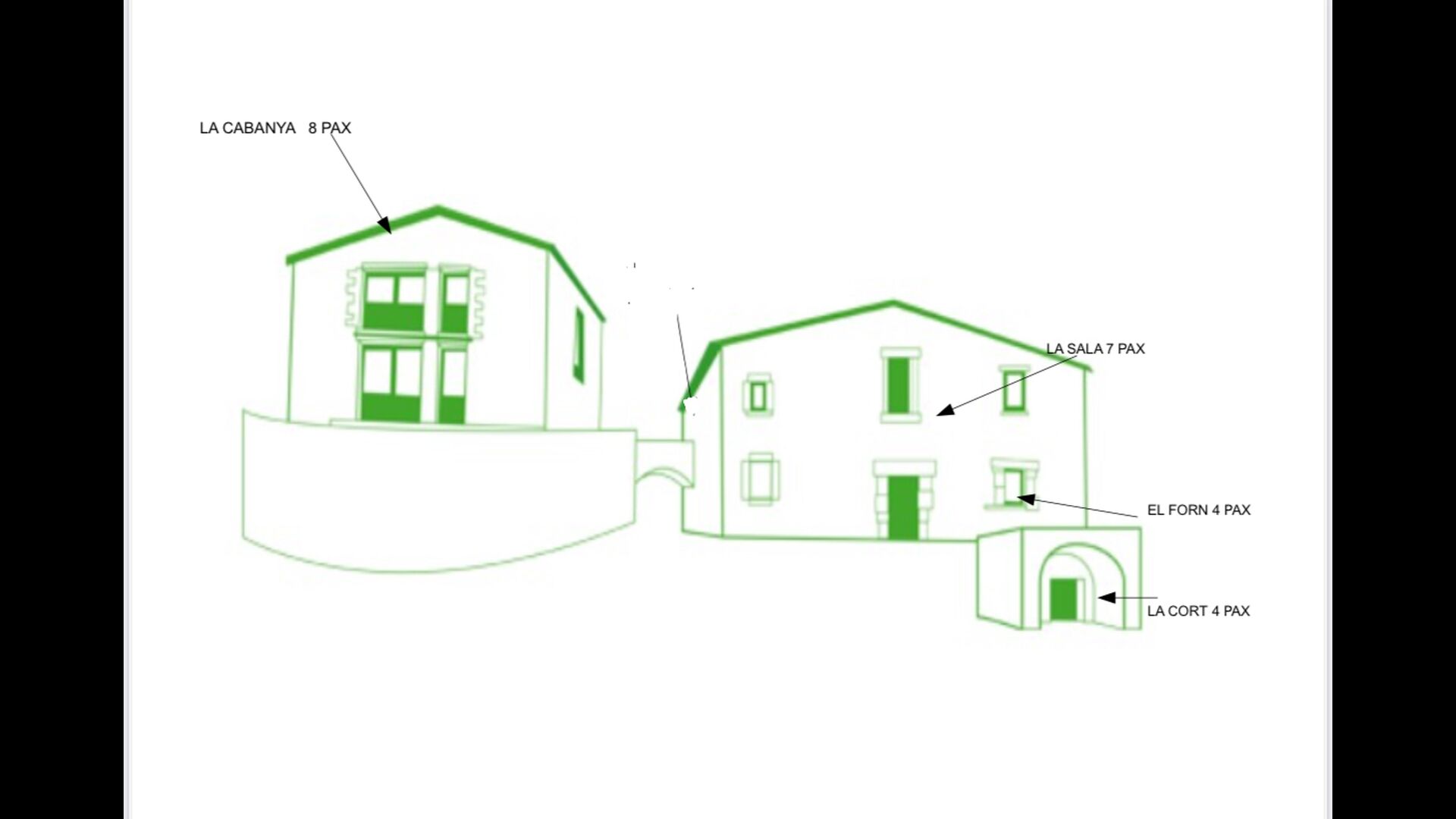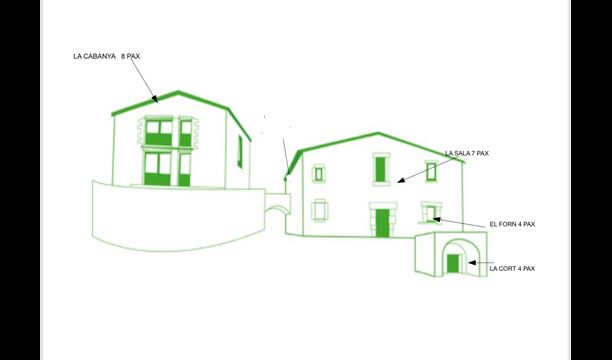 La propietat es divideix en quatre apartaments, però també es pot llogar com una gran propietat, ja que hi ha un gran menjador amb molt espai per a un gran grup de fins a 23 + 3 persones.