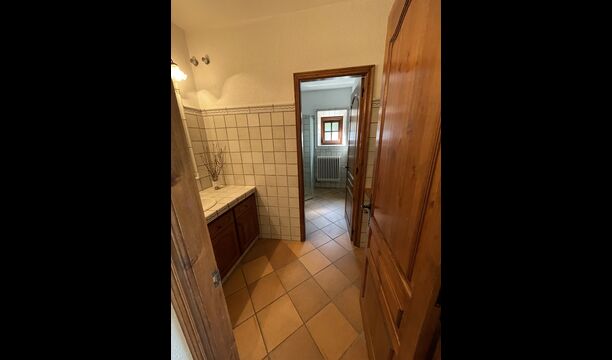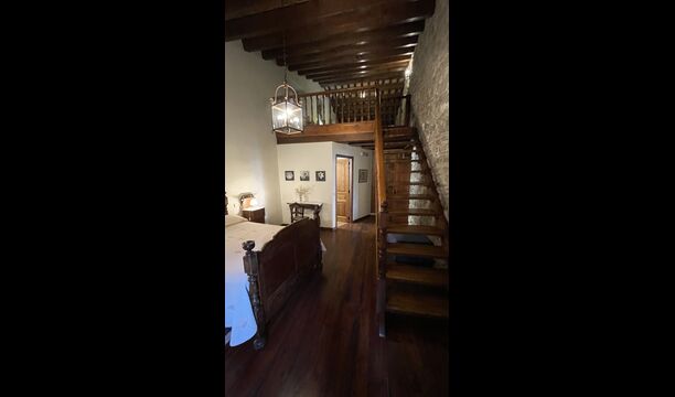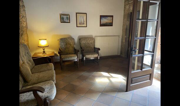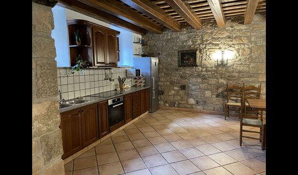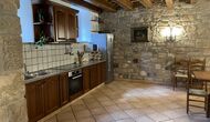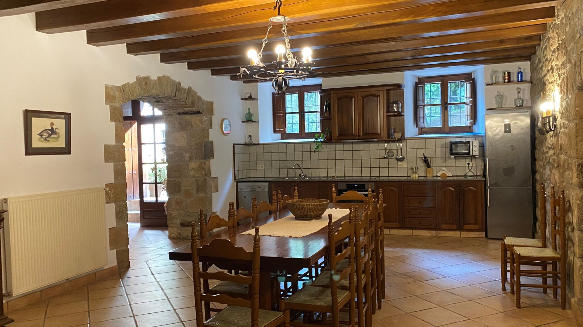 From the other side of the house, also on first floor , you enter the unit “Exida”. The first room is a big common room with a double dining table, a toilet. There is a dining area and another fully equipped kitchen with dishwasher, oven, hot plates, microwave etc. As decoration, the old oven build in the wall to make bread has been preserved.