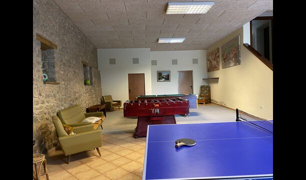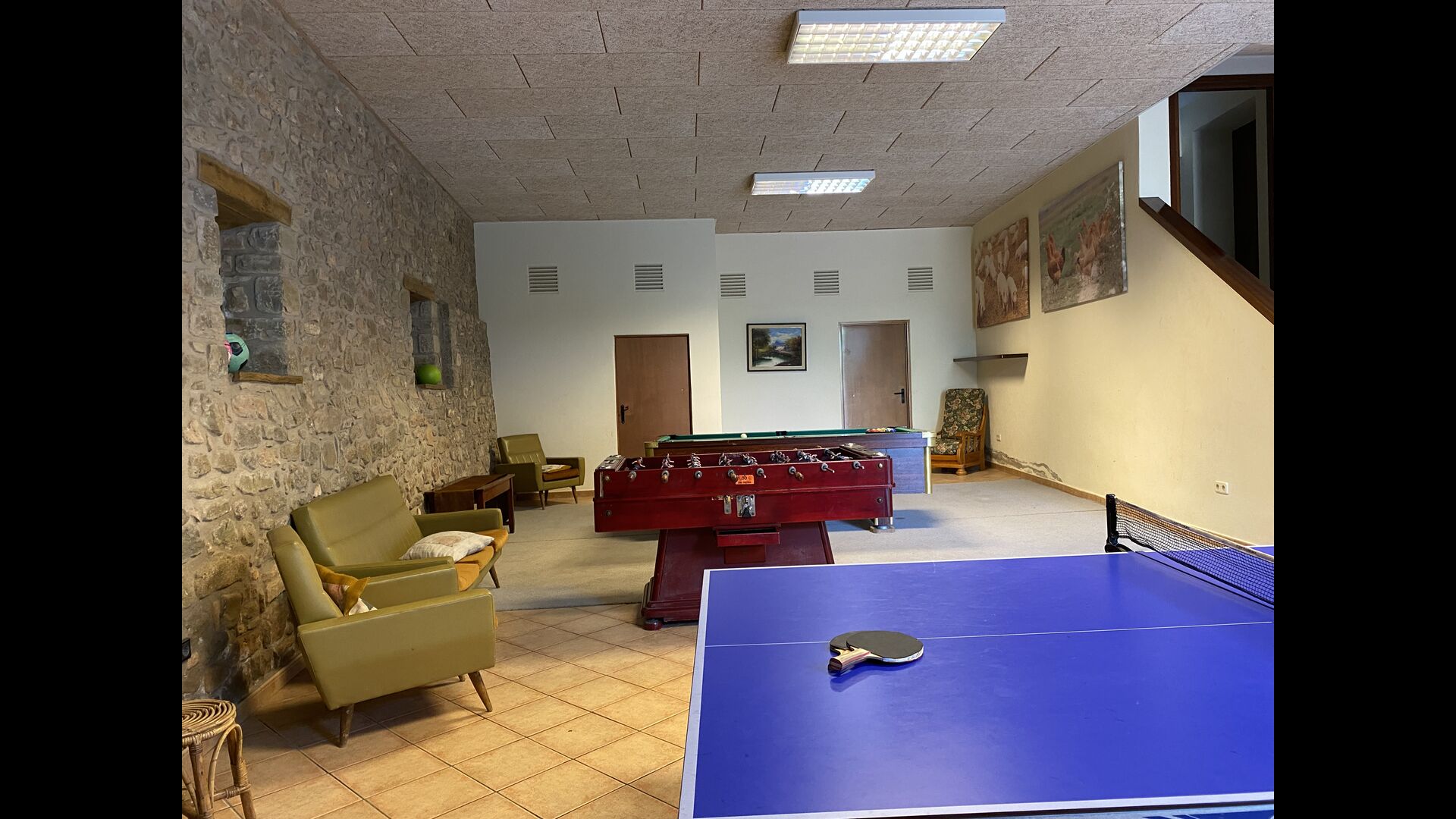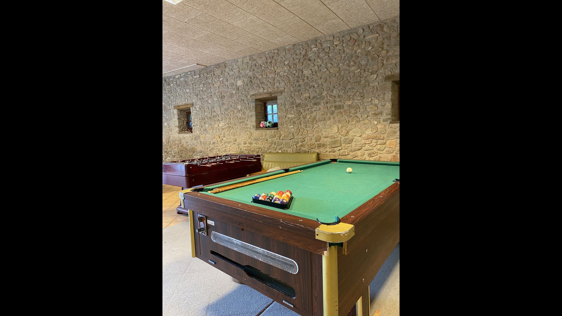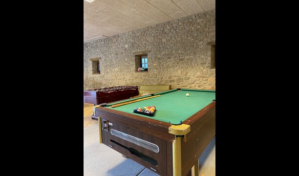 Downstairs, there is an activity room with table tennis, billiards and table football and a depot room with 3 washing machines and 3 cots and a high chair, which can be set up if necessary.