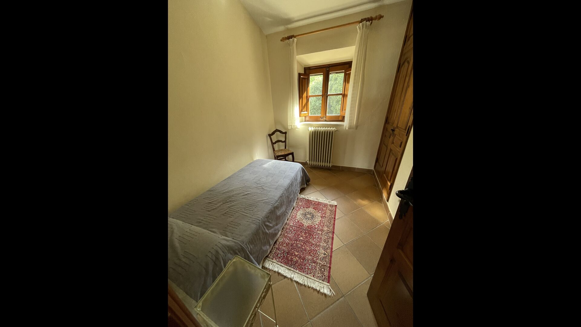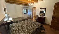 By climbing the stairs to the first floor, you enter the “Mirador” unit. This apartment has a huge terrace with a wonderful view over the landscape. It is the obvious place to gather, when you are a big group. Also the common room inside is huge and with high ceiling. There is a dining table, a sofa corner with TV and access to the separate kitchen with another dining area and dishwasher, oven, hot plates, microwave etc. There is access to 3 bedrooms, one double room, one twin room and one single room. There is one bathroom with shower.
