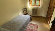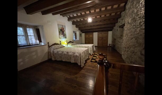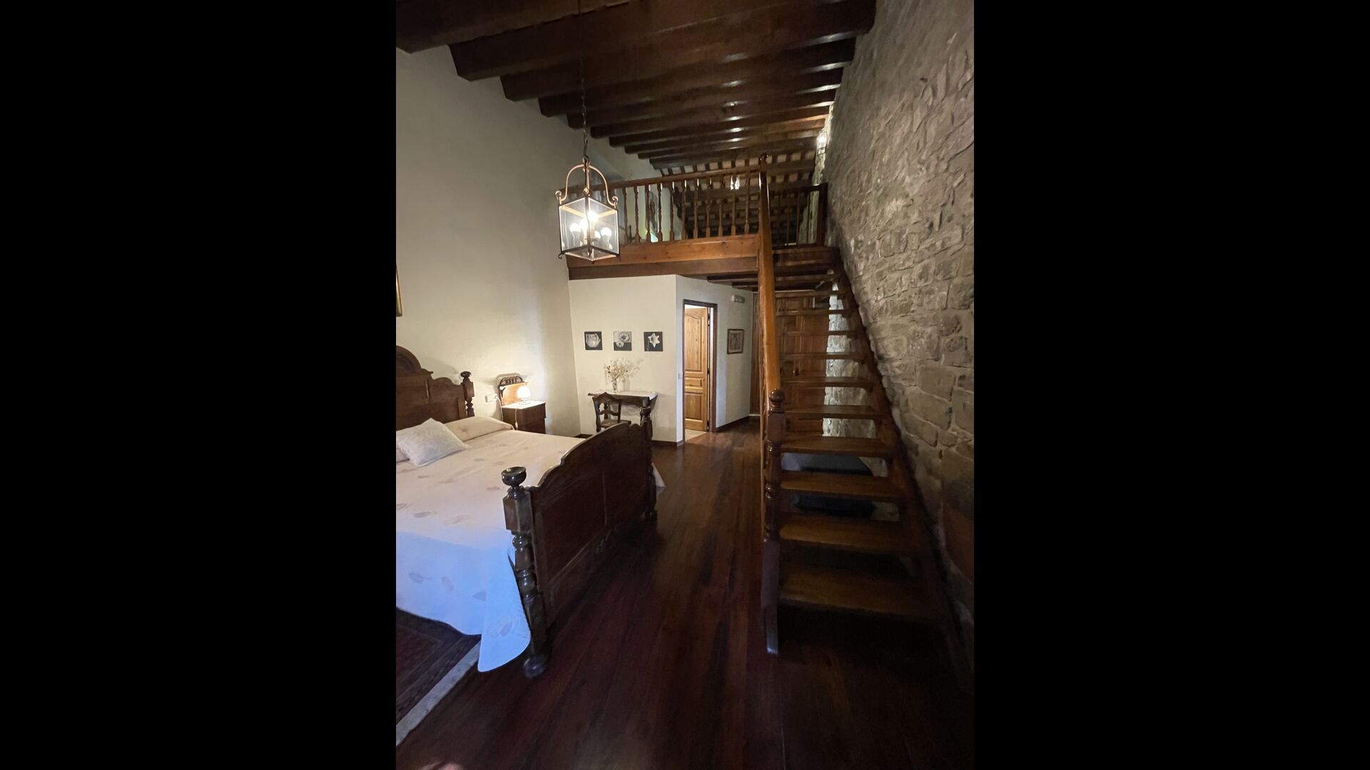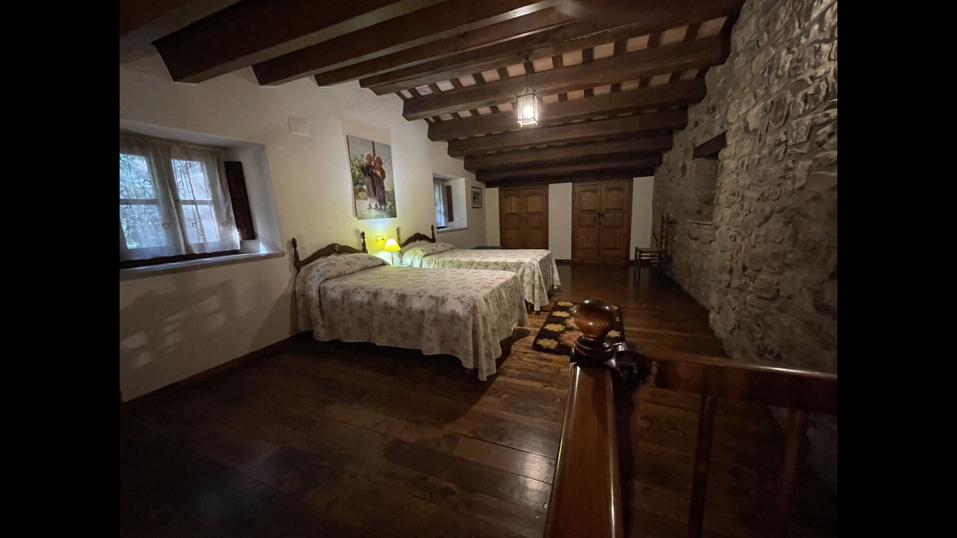 From the common room, there is access to a double room with bathroom with bathtub ensuite. On the other side of the common room, you can enter another double room with bathroom ensuite with shower. There is a very big bedroom with a double bed and two single beds and own bathroom with shower. There is a fourth double room with bathroom. Finally, there is a very spectacular room. There is a very high ceiling. In the level you enter, there is a double bed and a bathroom, and then inside the room, there is a stairway up to a loft with two single beds.