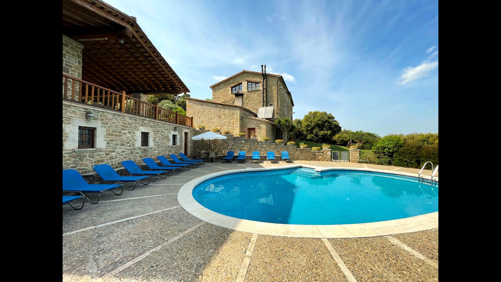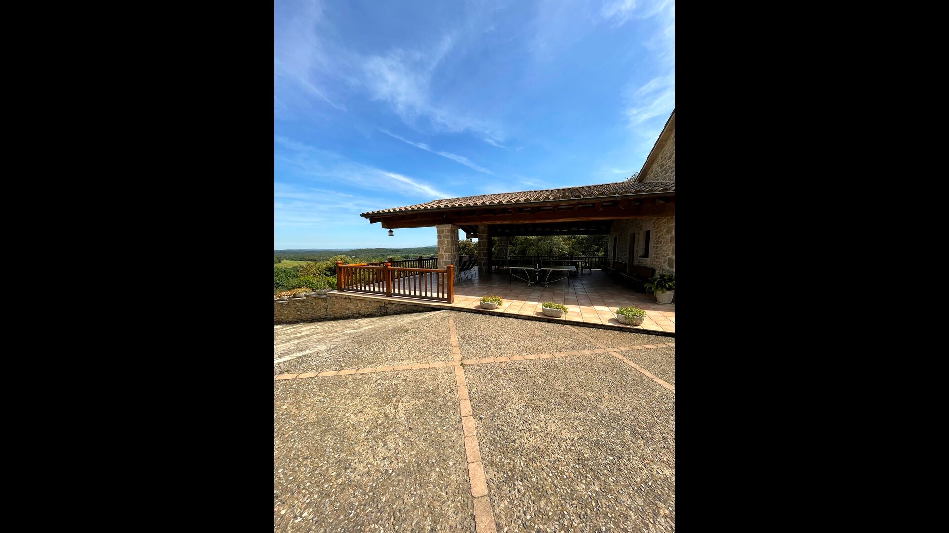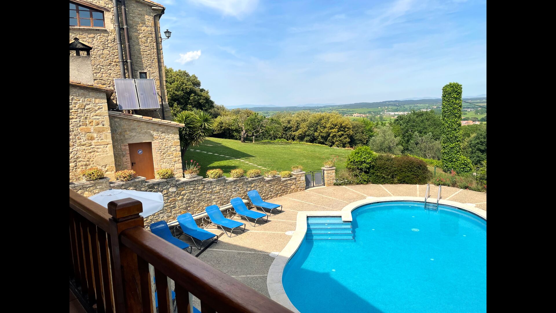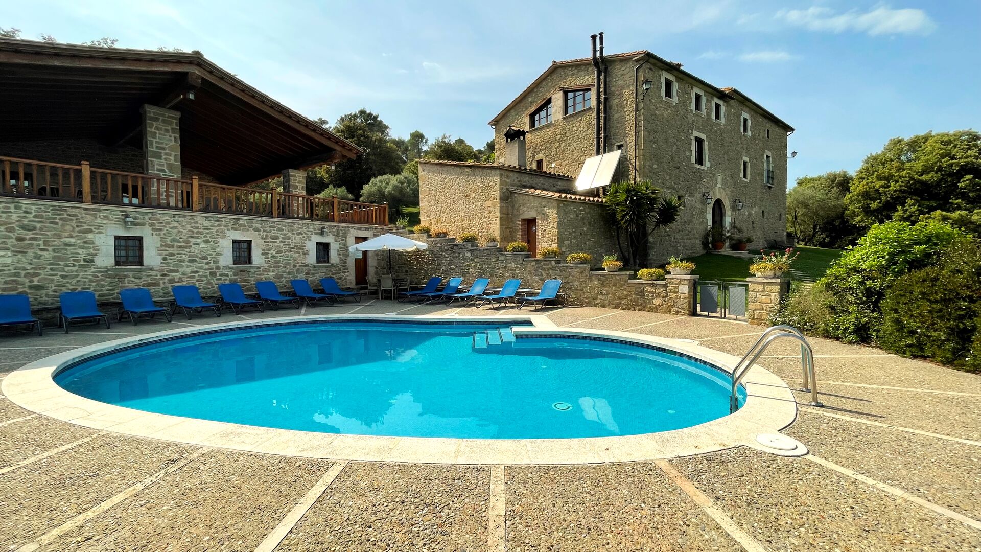 From the road, following in distance the shore of the idyllic Banyoles lake, you turn right to drive uphill through a tiny forest until you arrive to the impressive driveway in front of the house. The house has two buildings, the main building and the side building also called Masover. Below the building, you have the large pool area with sun loungers, or if you prefer the shade, you can enjoy life on the very big terrace one level above the pool area.