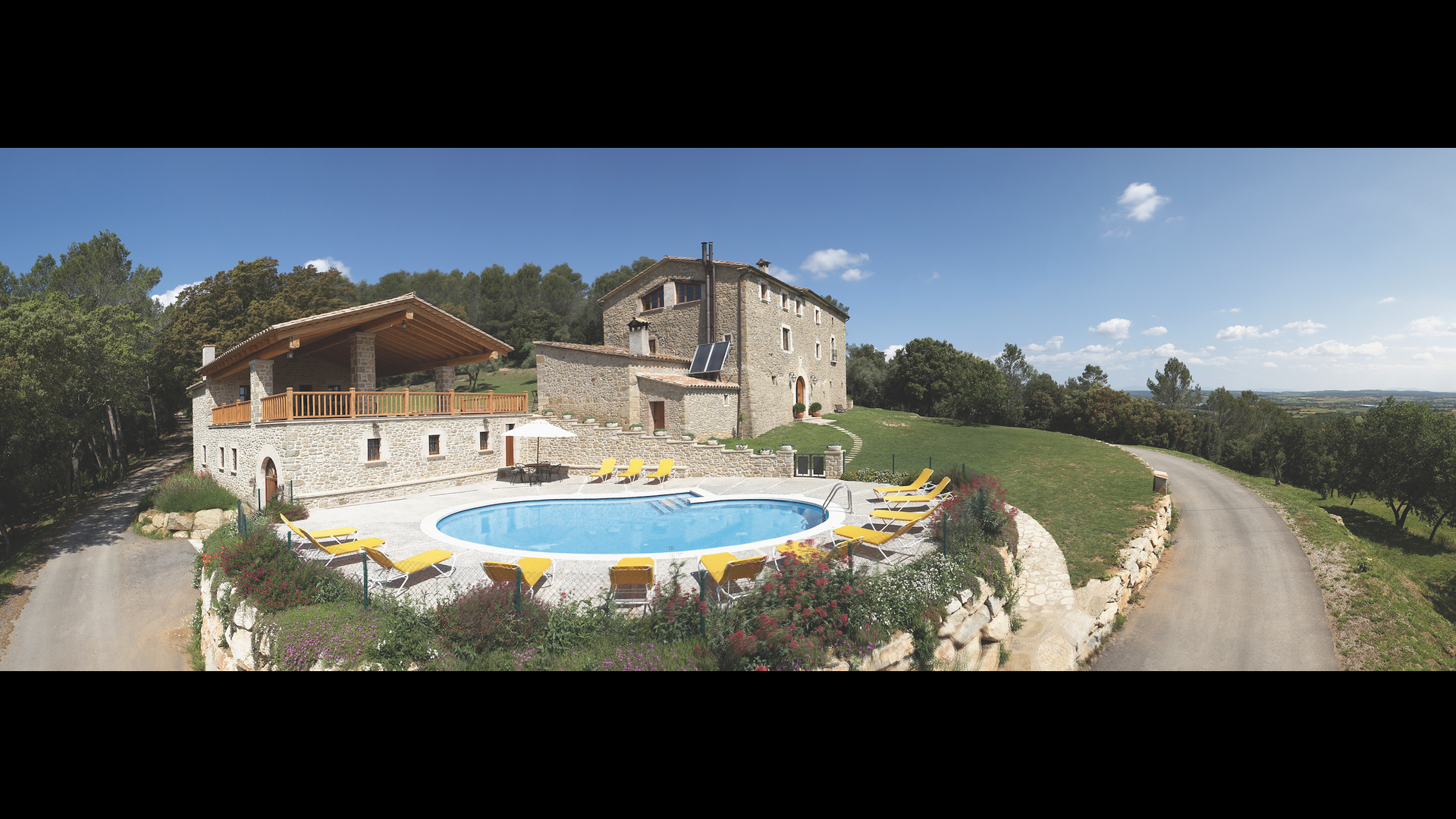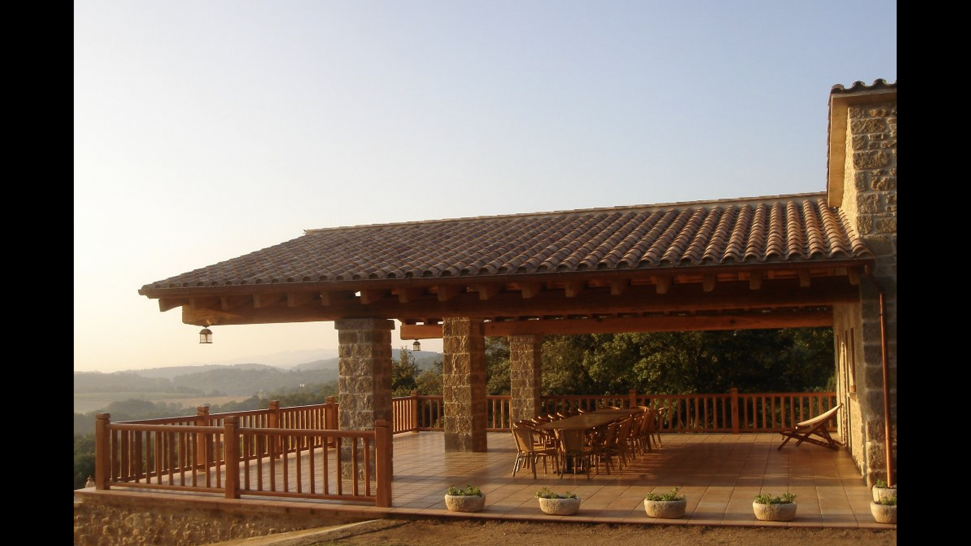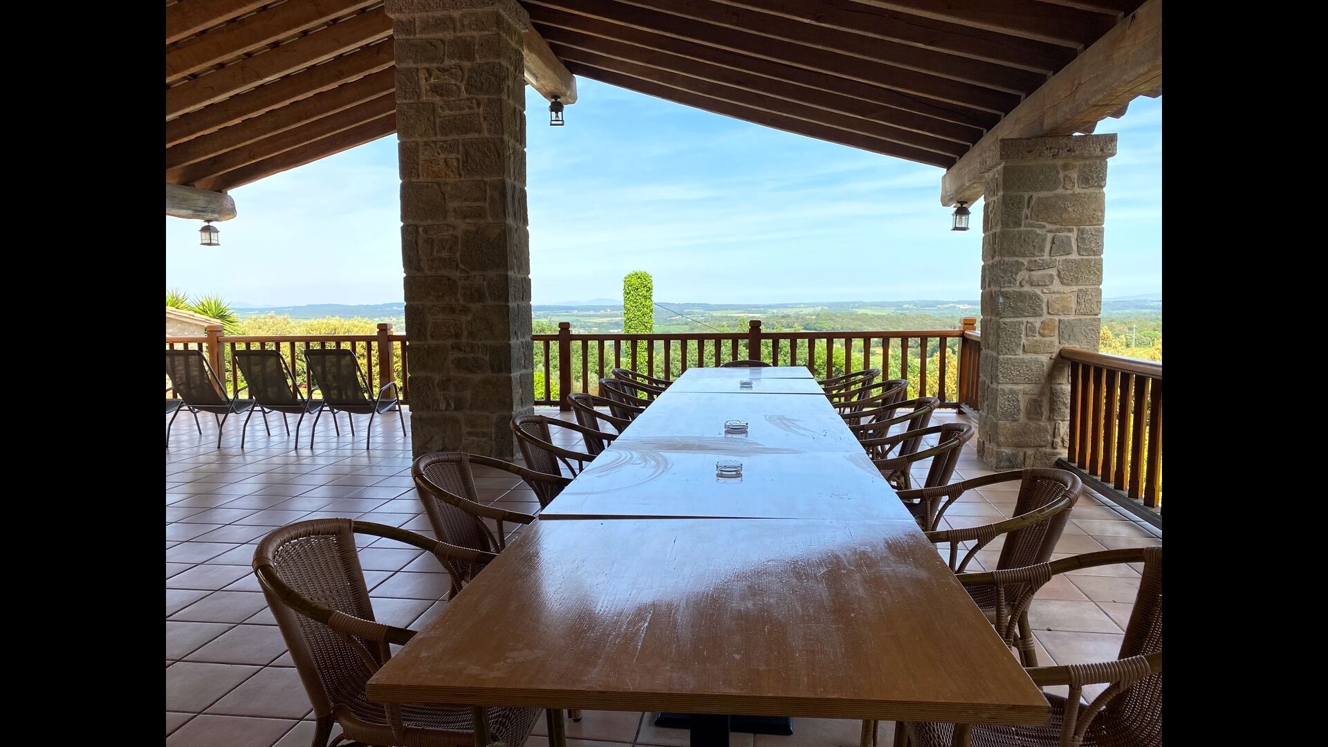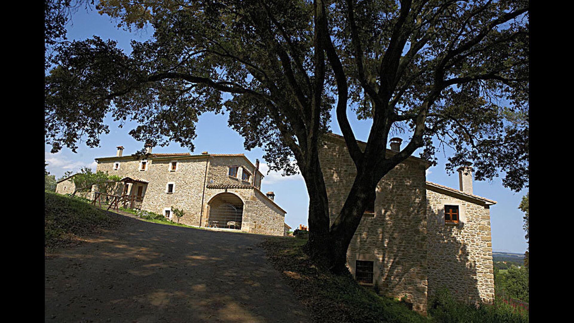 From the road, following in distance the shore of the idyllic Banyoles lake, you turn right to drive uphill through a tiny forest until you arrive to the impressive driveway in front of the house. The house has two buildings, the main building and the side building also called Masover. Below the building, you have the large pool area with sun loungers, or if you prefer the shade, you can enjoy life on the very big terrace one level above the pool area.