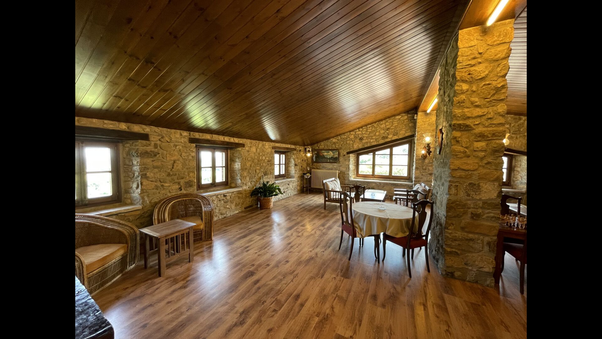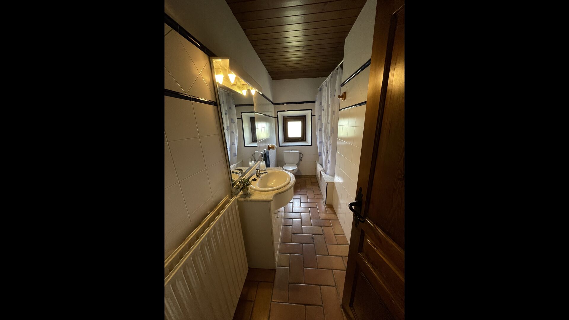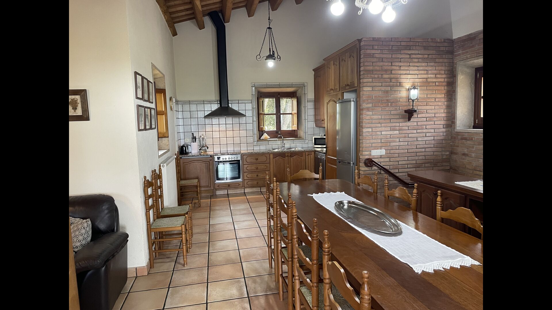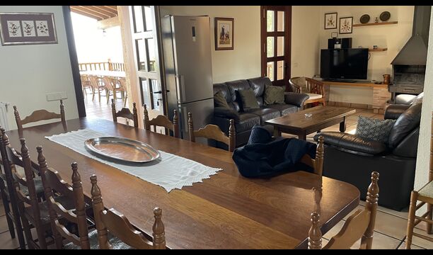 You have access to the Masover-building directly from the terrace to a big common room with dining area with a big dining table, open kitchen with hotplates, oven, microwave, dishwasher, fridge and freezer. Then there is a sitting room with TV and fireplace, and there is a toilet to be used upstairs and from the terrace.