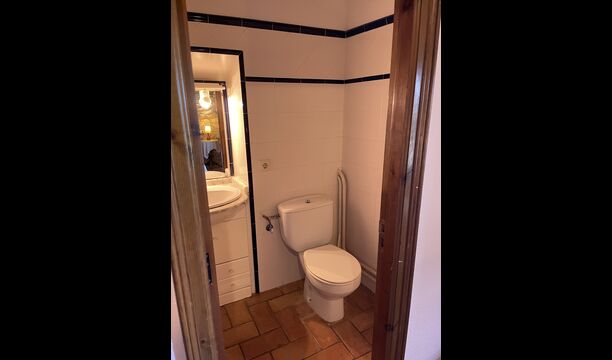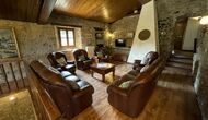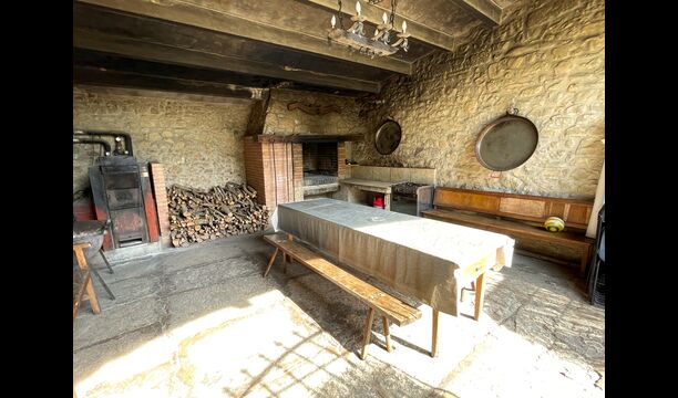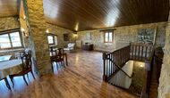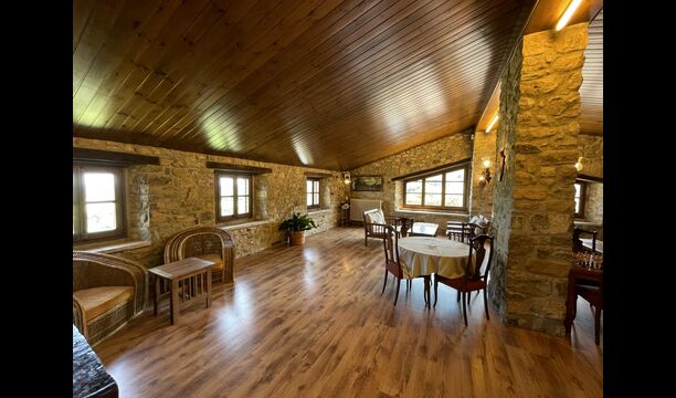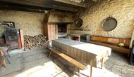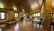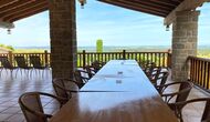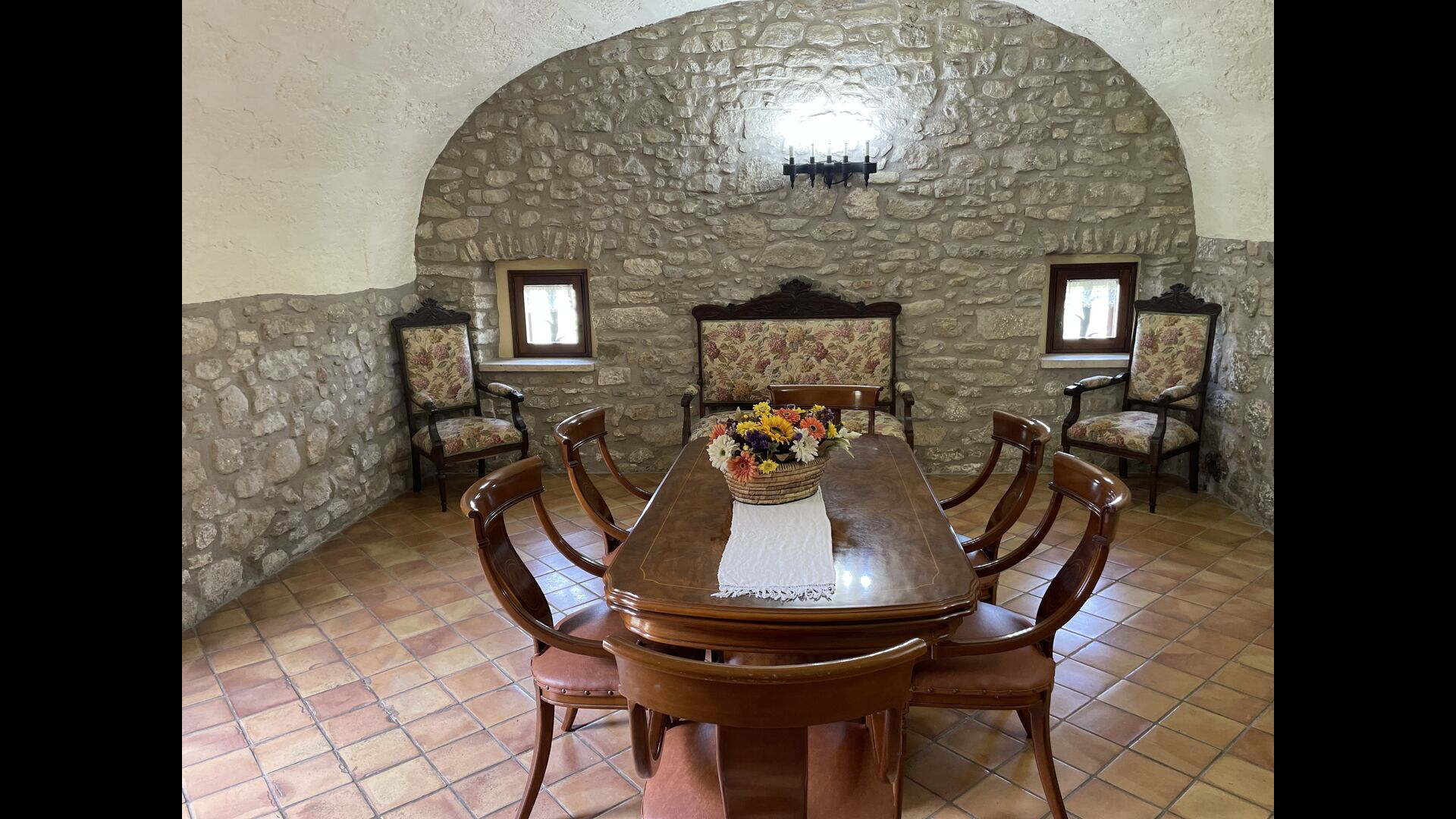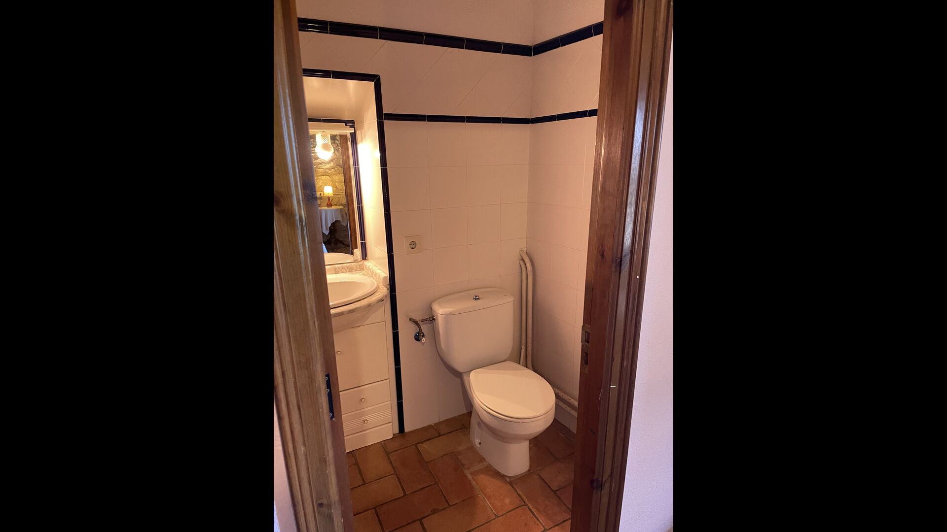 You have access to the Masover-building directly from the terrace to a big common room with dining area with a big dining table, open kitchen with hotplates, oven, microwave, dishwasher, fridge and freezer. Then there is a sitting room with TV and fireplace, and there is a toilet to be used upstairs and from the terrace.