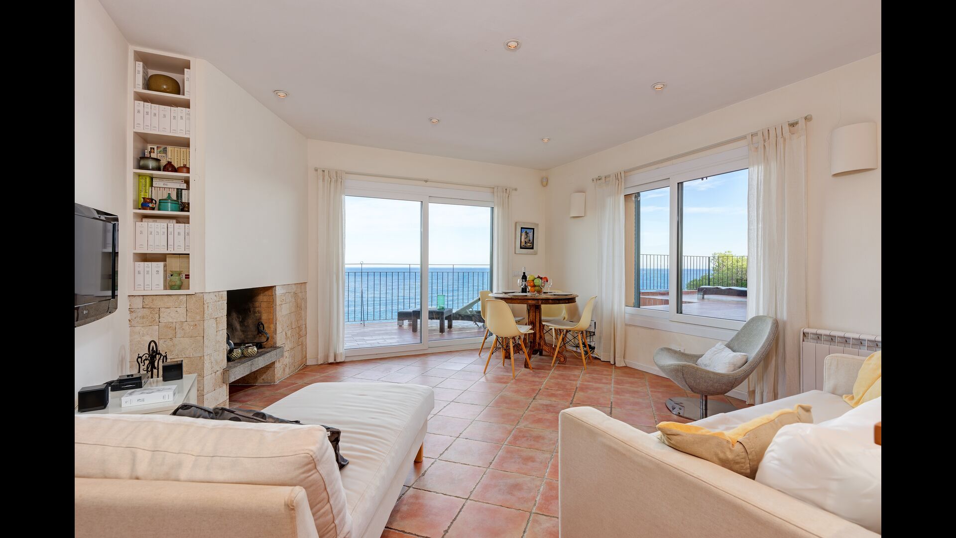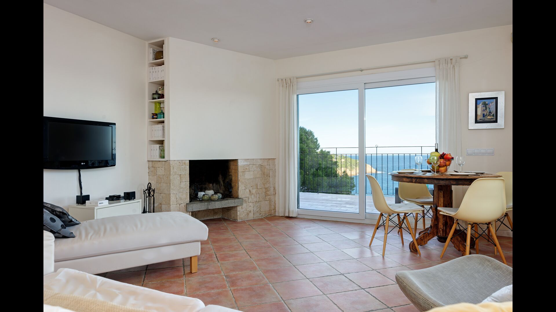 L'àmplia sala d'estar està equipada amb una gran llar de foc, dos sofàs, una cadira de disseny i un televisor a la paret.
