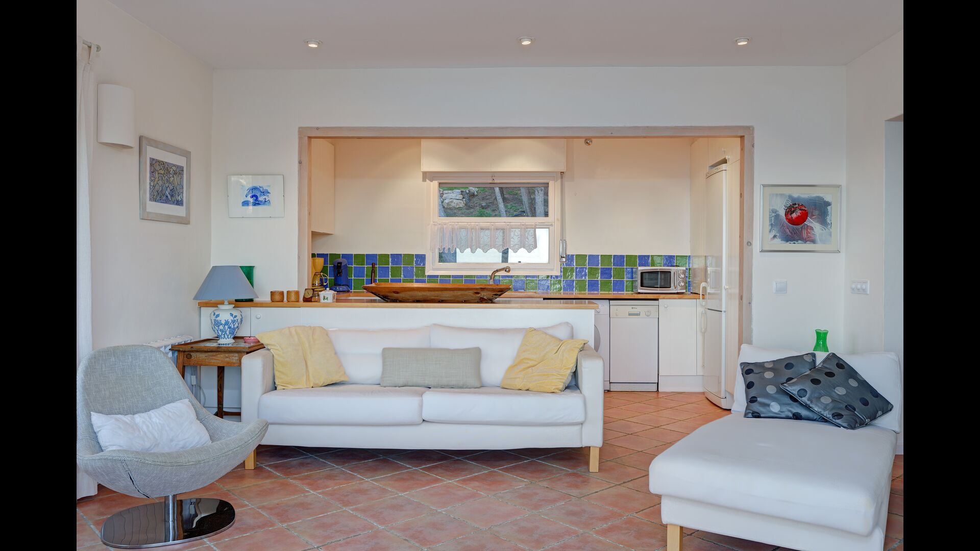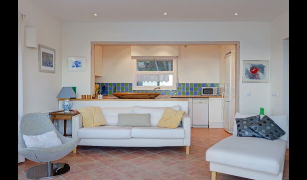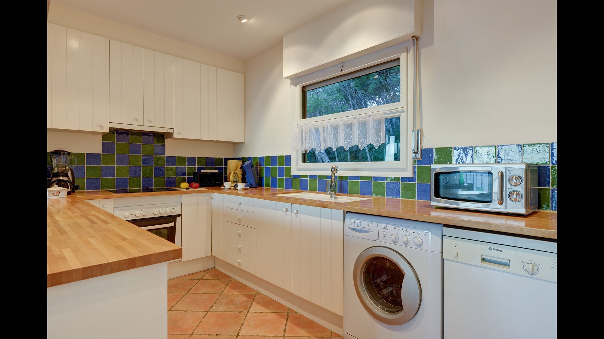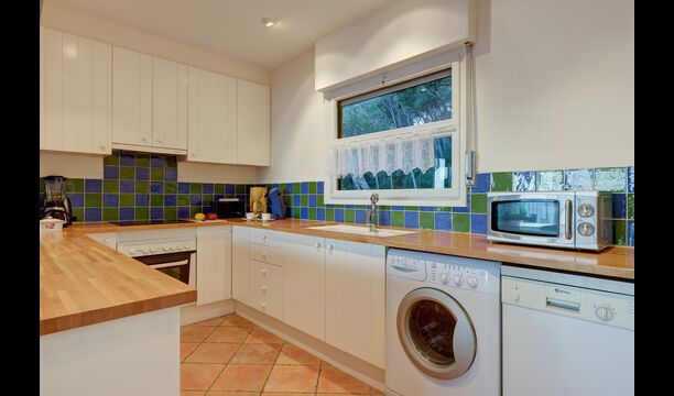 La cuina contigua està equipada amb microones, rentavaixelles, rentadora, forn, cafetera, nevera i torradora.
