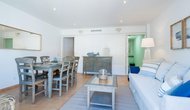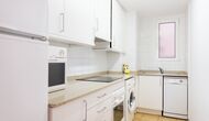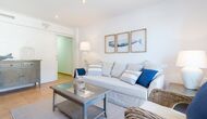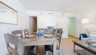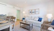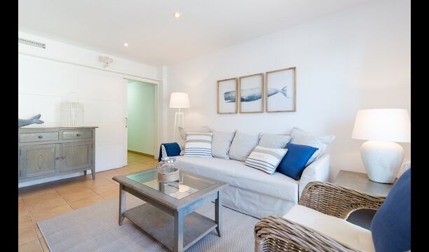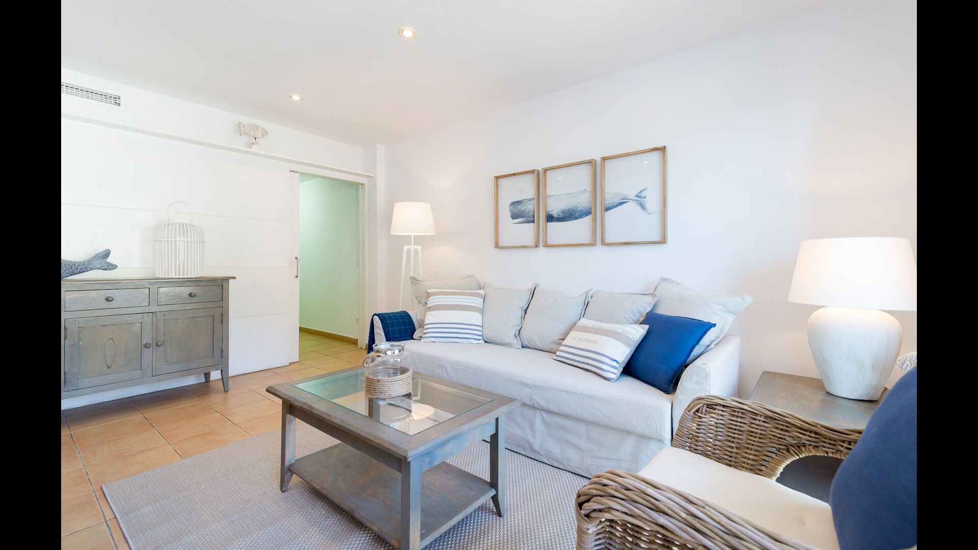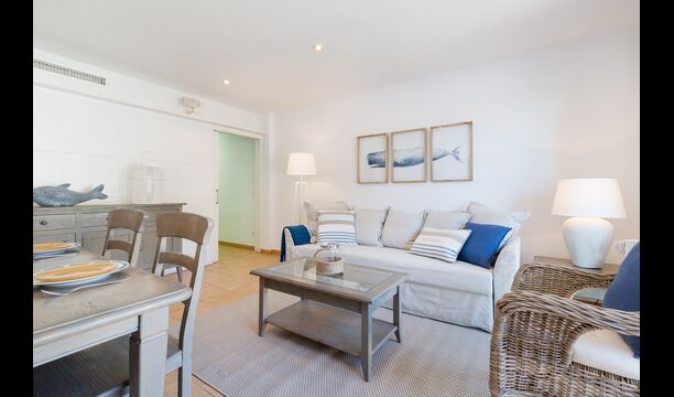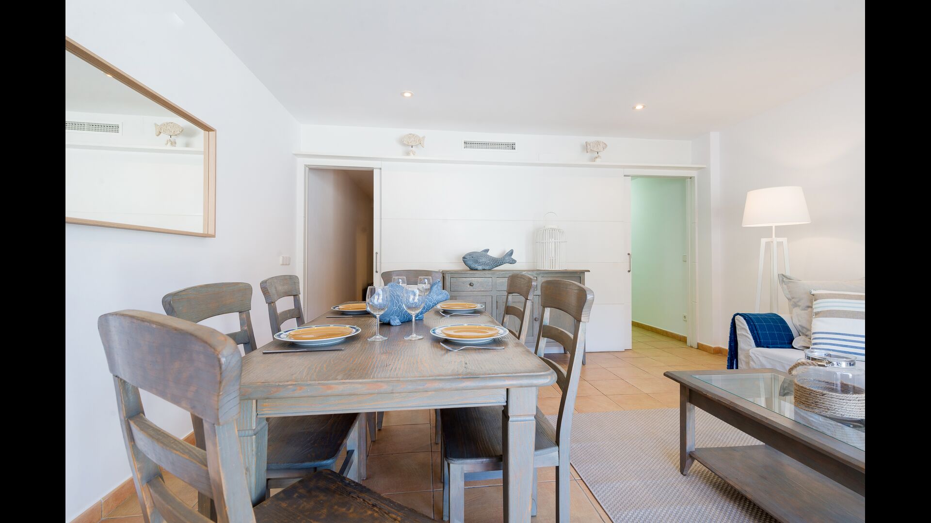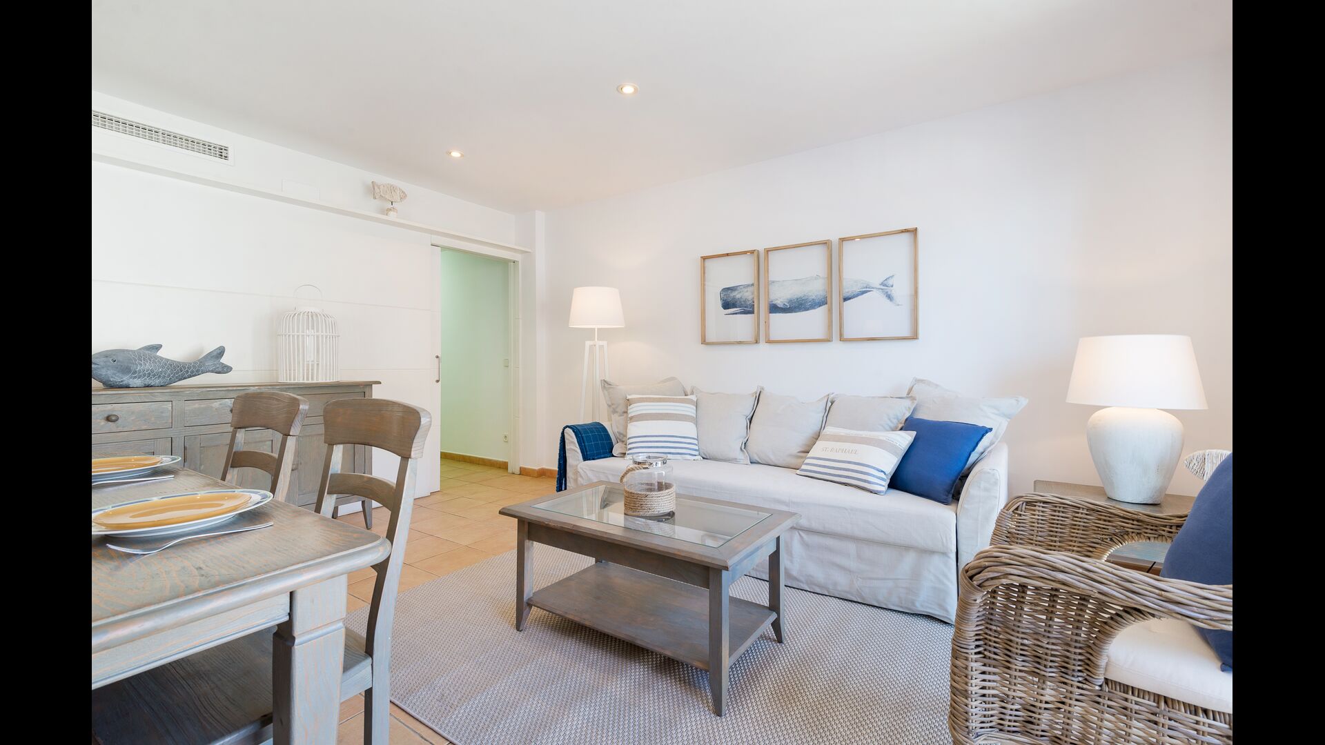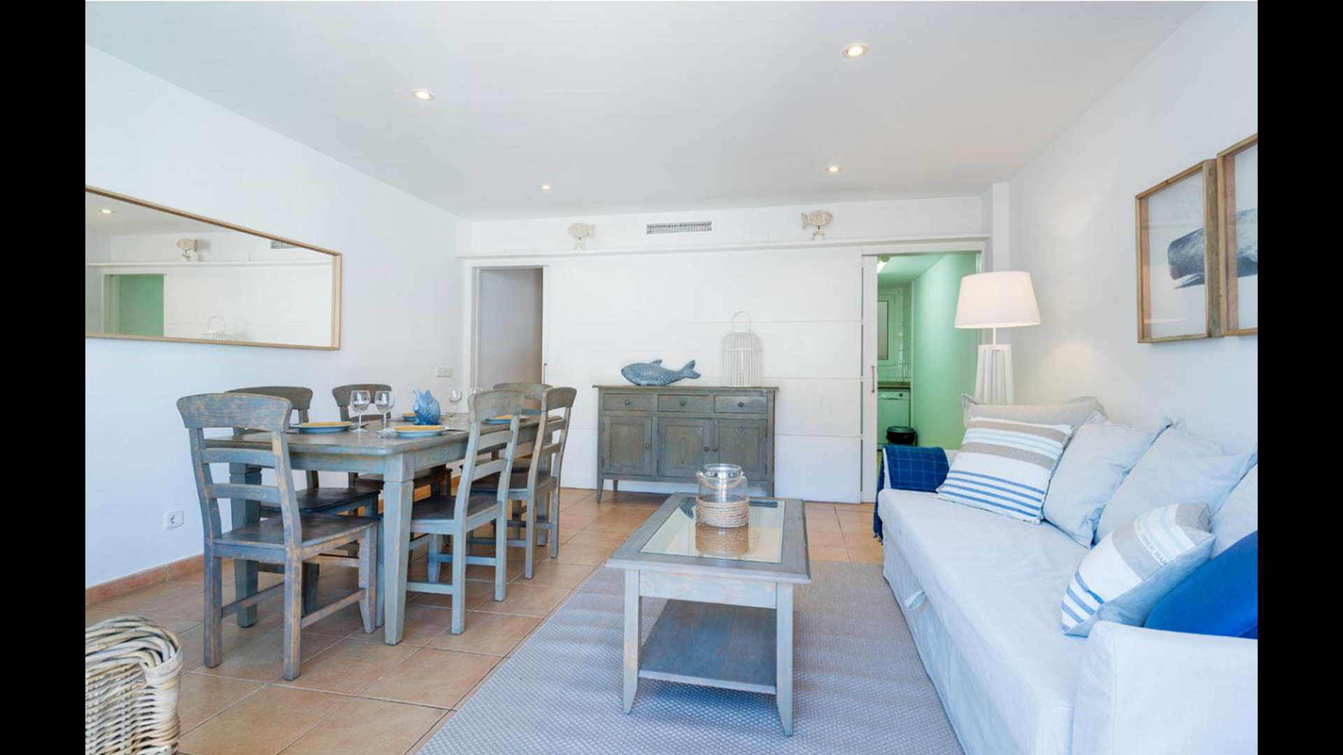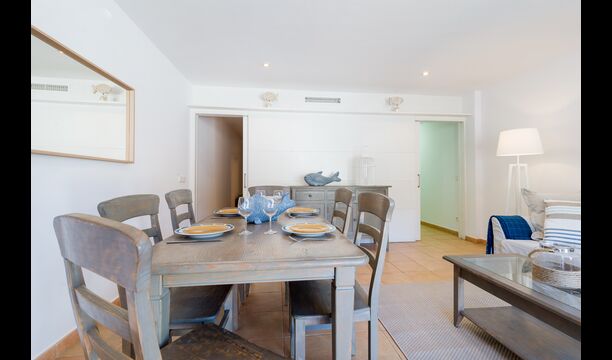 La sala comuna amb sofà racó amb TV i taula de menjador connecta convenientment la terrassa amb la cuina. Hi trobareu una cuina ben equipada amb rentavaixelles i rentadora. Per a la vostra comoditat i entreteniment, l'apartament ofereix WIFI i aire condicionat fred i calent.