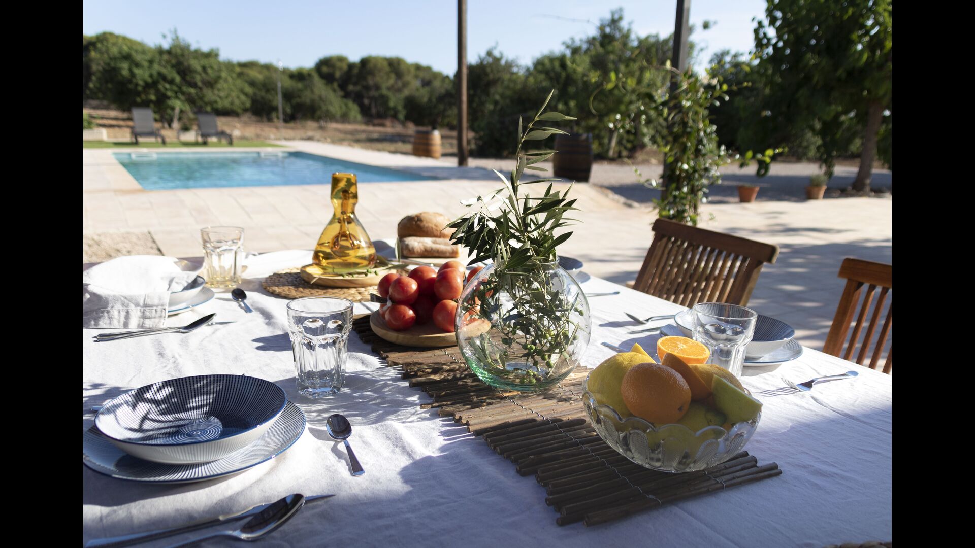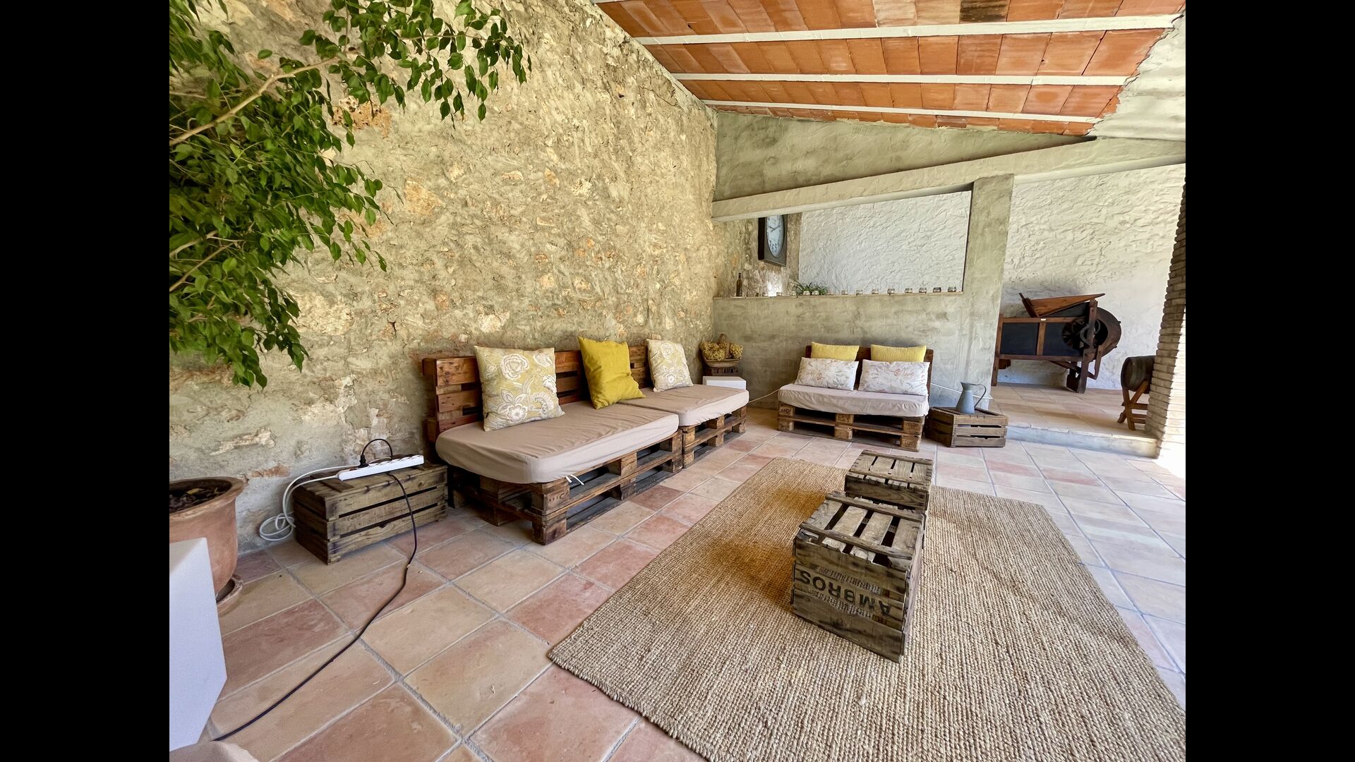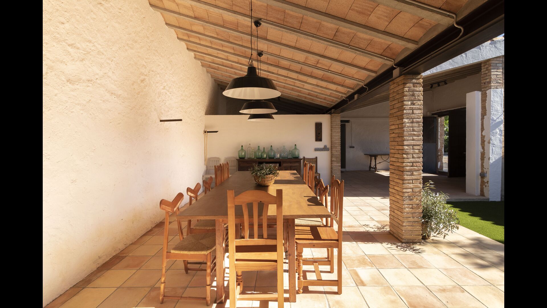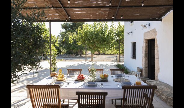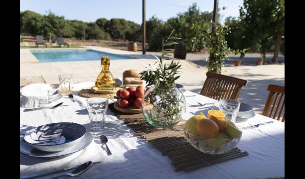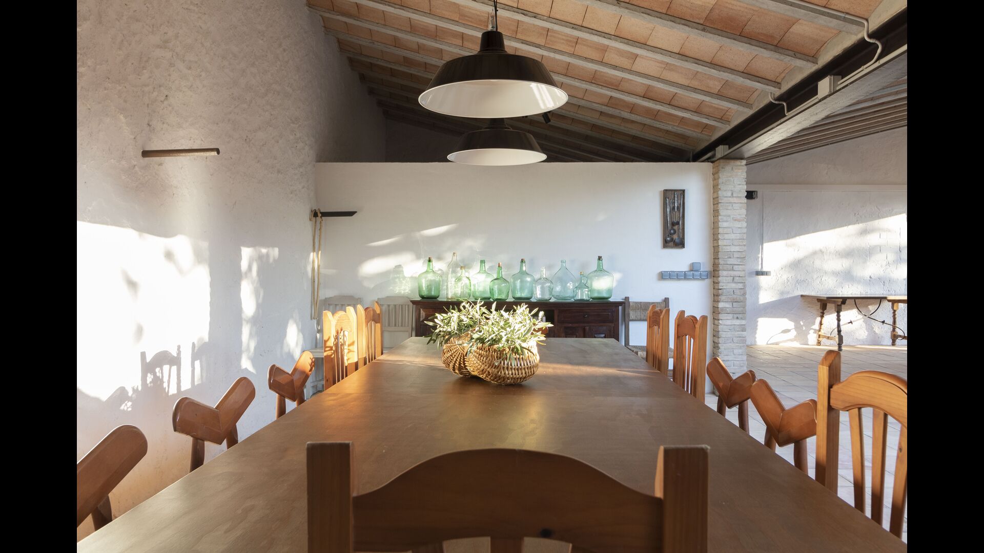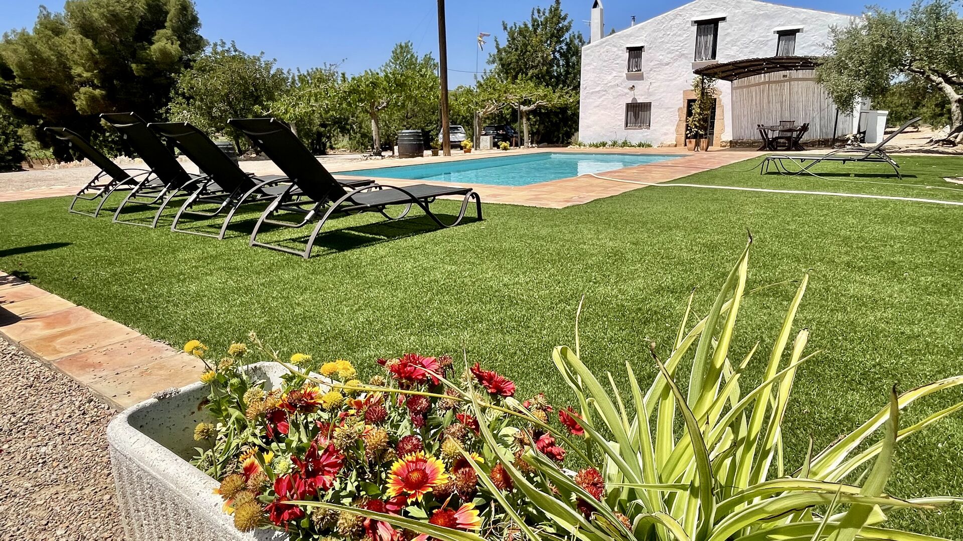La casa té una terrassa coberta, perfecta per esmorzar i sopar al costat de les suaus rialles de les aigües de la piscina, que és bastant gran i inclou unes gandules. Tant si us refresqueu a la piscina, us relaxeu a les gandules o gaudiu d'unes tapes a la terrassa exterior, podreu contemplar el meravellós camp català . Una part de la raó per la qual Casa Moma està tan meravellosament aïllada són les 6 hectàrees de bosc i garrofers i 3 hectàrees > de vinyes i oliveres que envolten la propietat.