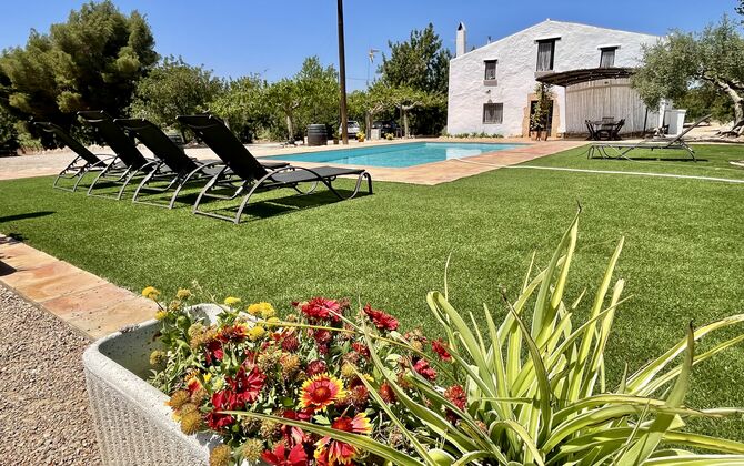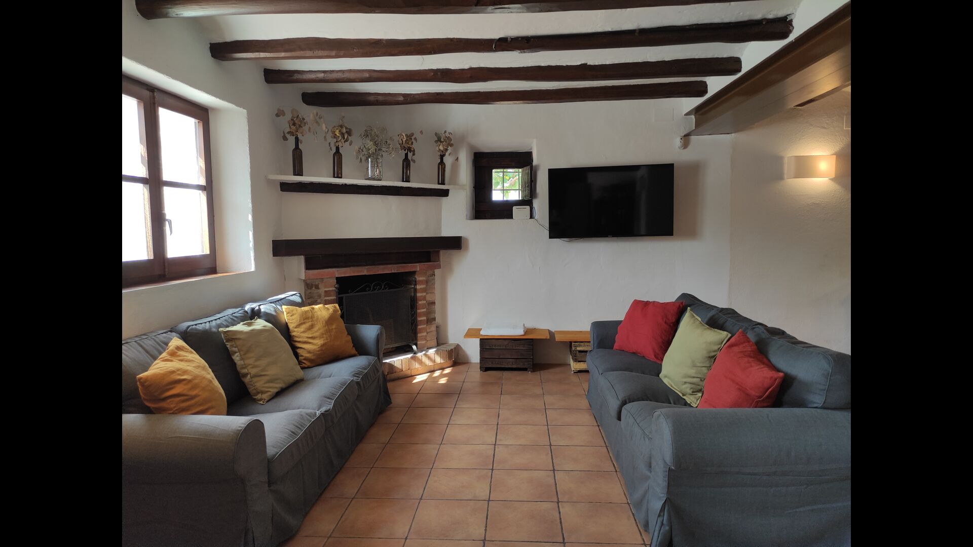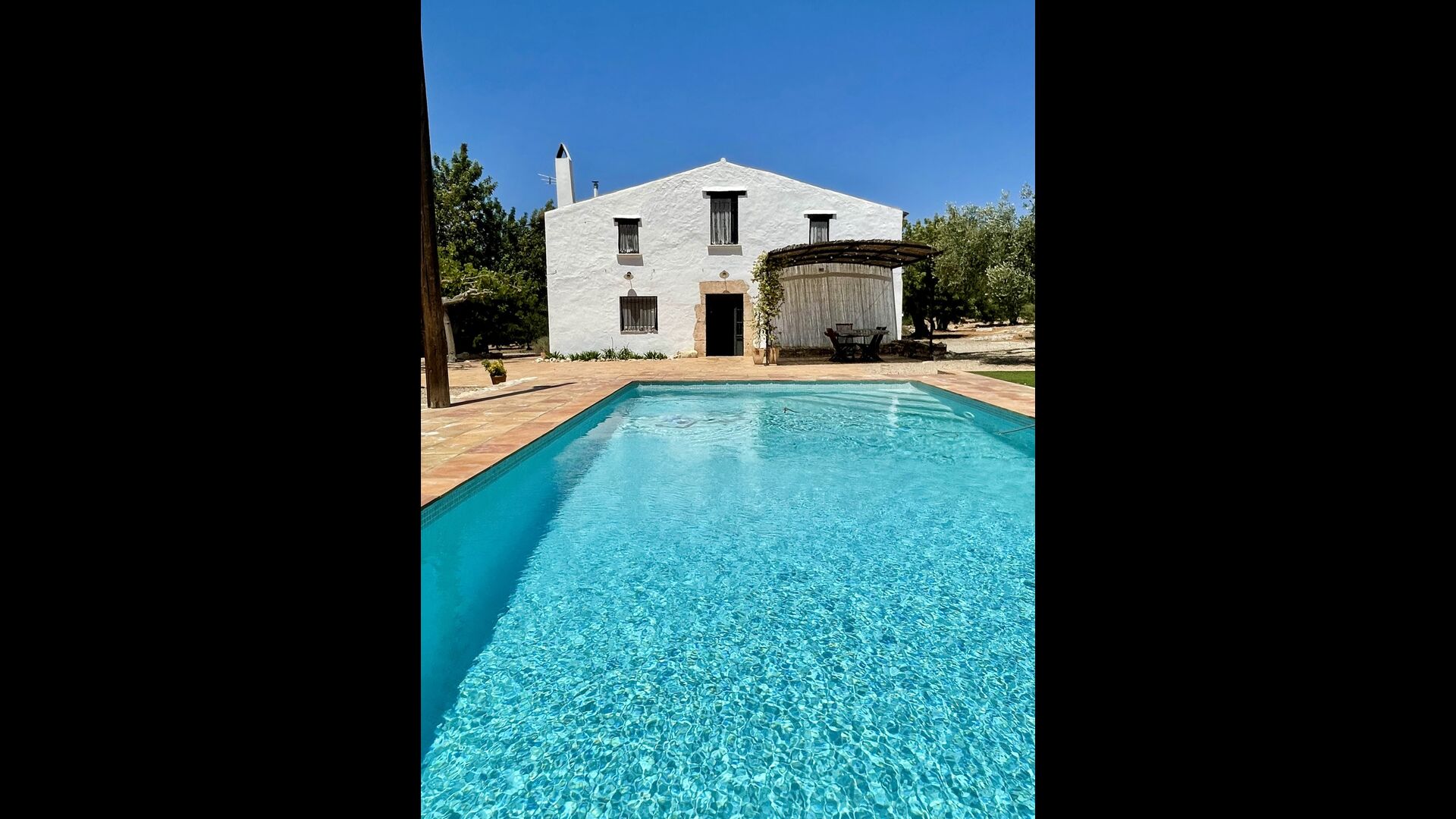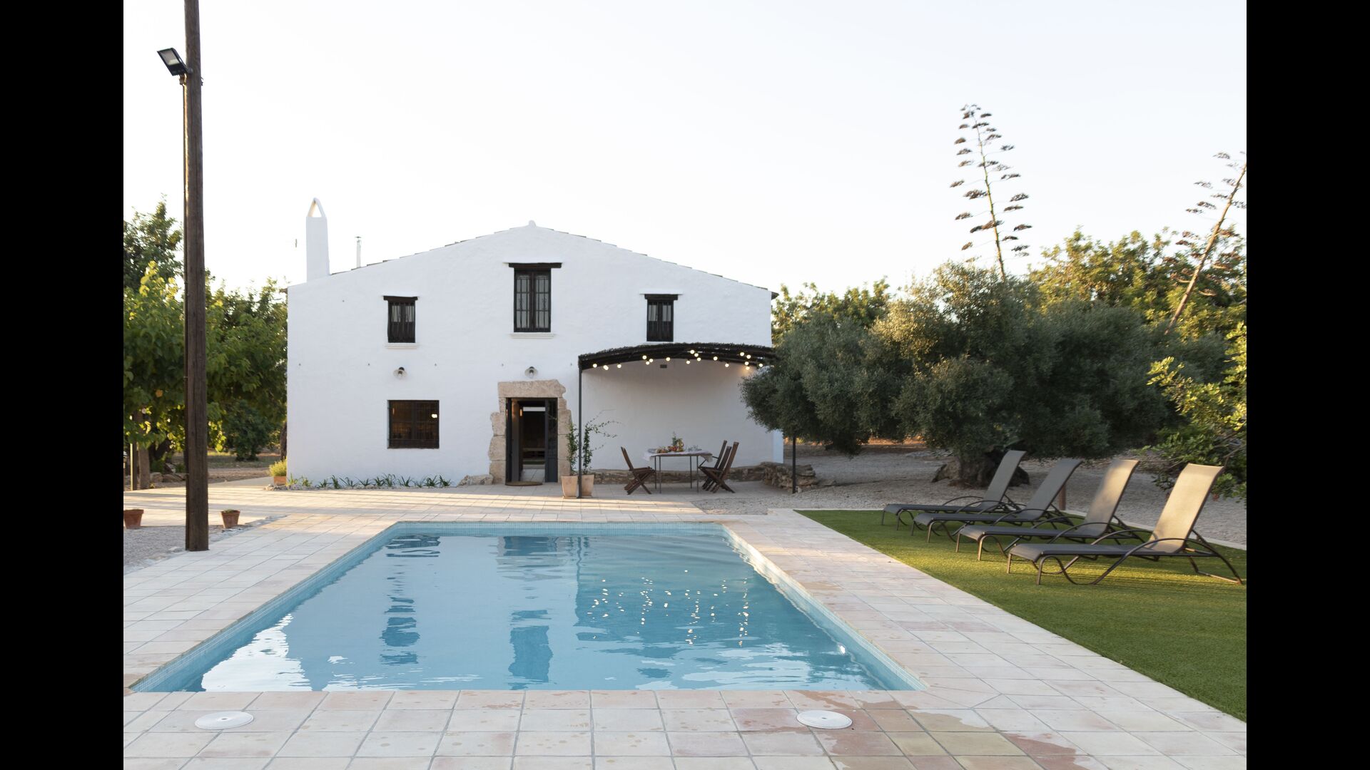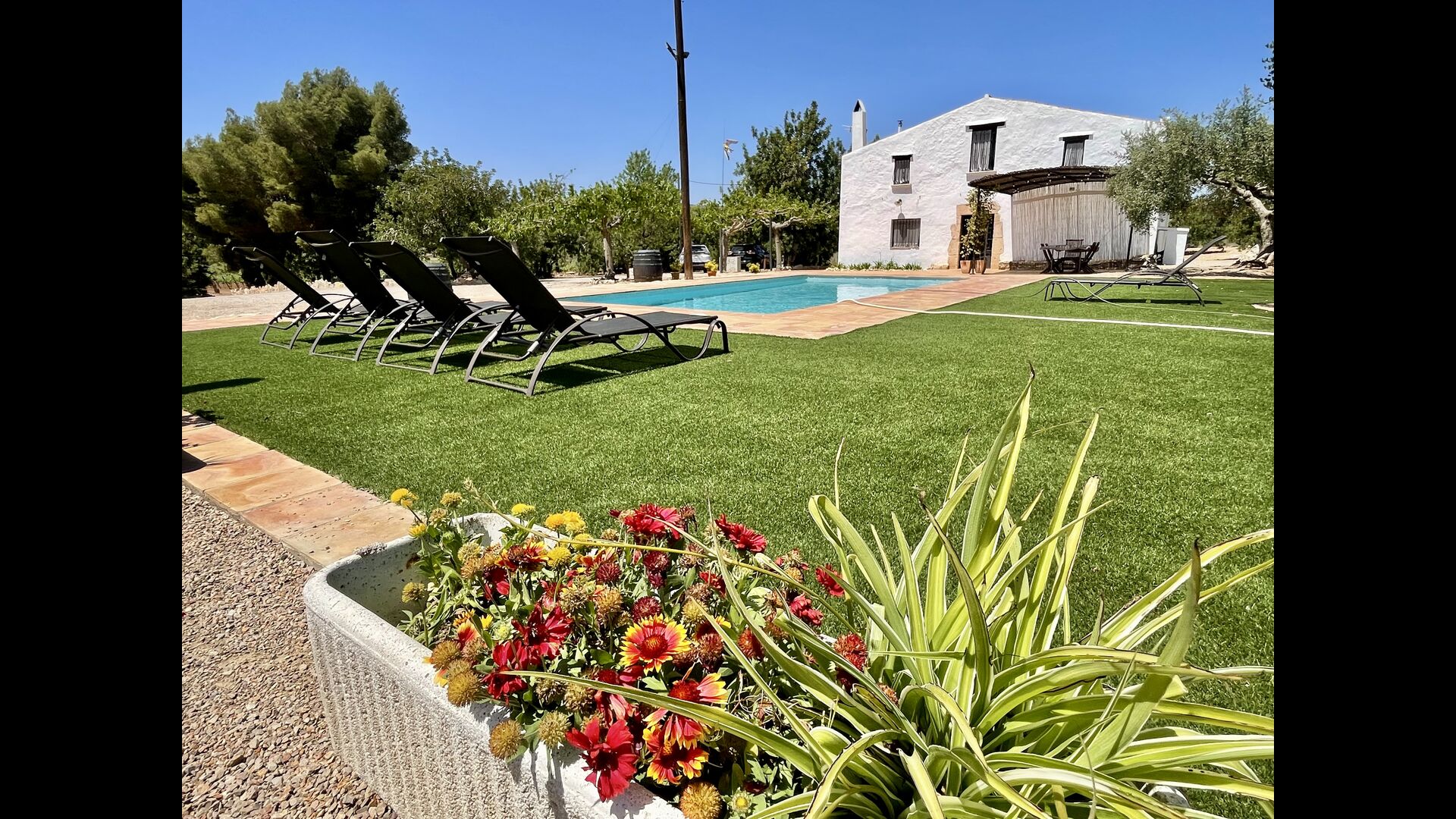 La casa té una terrassa coberta, perfecta per esmorzar i sopar al costat de les suaus rialles de les aigües de la piscina, que és bastant gran i inclou unes gandules. Tant si us refresqueu a la piscina, us relaxeu a les gandules o gaudiu d'unes tapes a la terrassa exterior, podreu contemplar el meravellós camp català . Una part de la raó per la qual Casa Moma està tan meravellosament aïllada són les 6 hectàrees de bosc i garrofers i 3 hectàrees > de vinyes i oliveres que envolten la propietat.