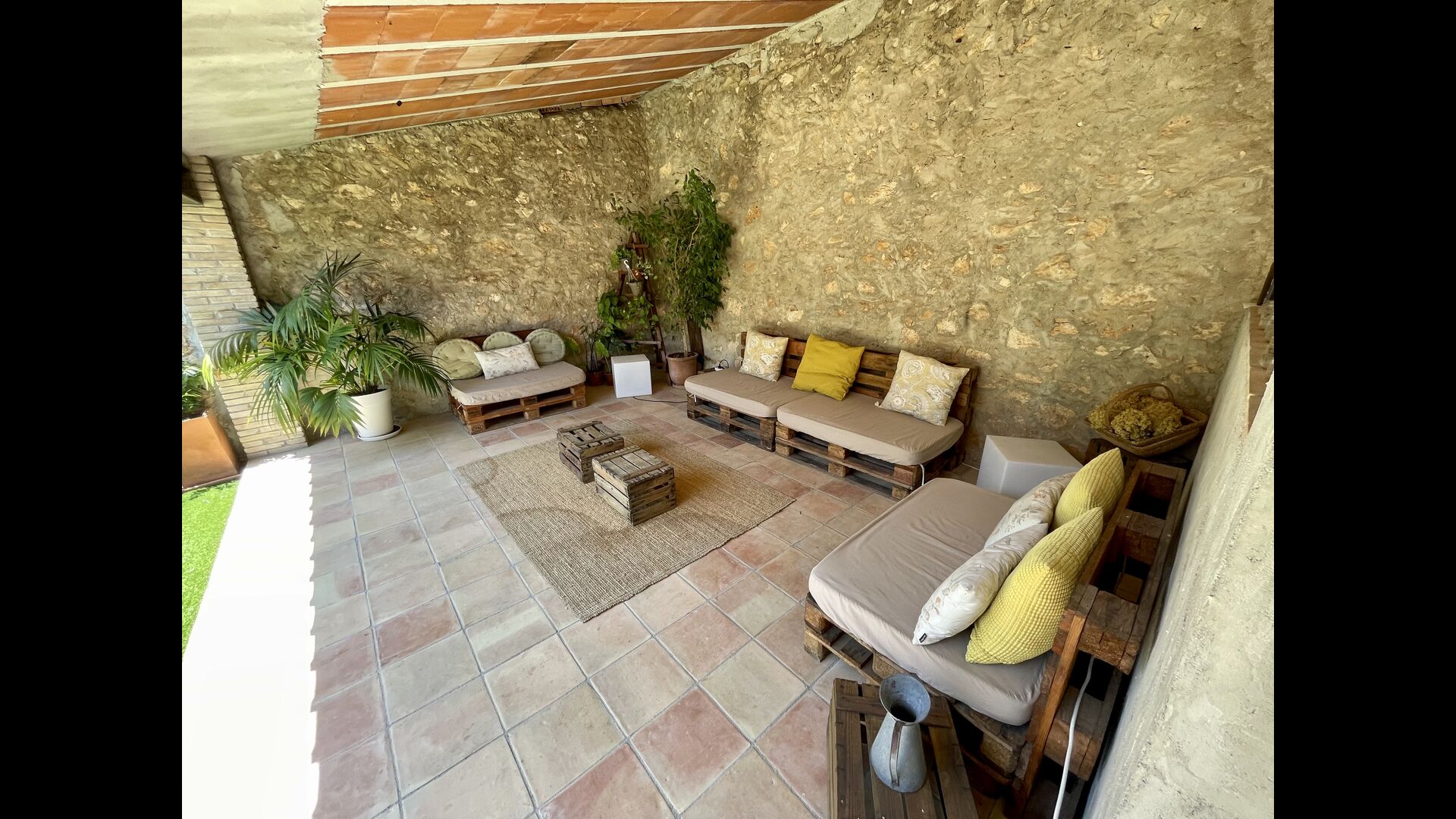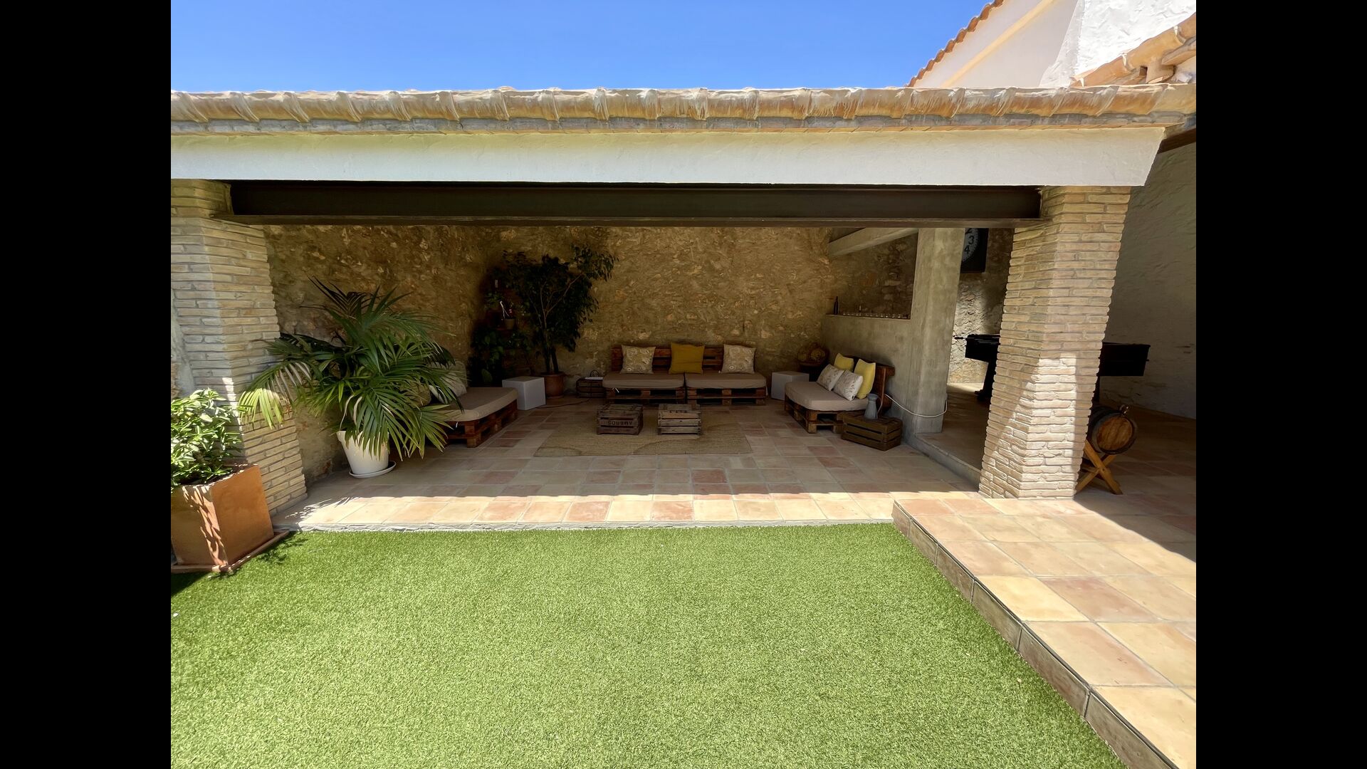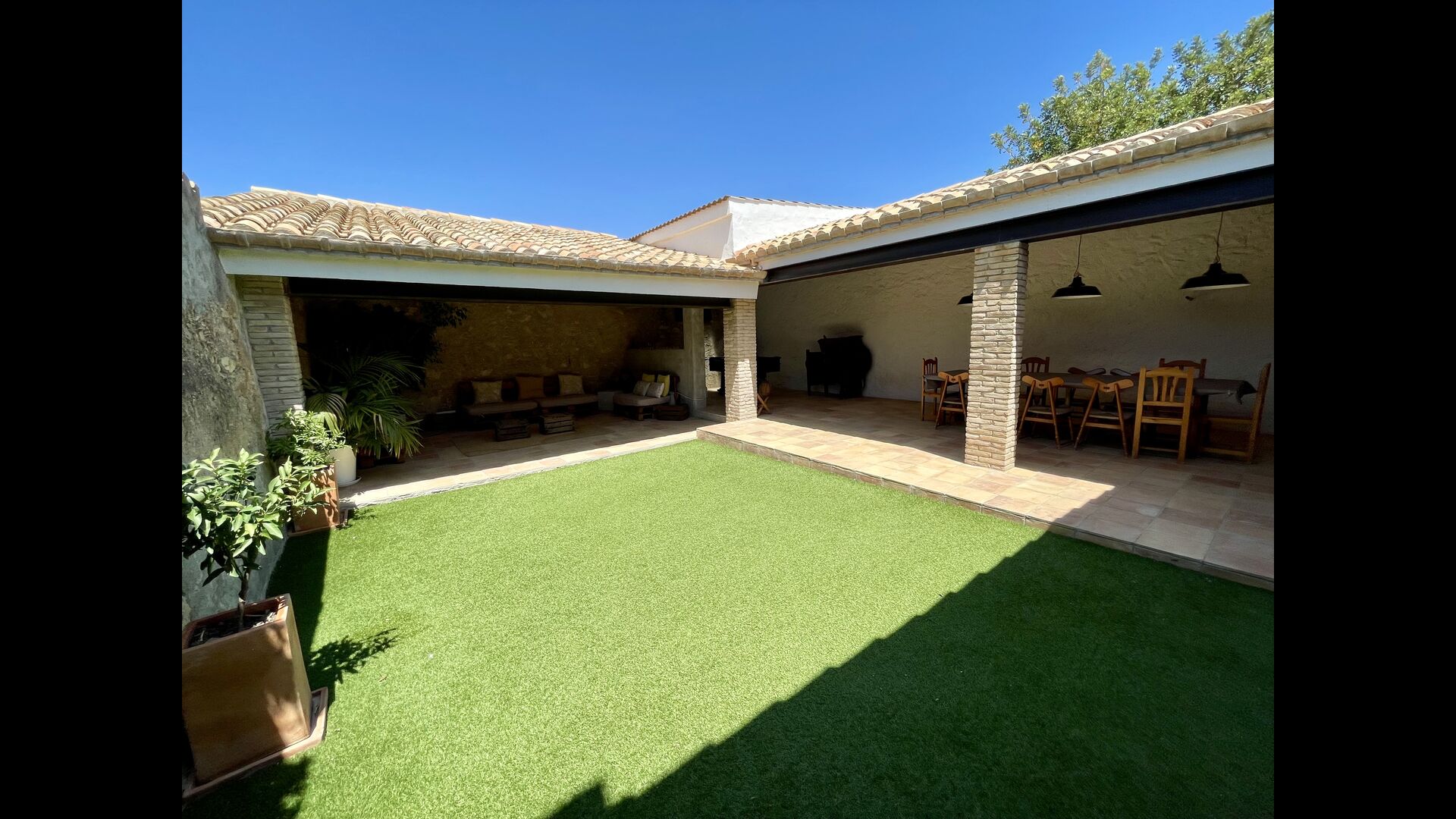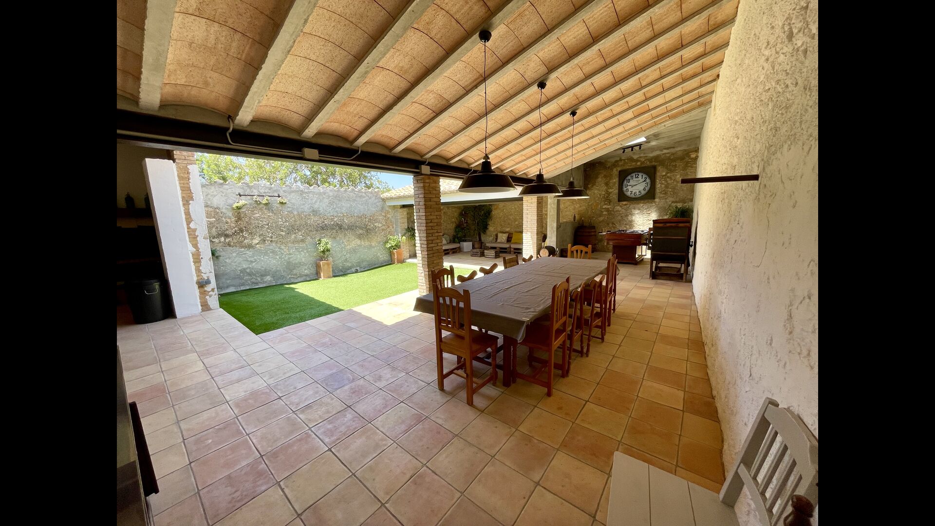 La casa també té un pati interior, flanquejat per un porxo unit a la mateixa casa; el porxo té una zona de relaxació, que inclou múltiples cadires còmodes i decoracions acollidores, a més d'un sopar/taula i una instal·lació de futbolí. Preneu-vos el sol al pati o relaxeu-vos a l'ombra del porxo – sopar amb els amics o la família al costat de la taula!