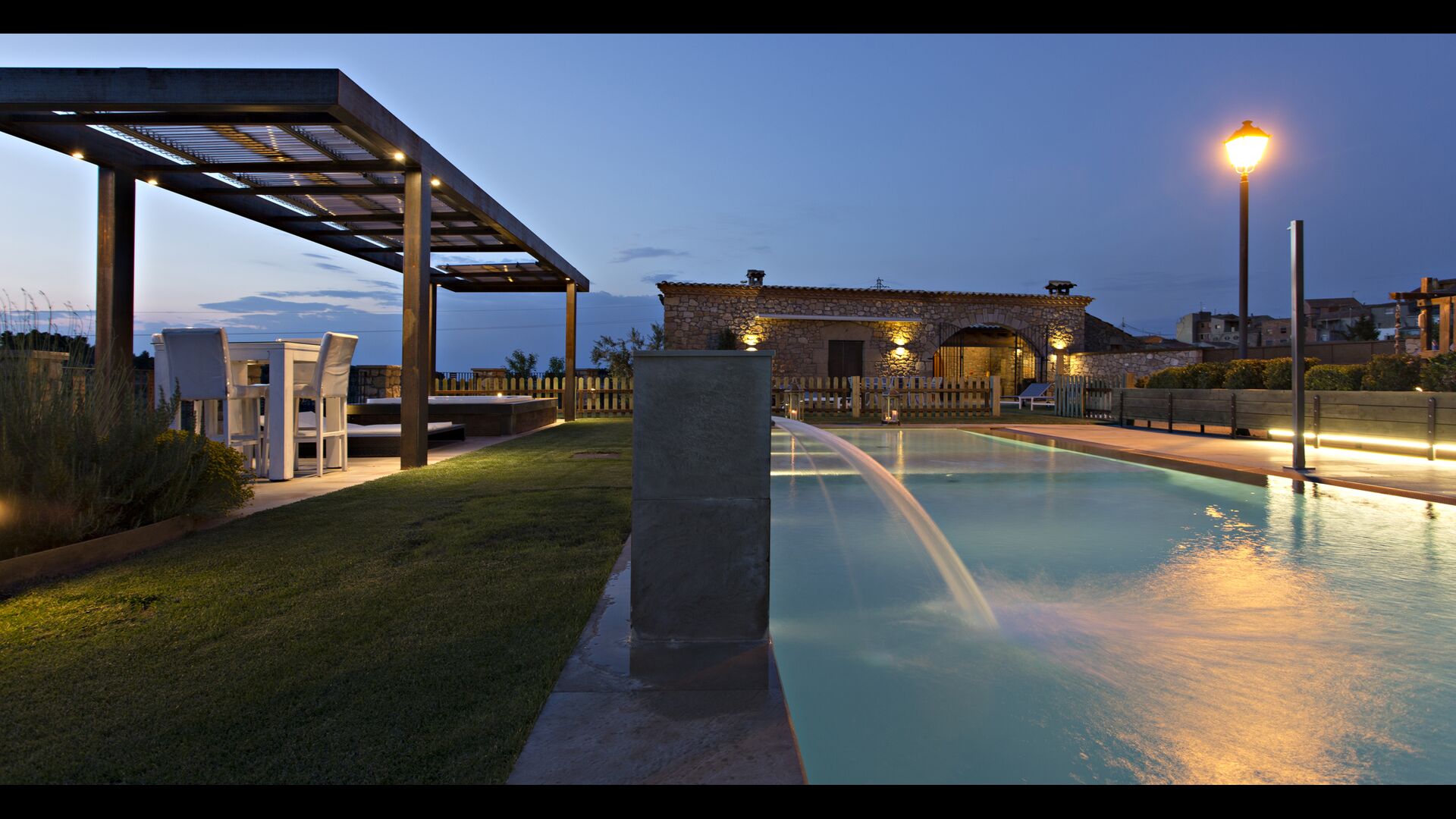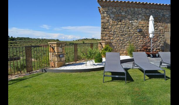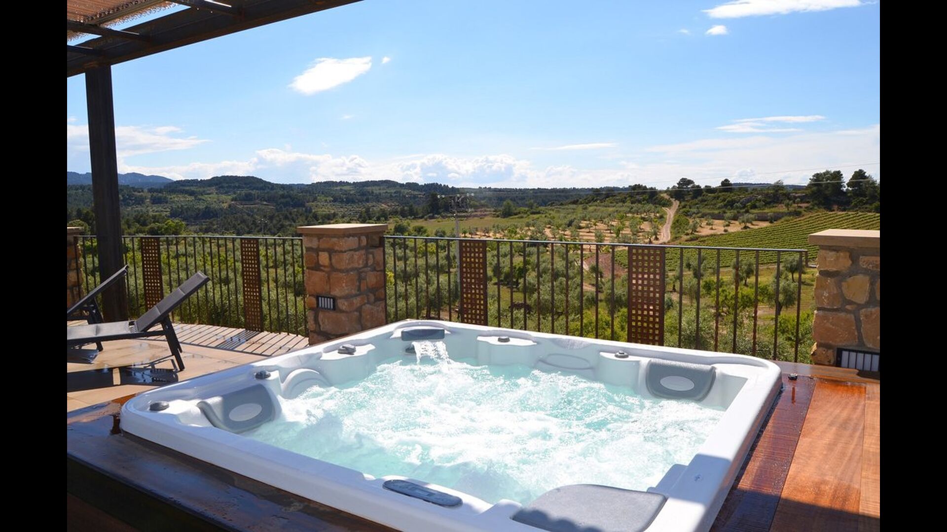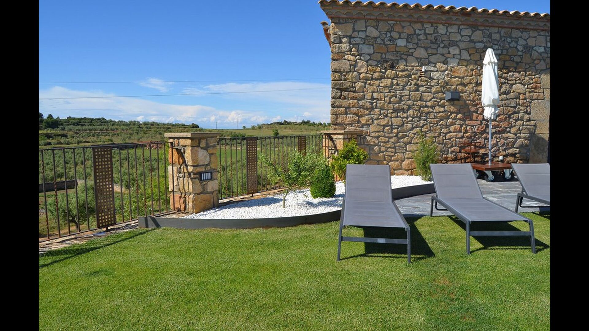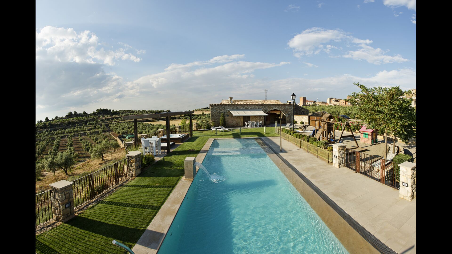 L'àrea del jardí és bastant fantàstica. La piscina de 16 metres de longitud es troba al centre, i amb la seva construcció única, satisfarà a tota la família: els primers 4 m són una piscina poc profunda per als petits del grup de vacances. L'altre extrem és una piscina de 8 m de longitud i més profunda per als adults. En aquest sentit, hi ha una mena de cascada. A més, la piscina està tancada, que és un gran alleujament, ja que no haureu de vigilar els nens més petits tot el temps. La piscina és un lloc ideal per relaxar-se o refrescar-se durant els dies càlids de Catalunya i, com no n'hi ha prou, també hi ha una banyera d'hidromassatge (jacuzzi) al costat de la piscina. Des d'aquí, hi ha una vista espectacular sobre els camps vinícoles, d'olivera i d'ametllers.