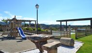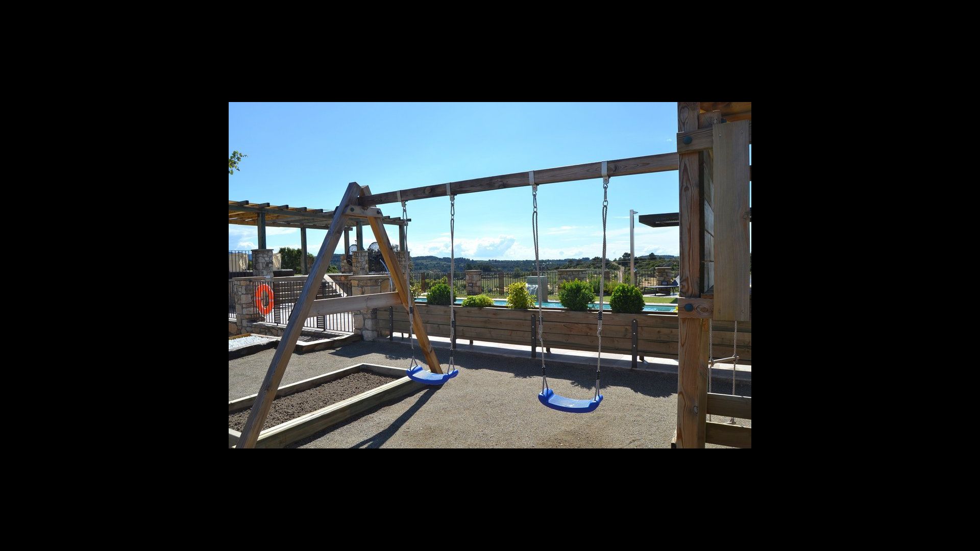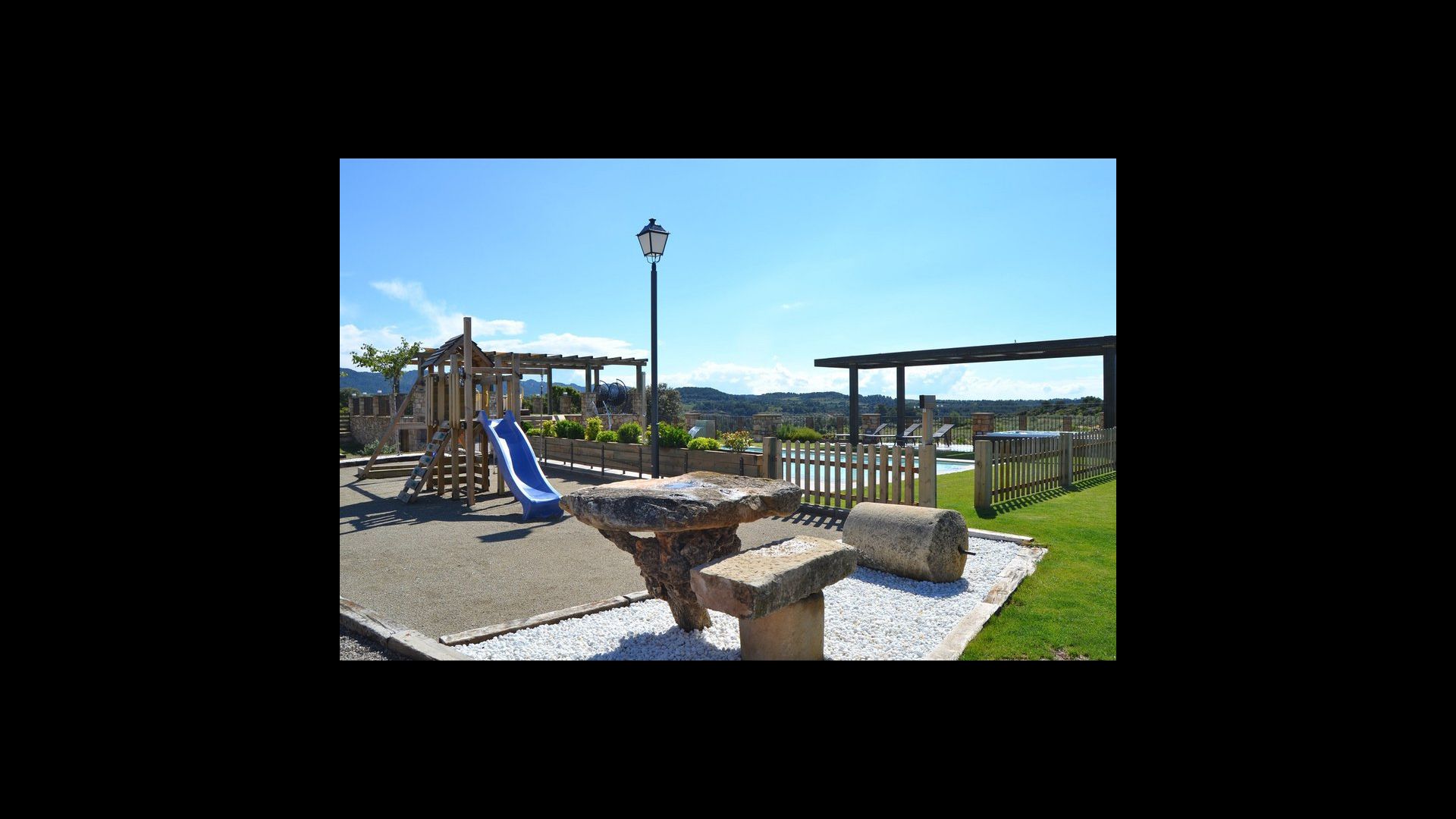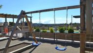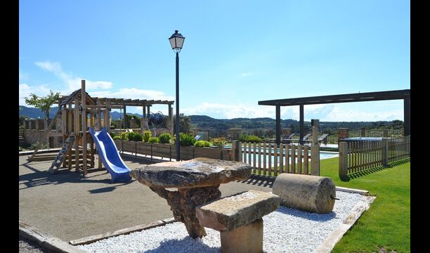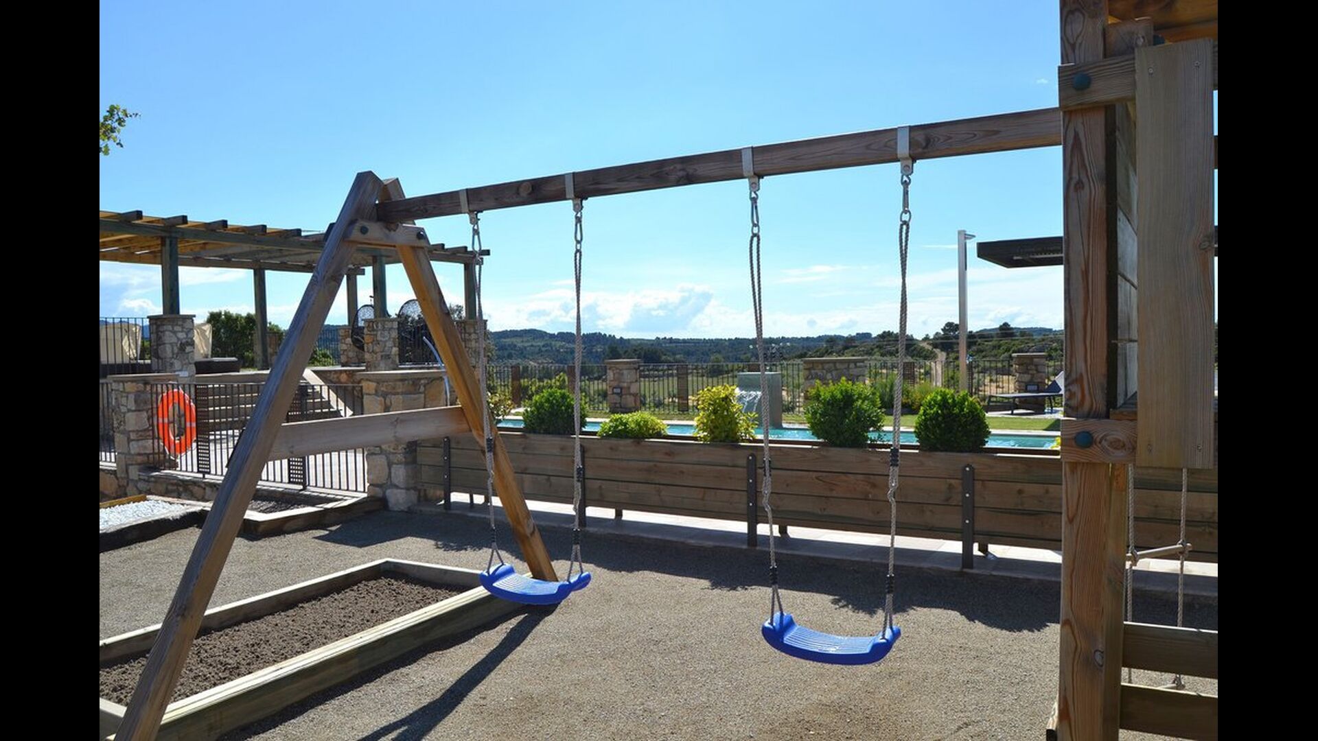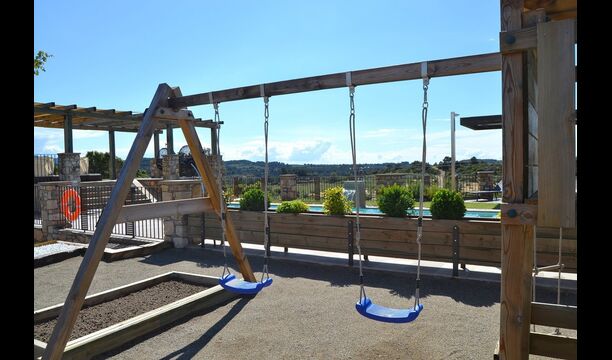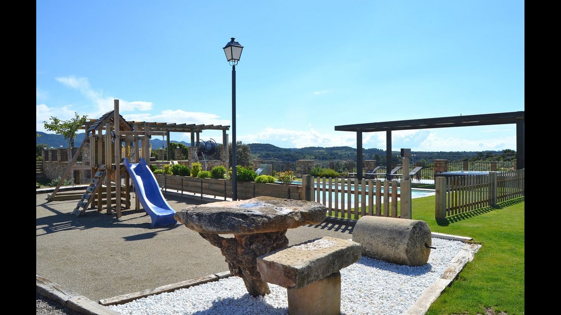 A l'altre costat de la piscina hi ha un parc infantil amb gronxadors i una casa de jocs amb tobogan i, al final, hi ha una terrassa coberta. Aquí podreu gaudir d'un sopar casolà al bell entorn o simplement relaxar-vos a les gandules.