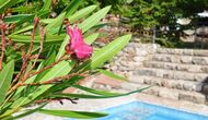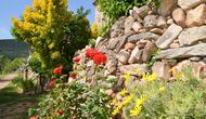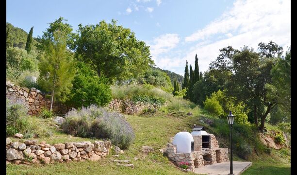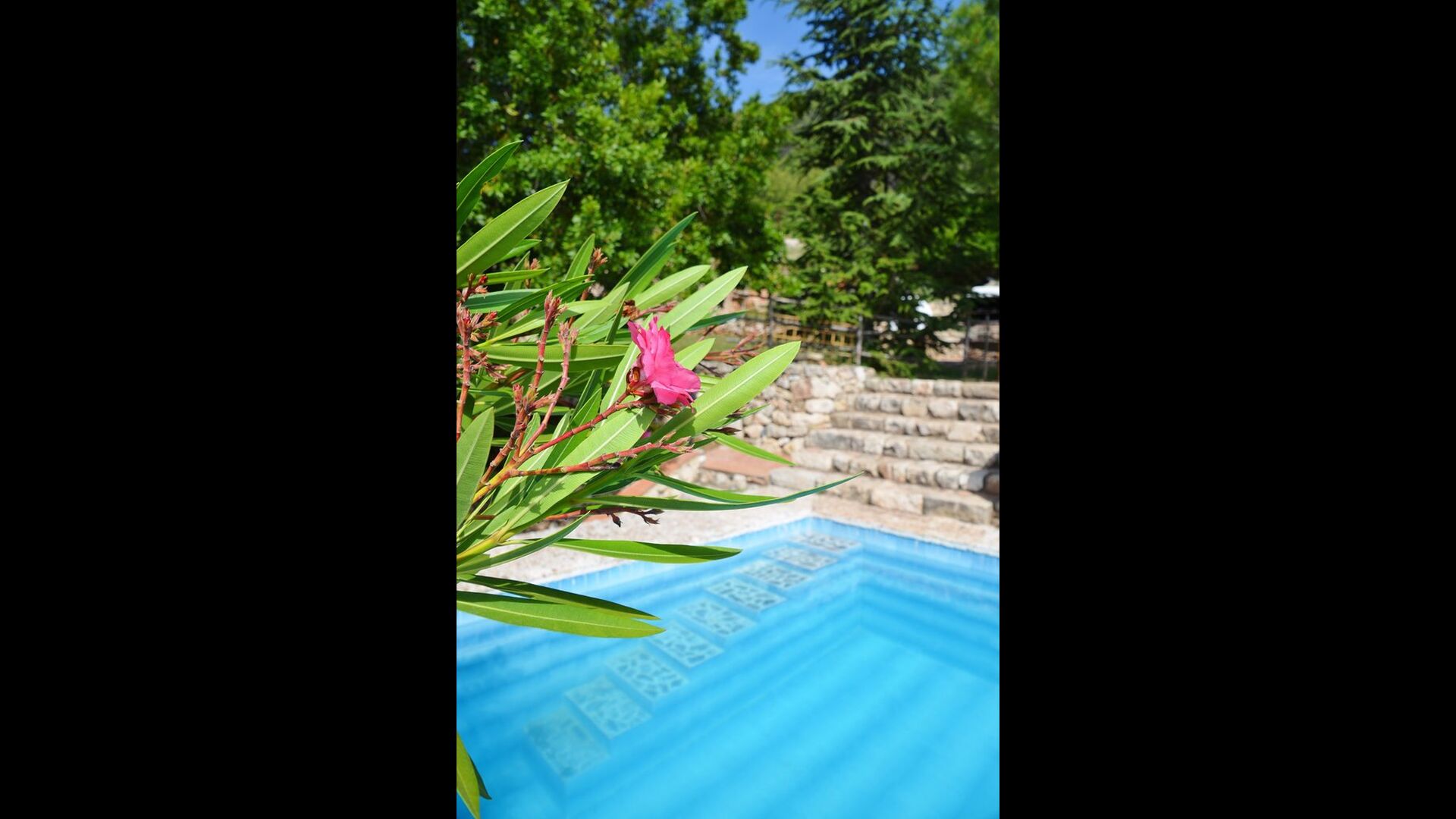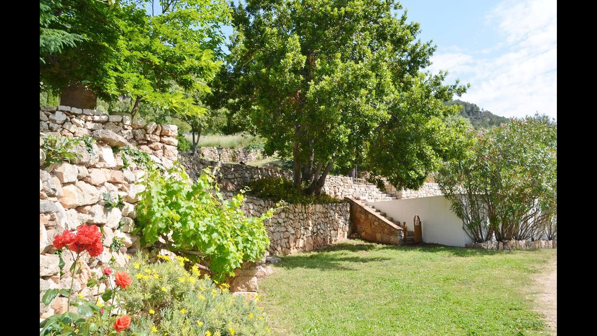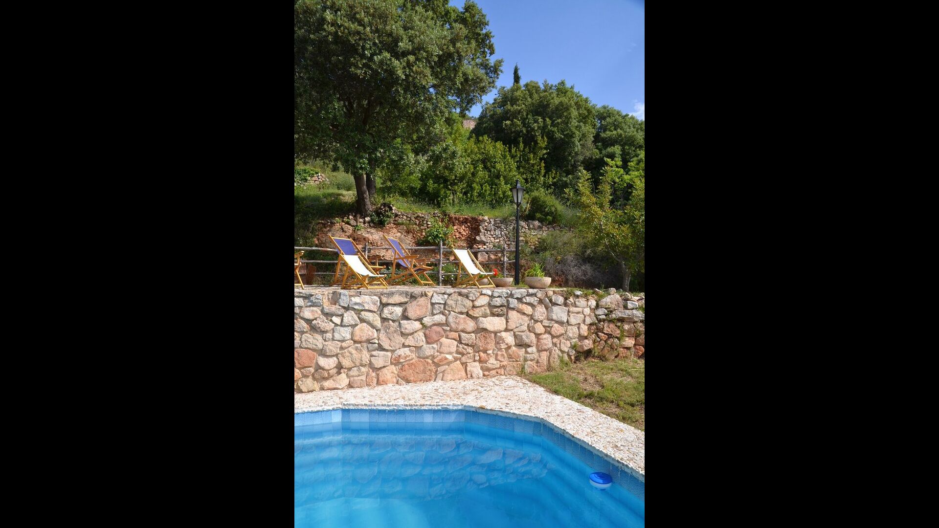 Les zones exteriors de la propietat són una cosa especial. El jardí és molt gran i variat. Està ple d'arbres (inclosos cirerers), plantes i zones de gespa relativament grans. Diversos llocs al jardí, fan possible seure a l'ombra i relaxar-se. , La bonica zona de la piscina es troba en un petit altiplà i ofereix la millor vista de la propietat. La piscina té una mida de 32 m2 i hi ha escales fins a l'aigua. Això ofereix una oportunitat per relaxar-se i els nens també poden  ;usen la seva energia i temps a l'aigua de refrigeració. En un altre altiplà a sobre de la piscina, hi ha gandules i ombrel·les, i amb una vista fantàstica.