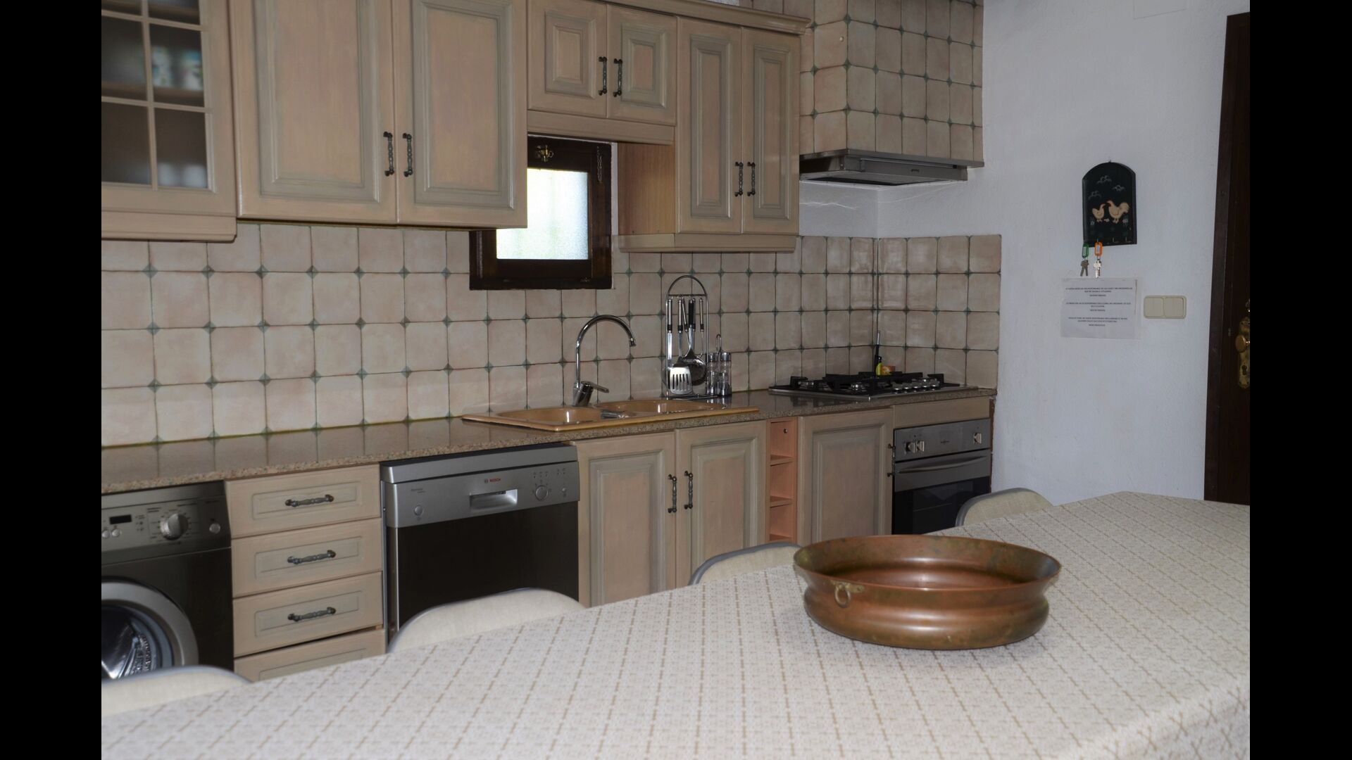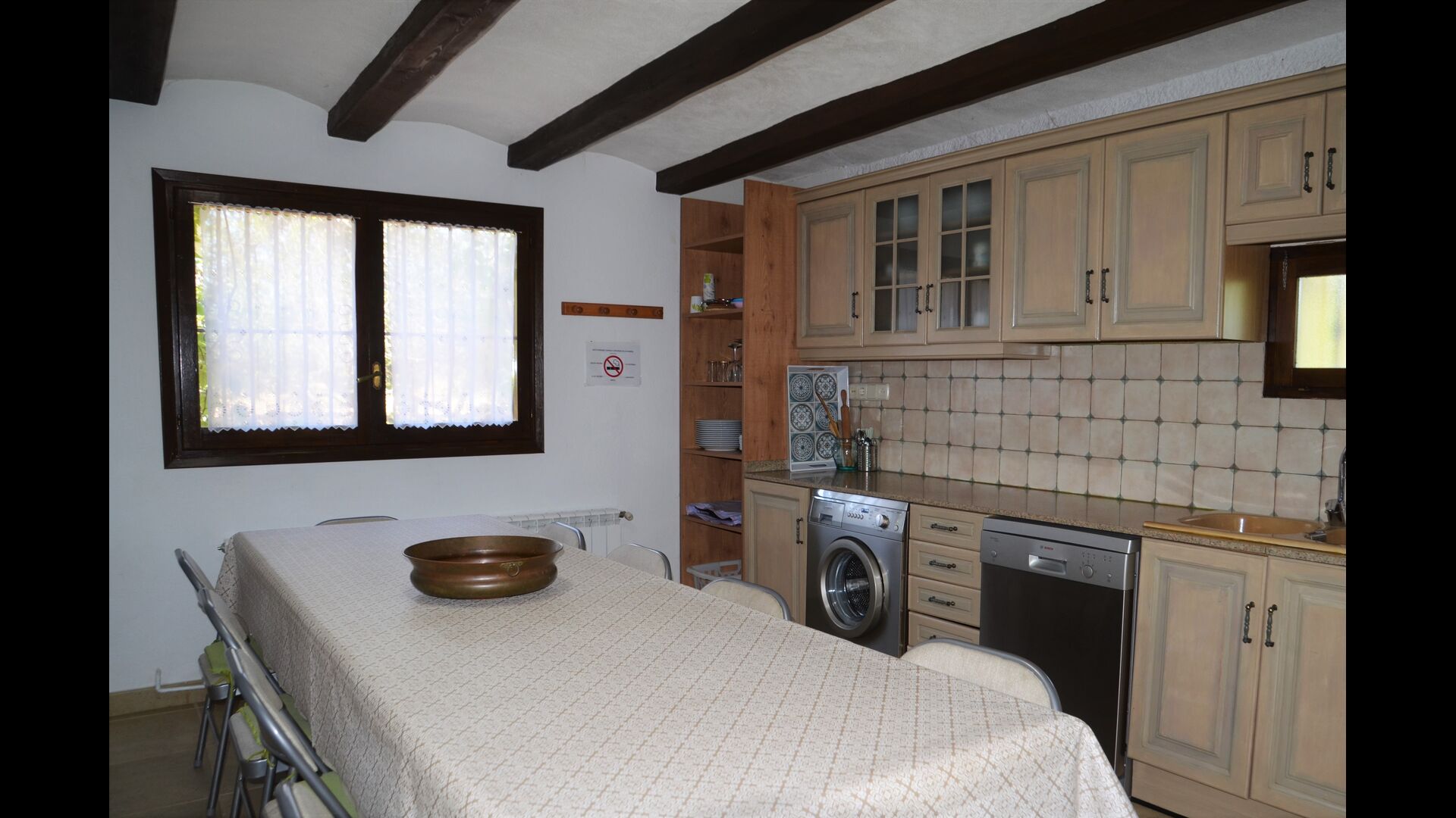 Gran cuina completament equipada amb tots els electrodomèstics necessaris: rentadora, rentaplats, cuina/forn a gas, microones, 2 cafeteres, tipus italianes (les de tota la vida, que funcionen amb cafè mòlt), batedora, tetera, espremedor i torradora.