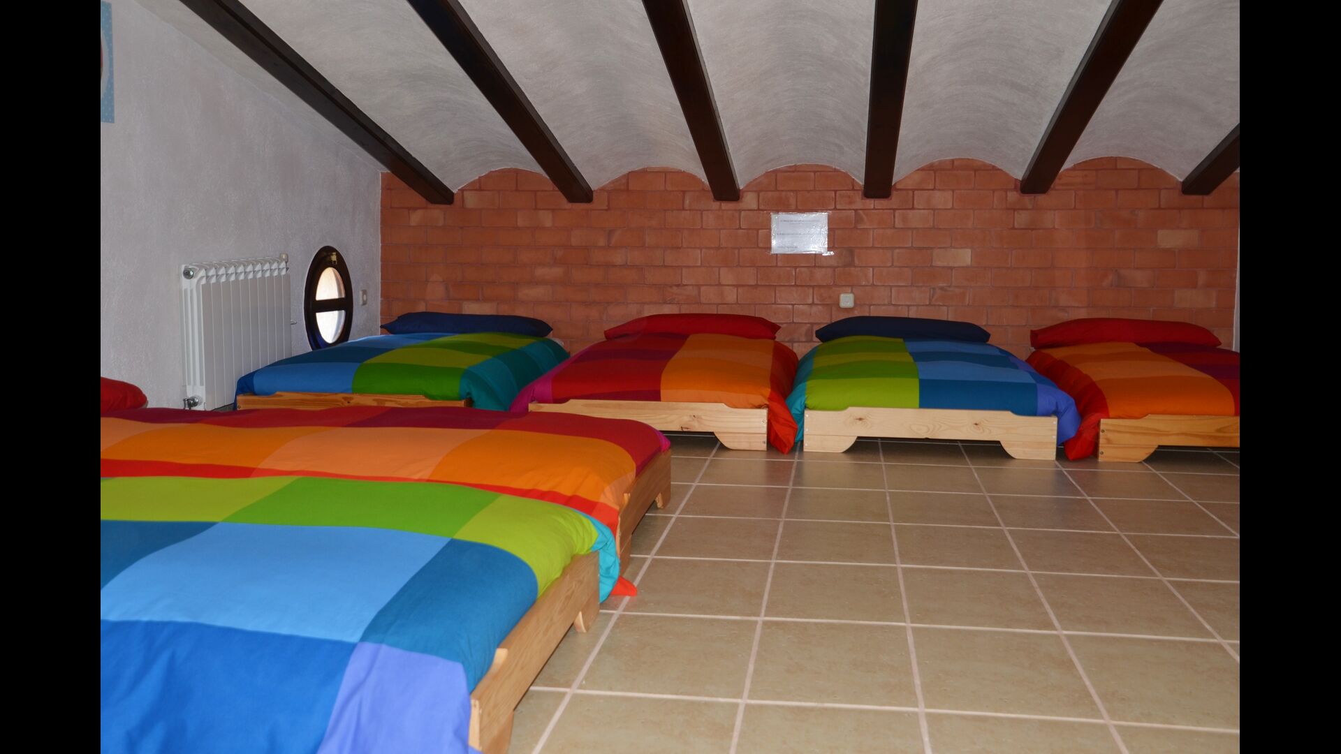 5 habitacions: 4 dobles i una gran mansarda (buhardilla) amb 4 llits individuals + 2 llits supletoris.