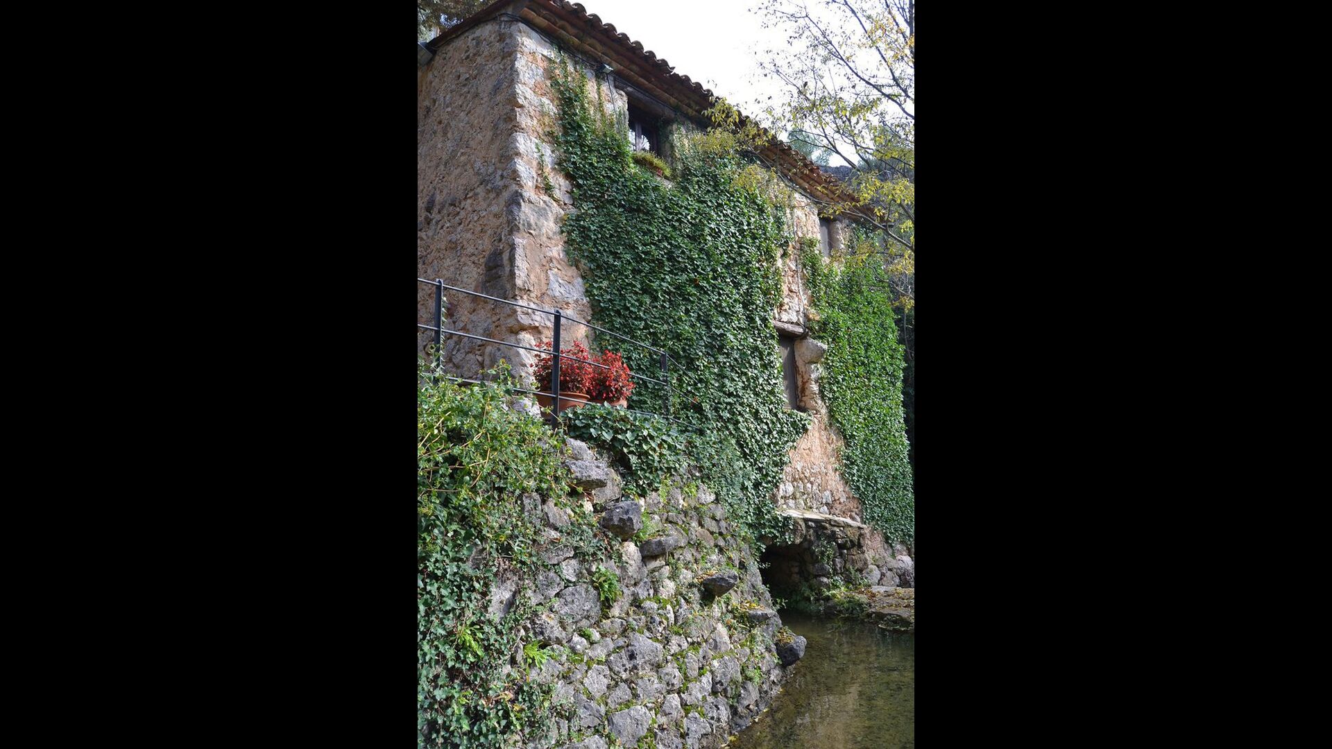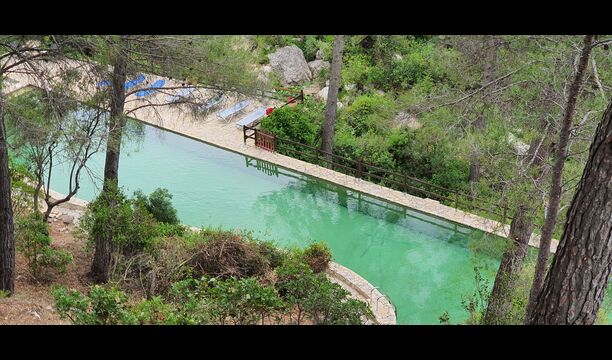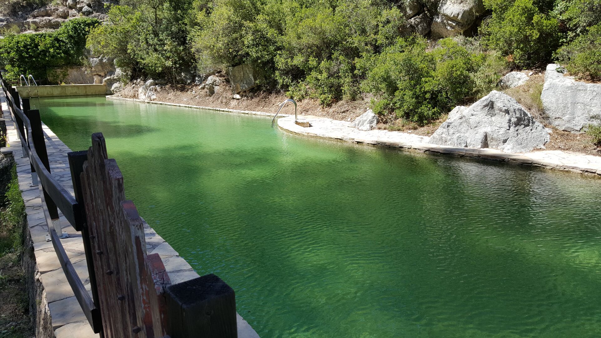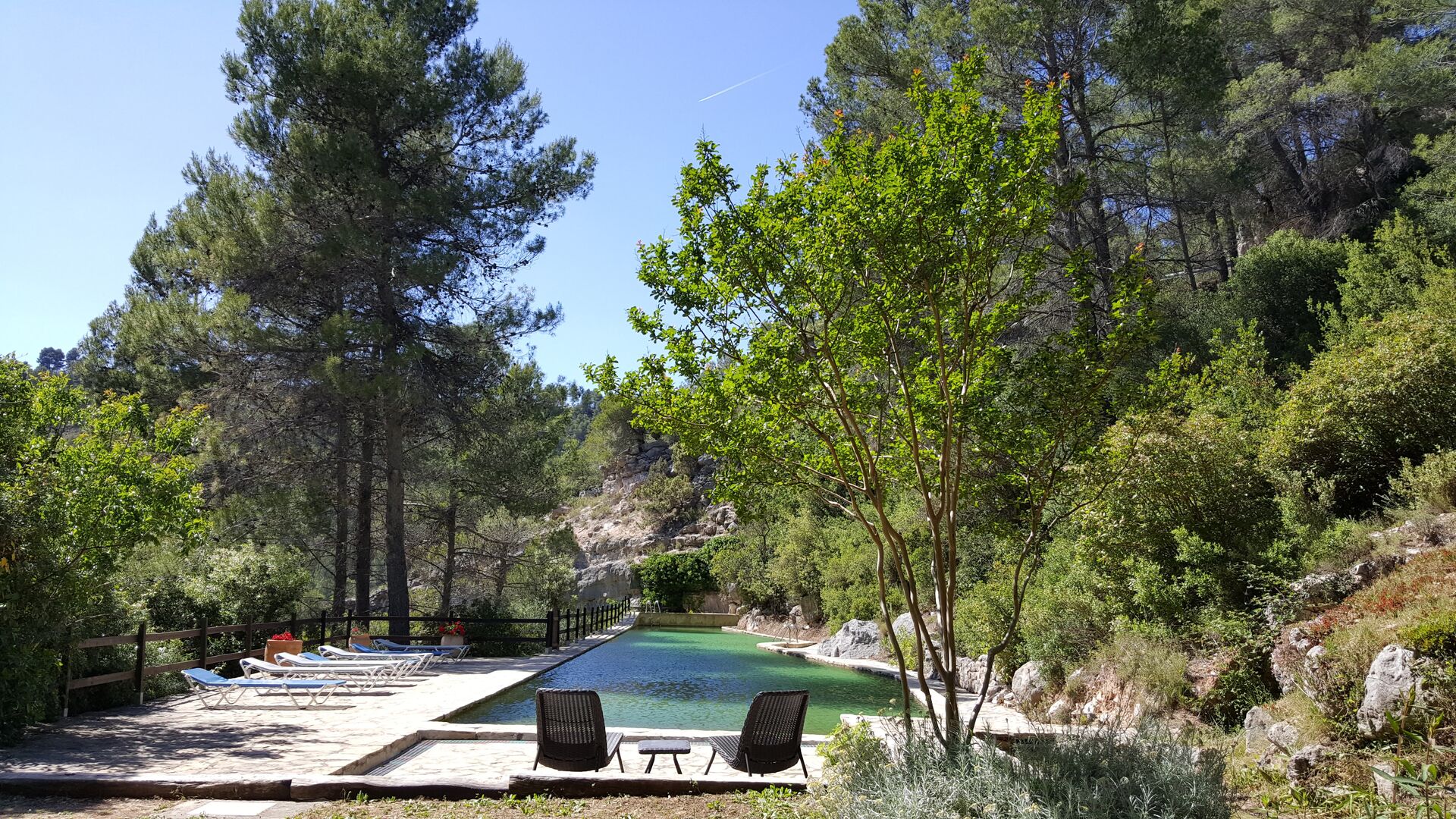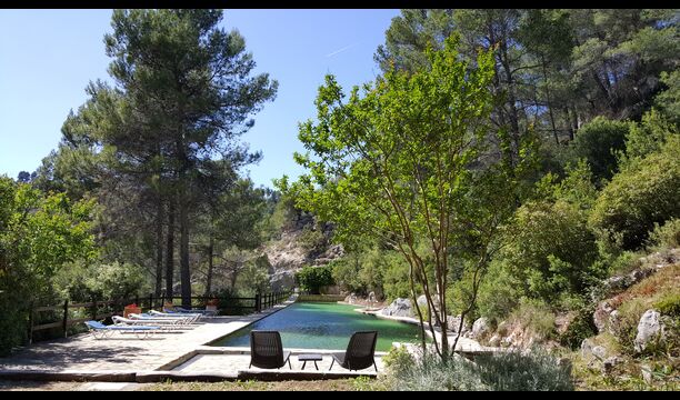 L'ambient exterior és difícil de descriure amb paraules, ja que la ubicació és molt especial. La cascada aporta frescor i les roques que l'envolten donen molts racons ombrívols i una sensació de ser un amb la natura. Els sistemes de canals utilitzats per dirigir l'aigua per crear l'energia per al molí d'aigua, s'han conduït de manera intel·ligent a piscina, on aquesta aigua neta, just de la fonta pocs quilòmetres de la casa, passa per la piscina de 45m de llargada, i després cap al riu de nou a l'altre extrem. També pots nedar sota la cascada i diferents llocs del riu.