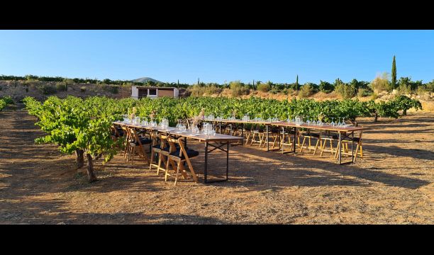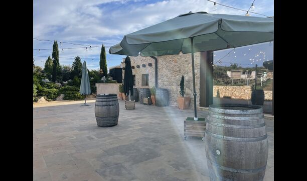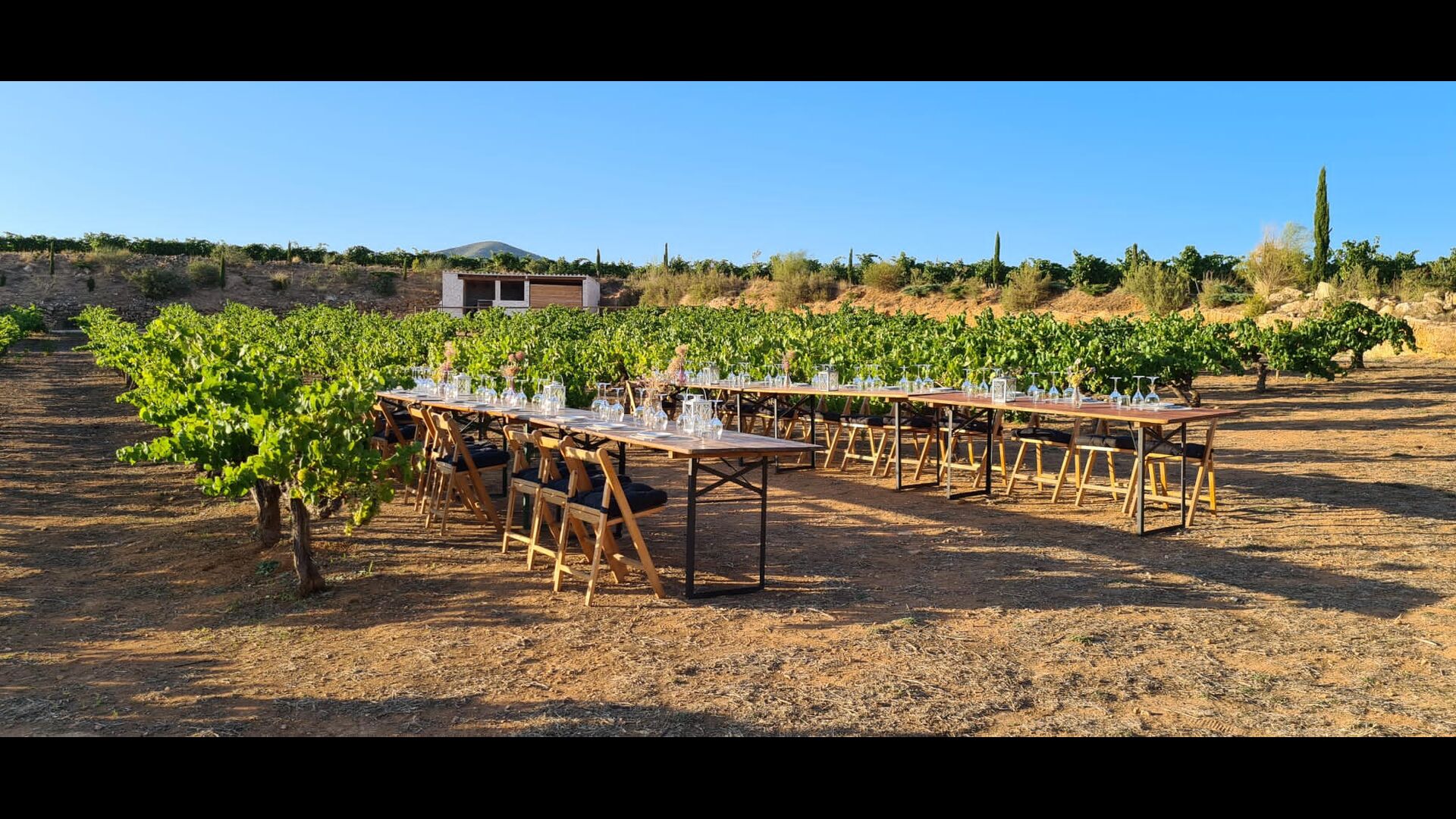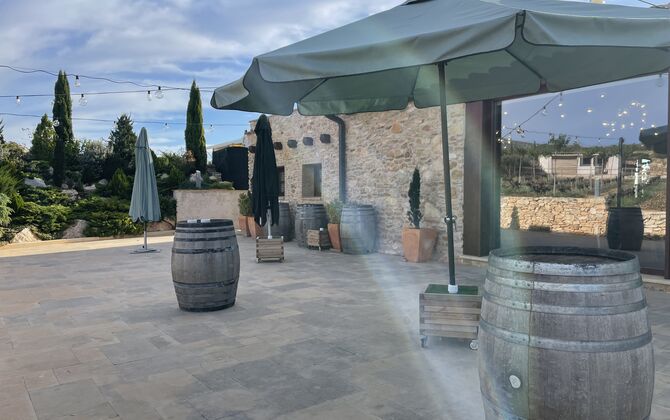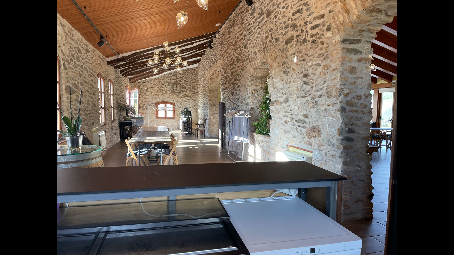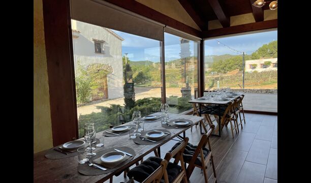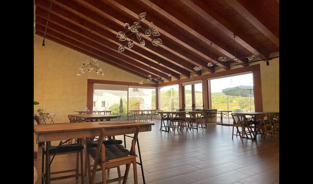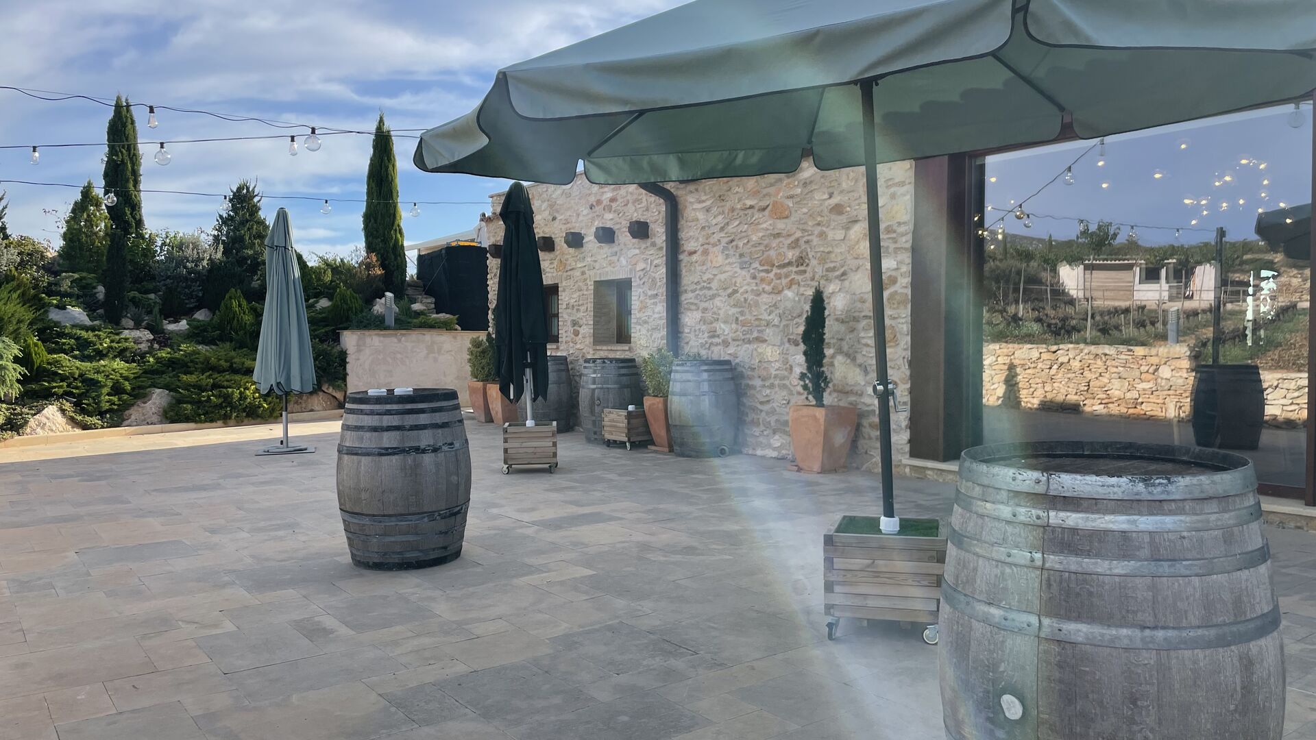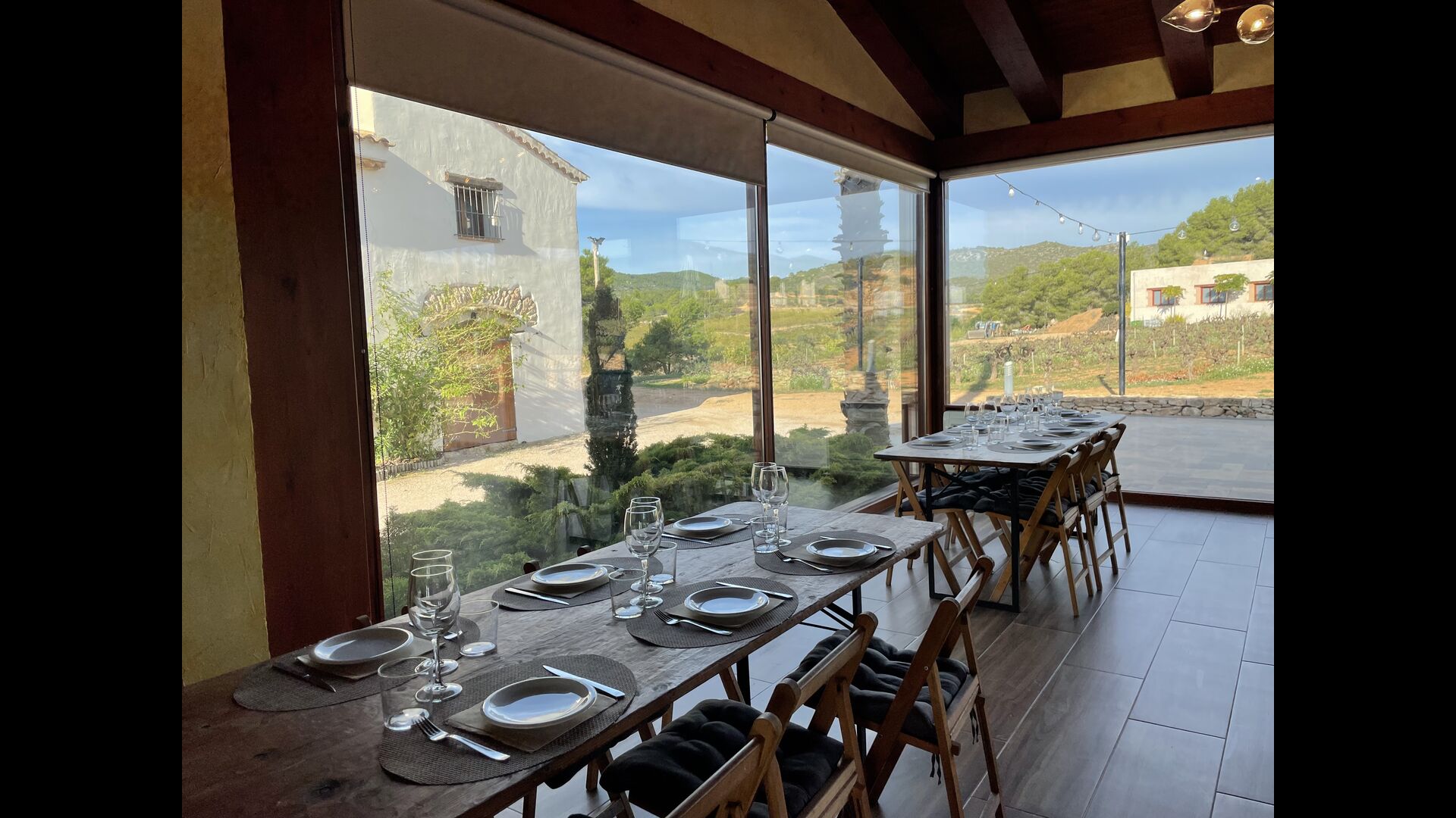 Es troba just davant de les vinyes de Cristina i Pere, i sovint,l'esdeveniment es trasllada a l'exterior a la terrassa o fins i tot a les vinyes. A l'interior, els grans finestrals panoràmics proporcionen la catifa perfecta per a la vostra celebració, amb vistes a les vinyes i a la posta de sol.