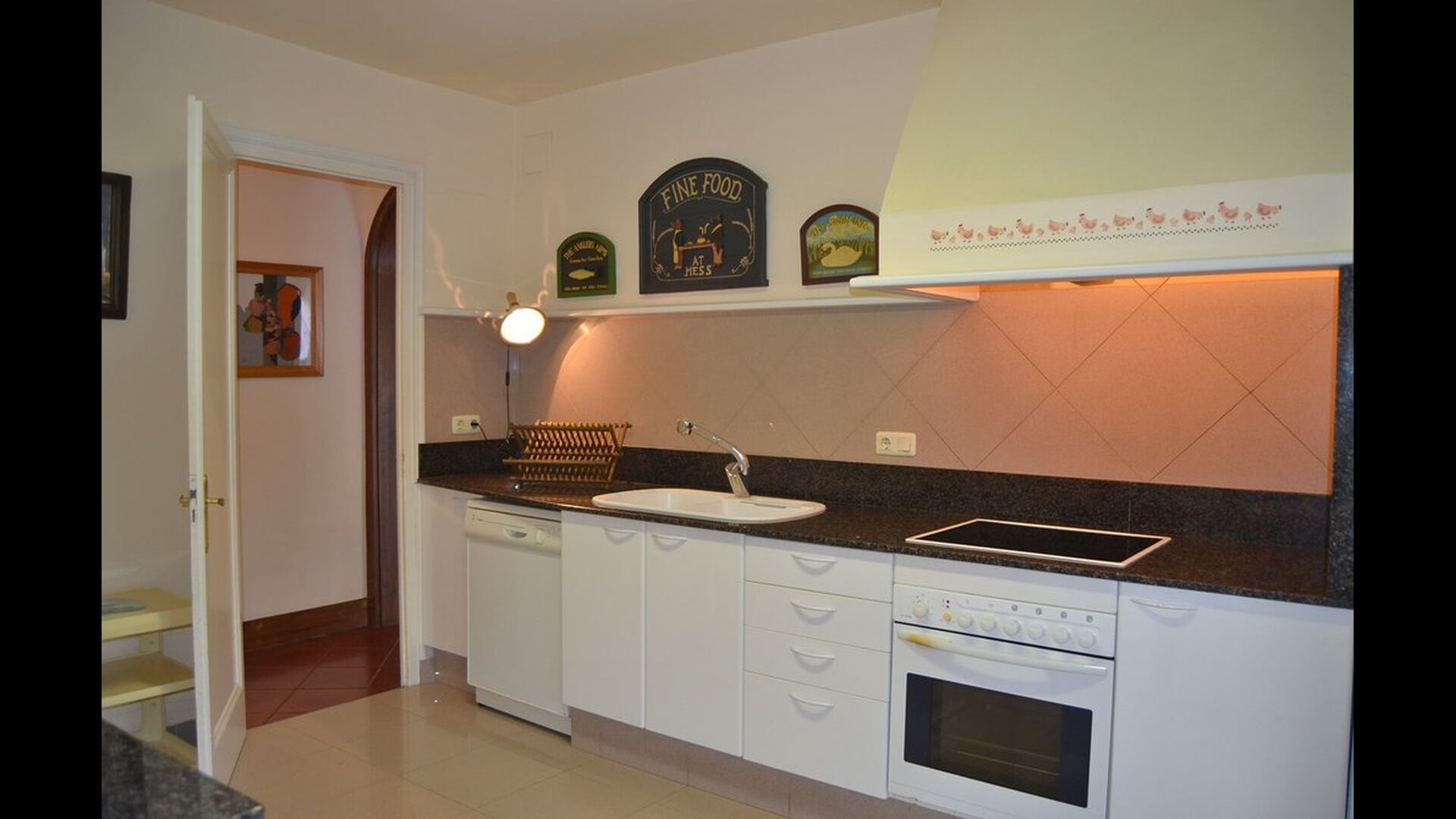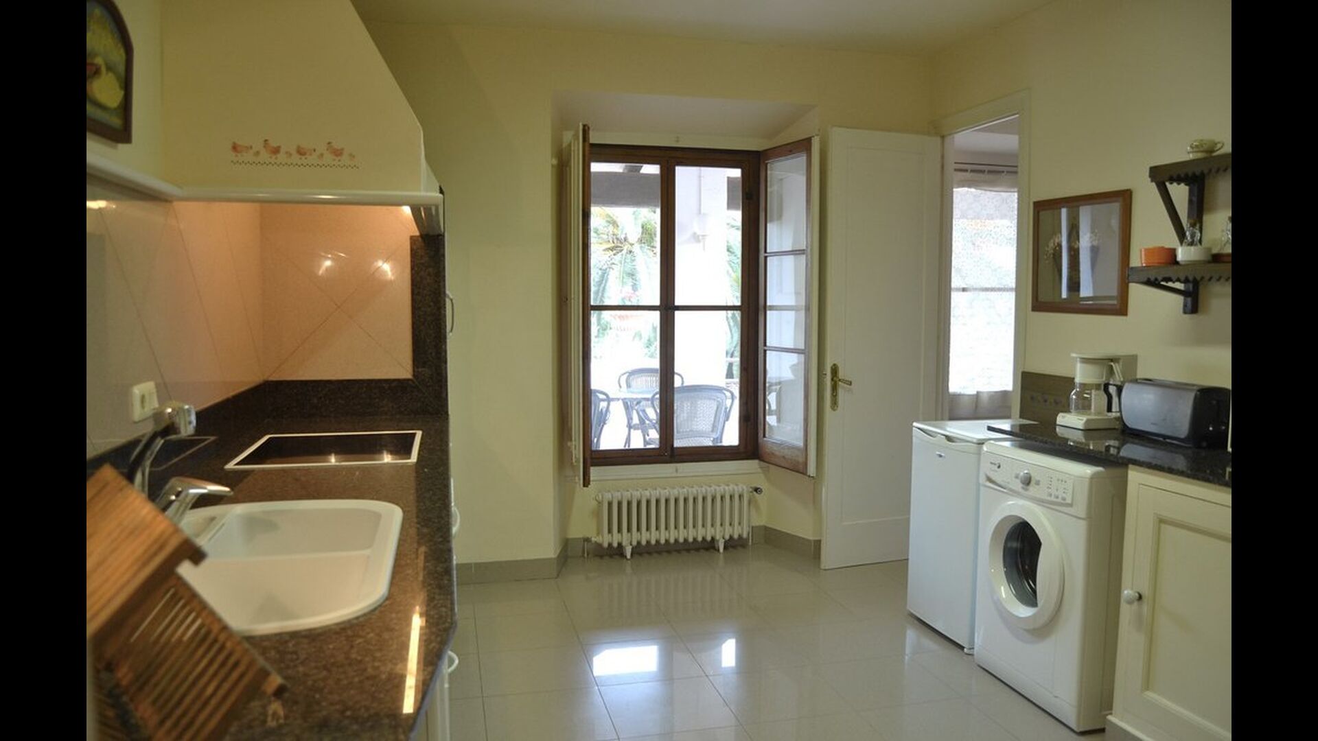 Also on this floor, there is a well-equipped kitchen with stove, ceramic hotplates, dishwasher, washing machine, coffee maker, toaster, micro wave, kitchen utensils freezer and fridge.