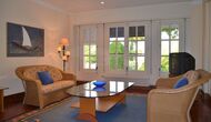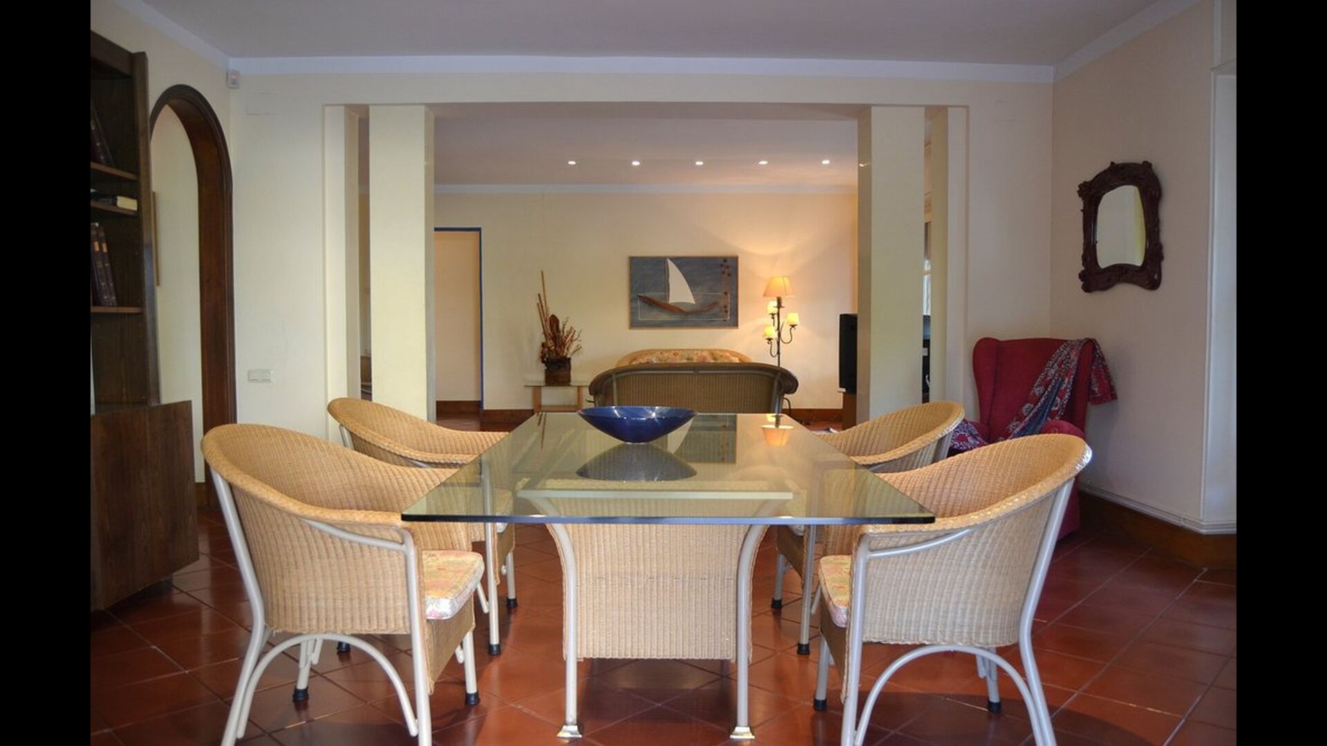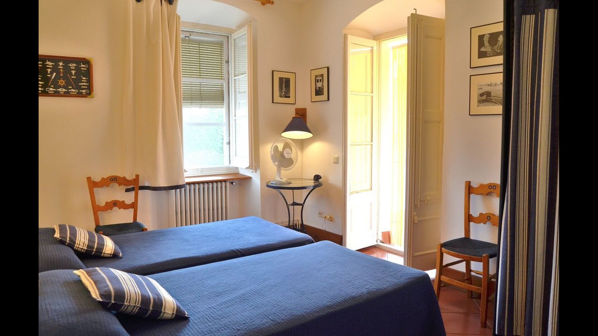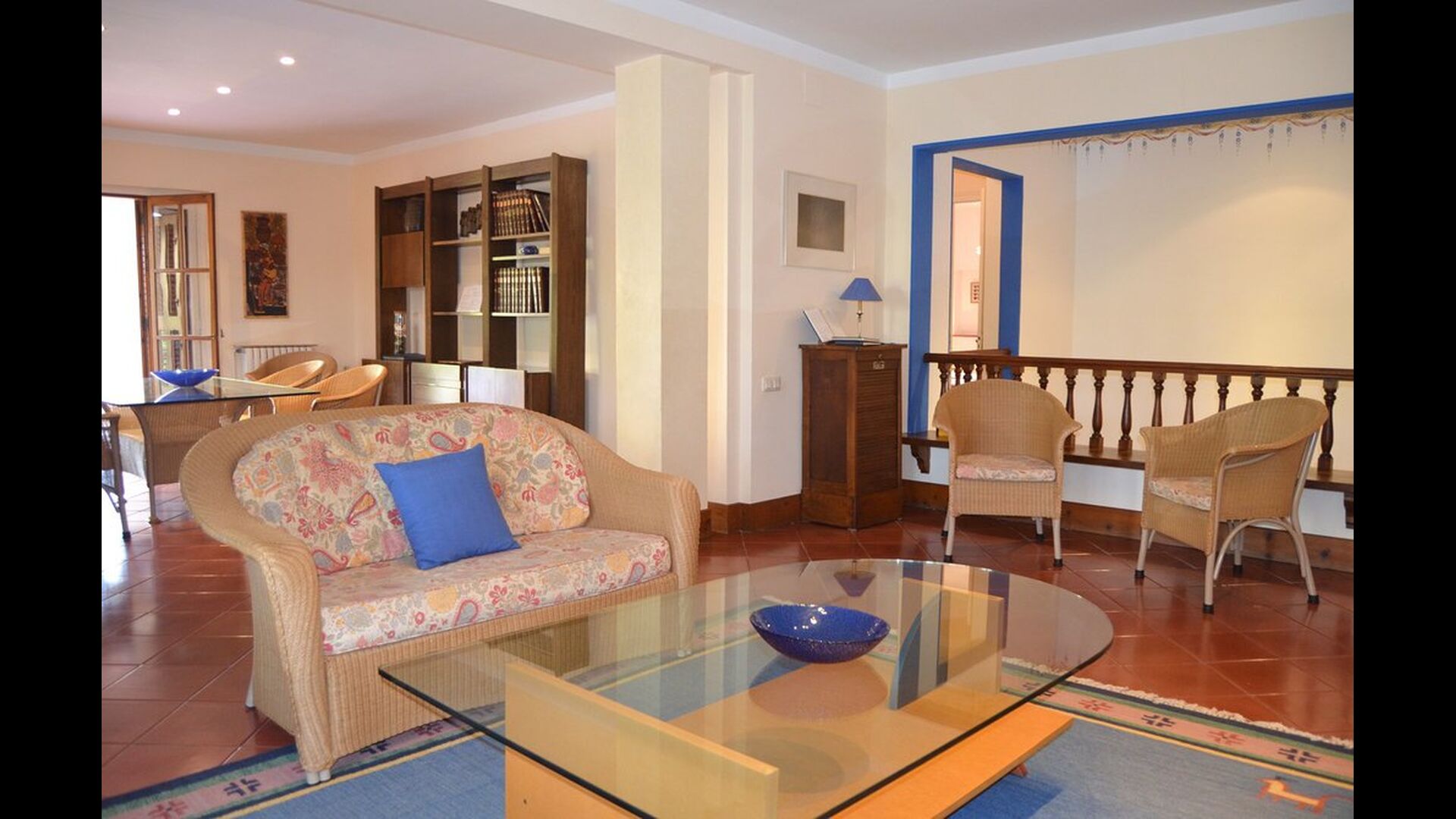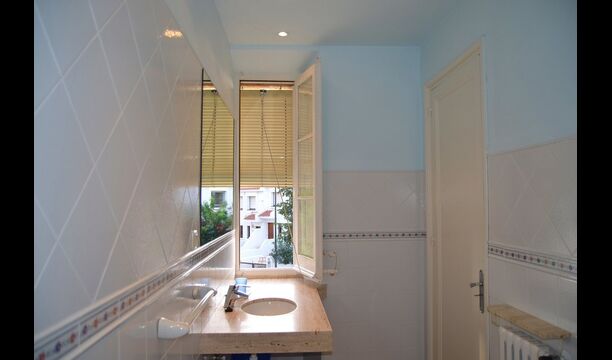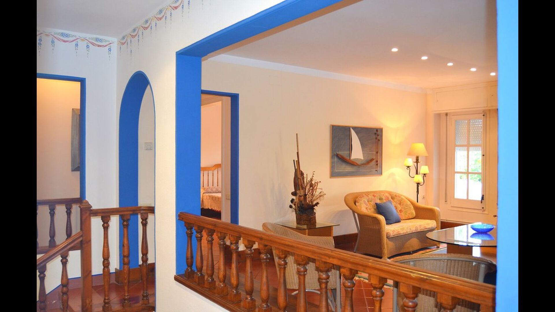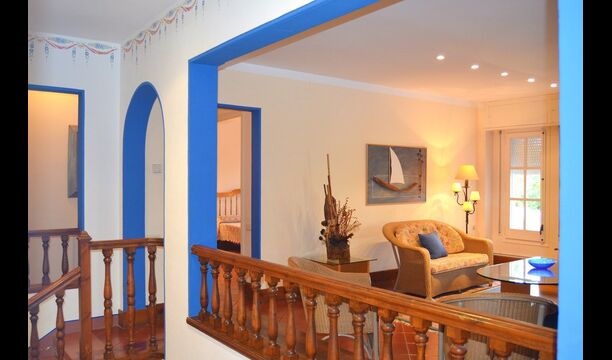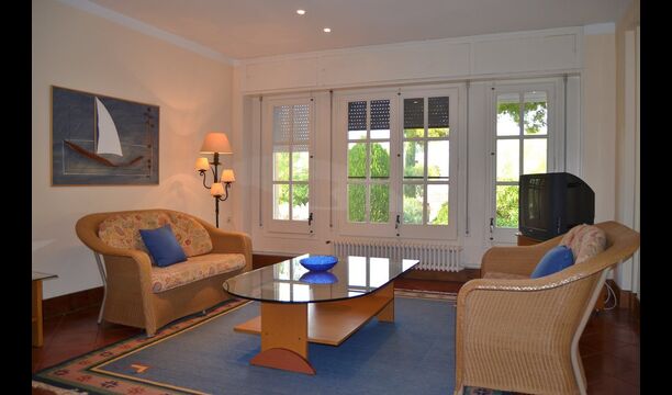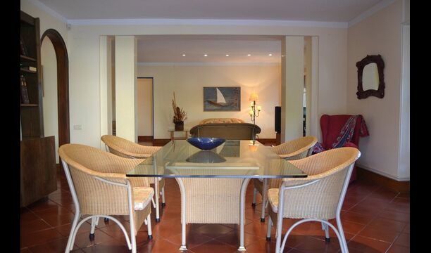 The rest of the floor is a very large common area decorated in maritime style with a lounge area with TV and DVD and a dining area with a large dining table. From here, you can access the huge first floor terrace with a table for outside dining and a beautiful view. As the edge is not so high, we do not recommend this house to families with smaller children.